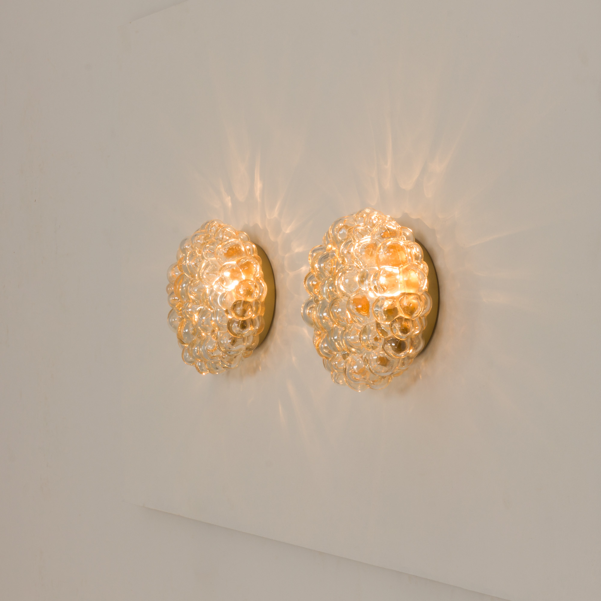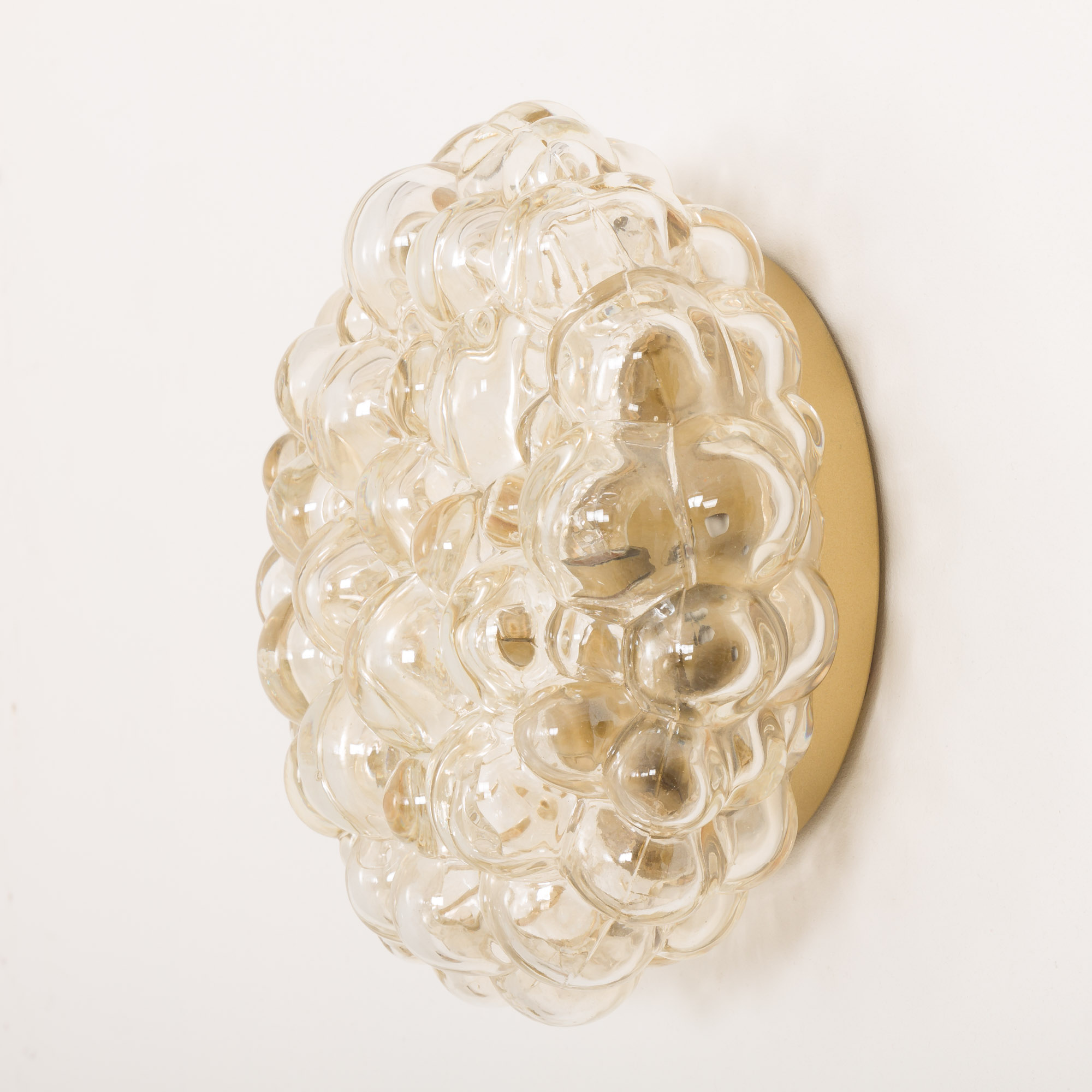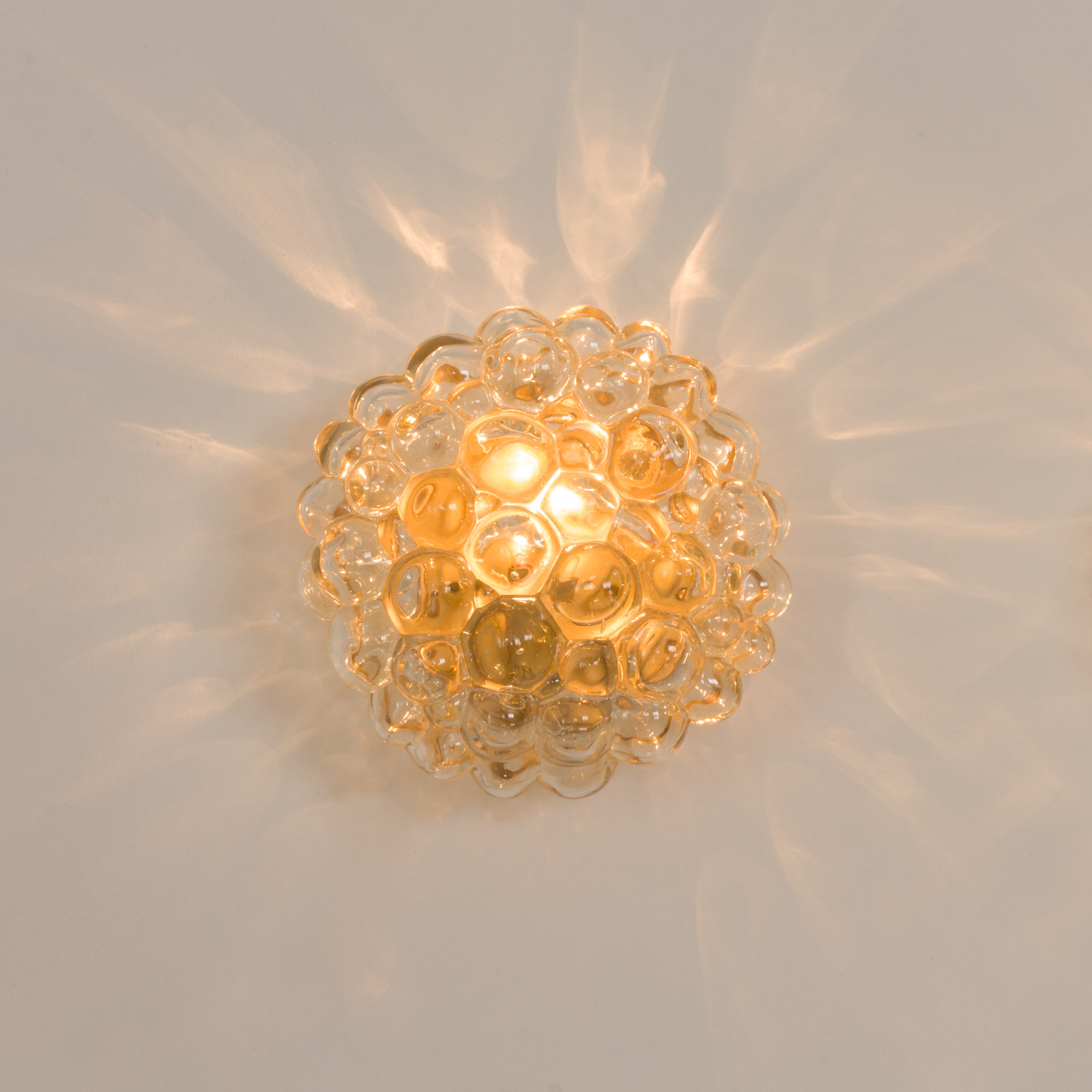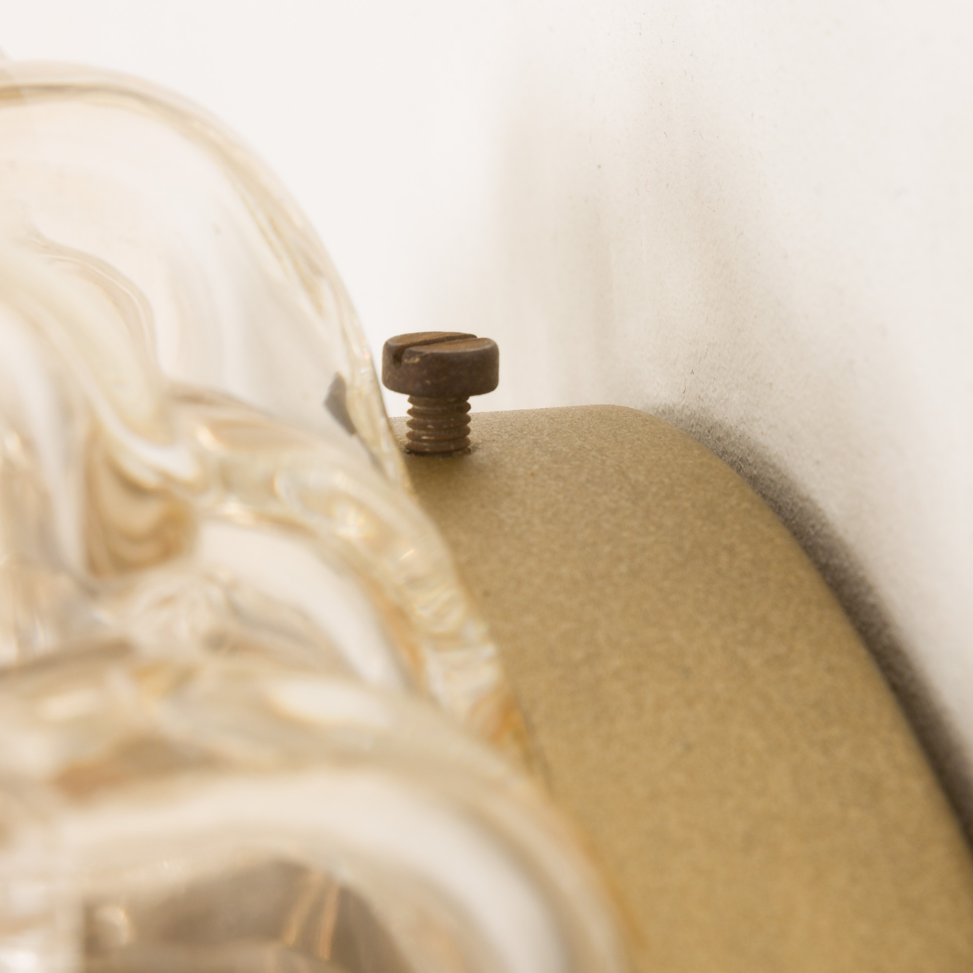Każda lampa wykonana jest z ręcznie dmuchanego, lekko zabarwionego grubego szkła, co świadczy o wysokim poziomie rzemiosła. Kinkiety mają zaokrąglony, pokryty bąbelkami szklany front zamontowany na prostej, pomalowanej na złoty kolor metalowej podstawie.