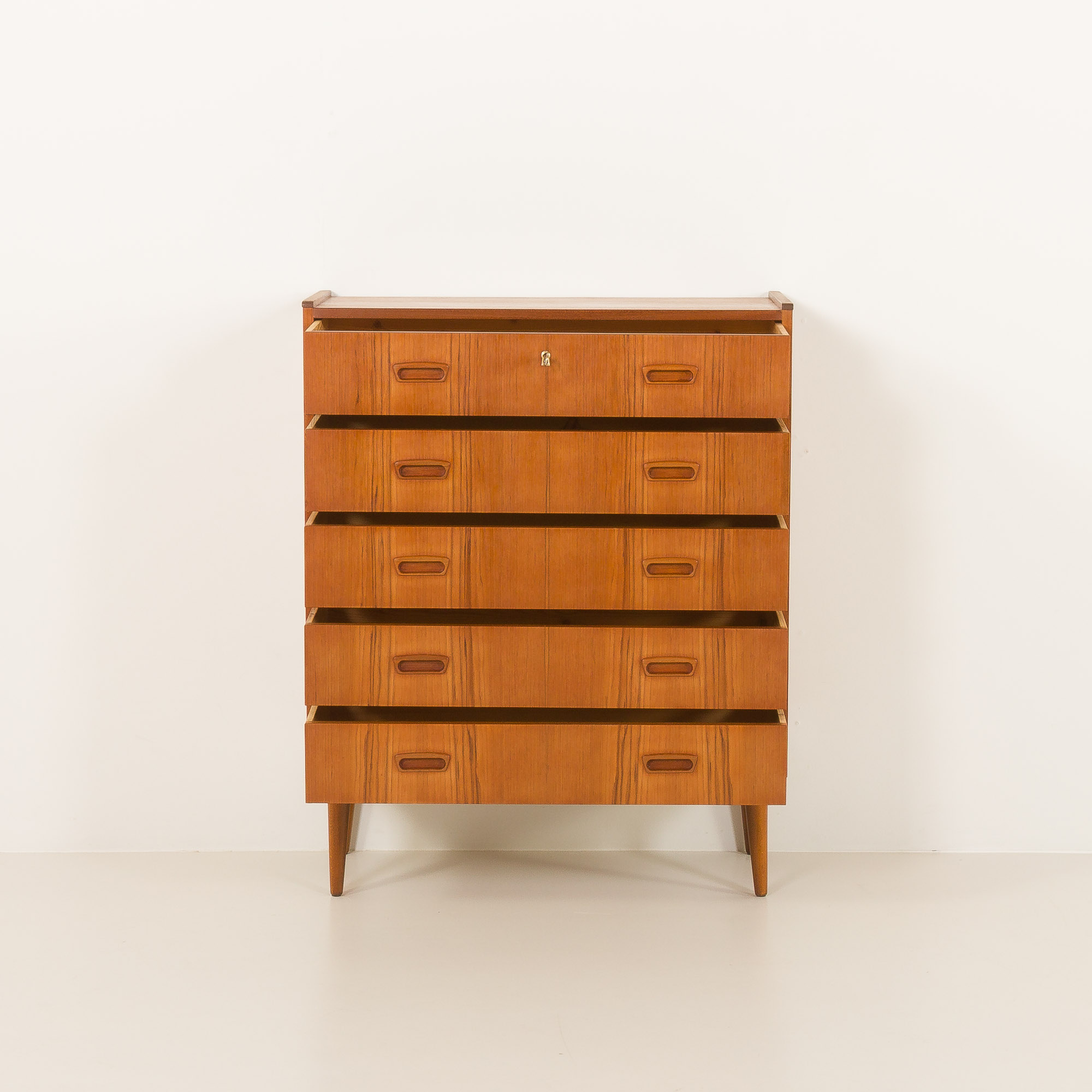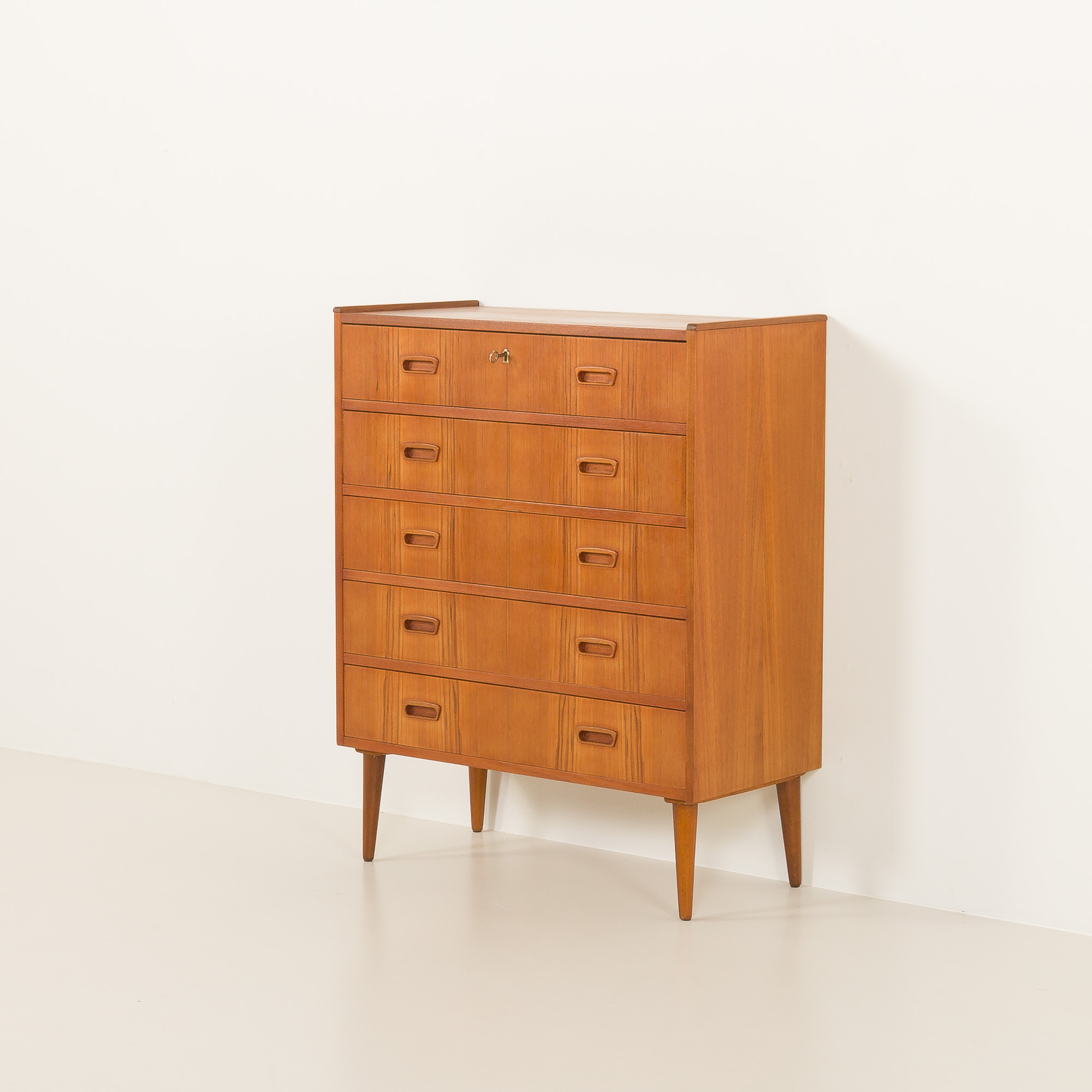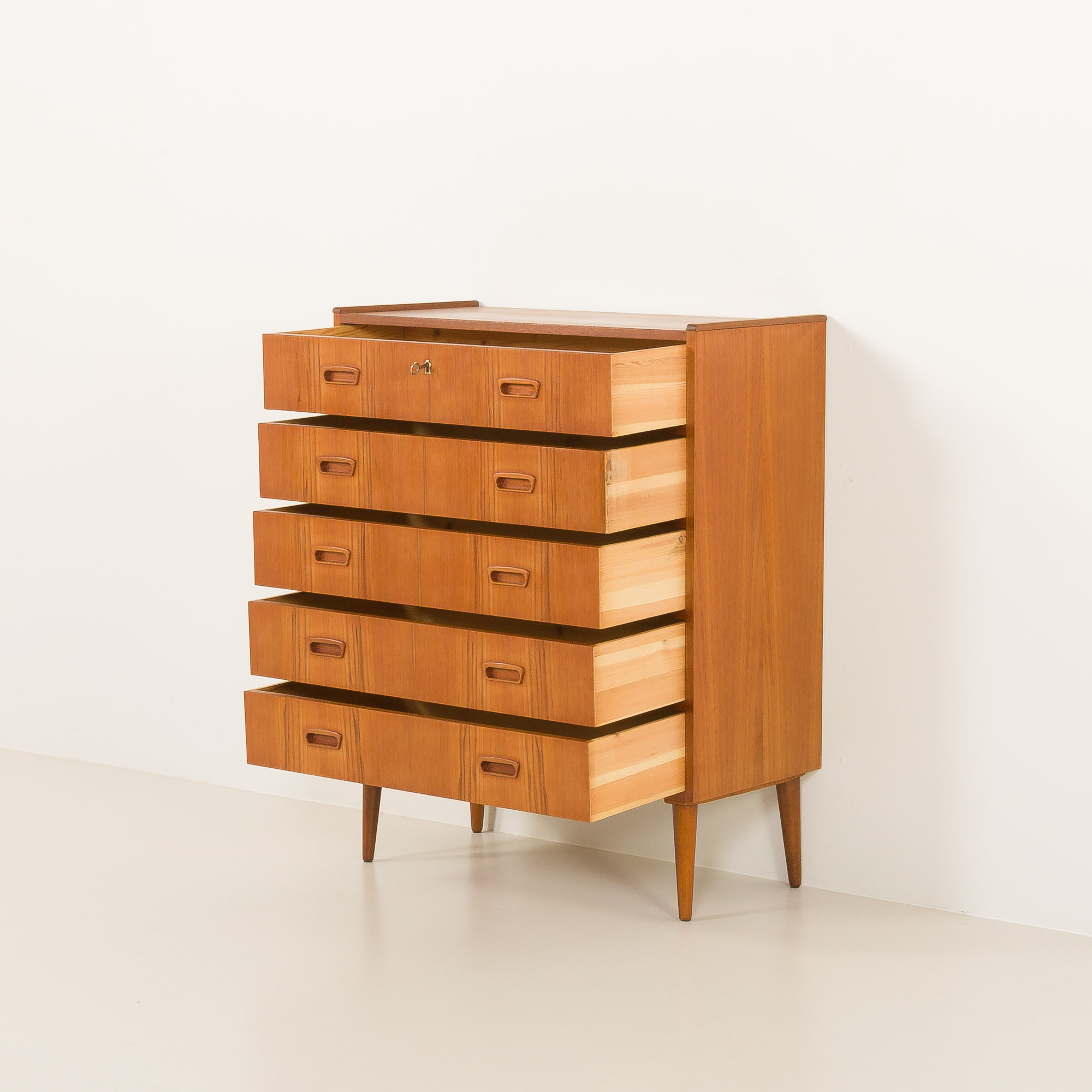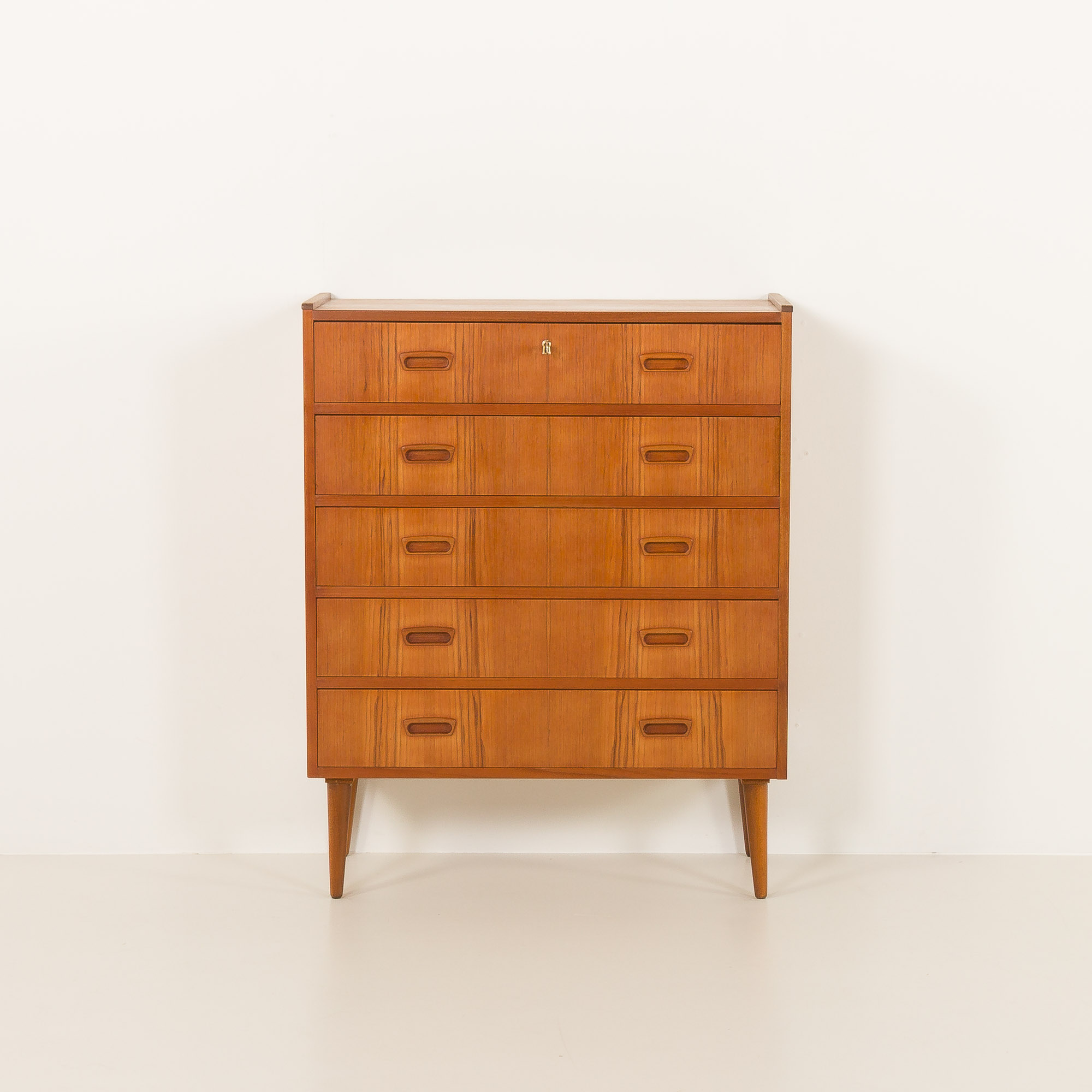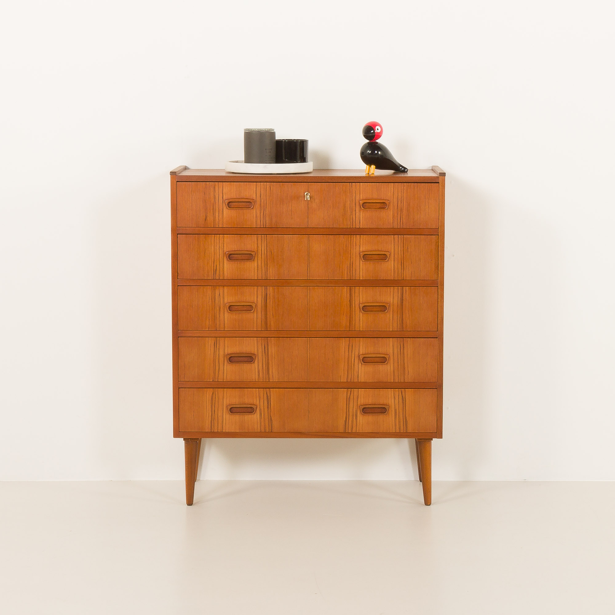 Kwintesencja minimalizmu i skandynawskiej prostoty - klasyczna komoda z drewna tekowego z pięcioma szufladami wykonana w latach 60-tych.