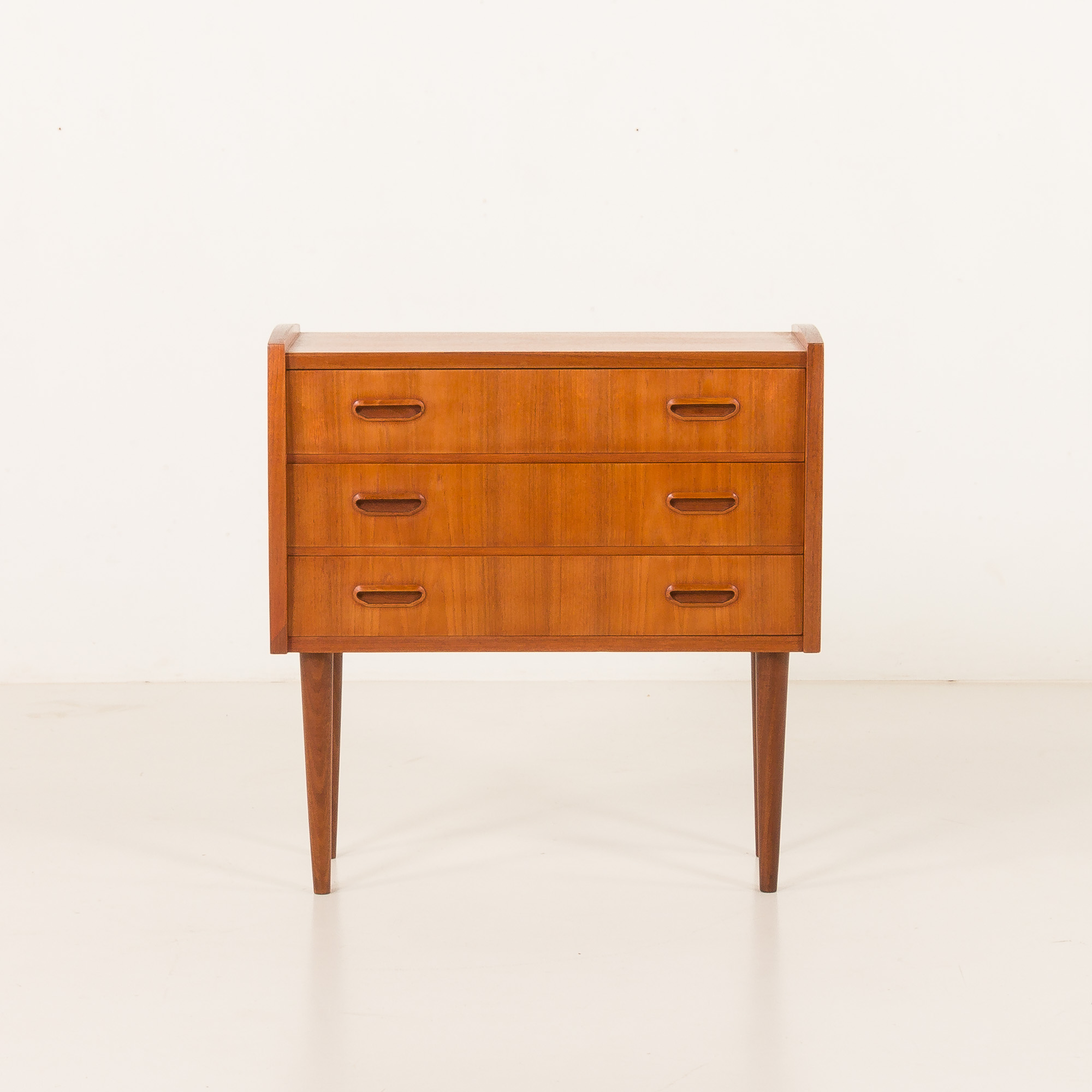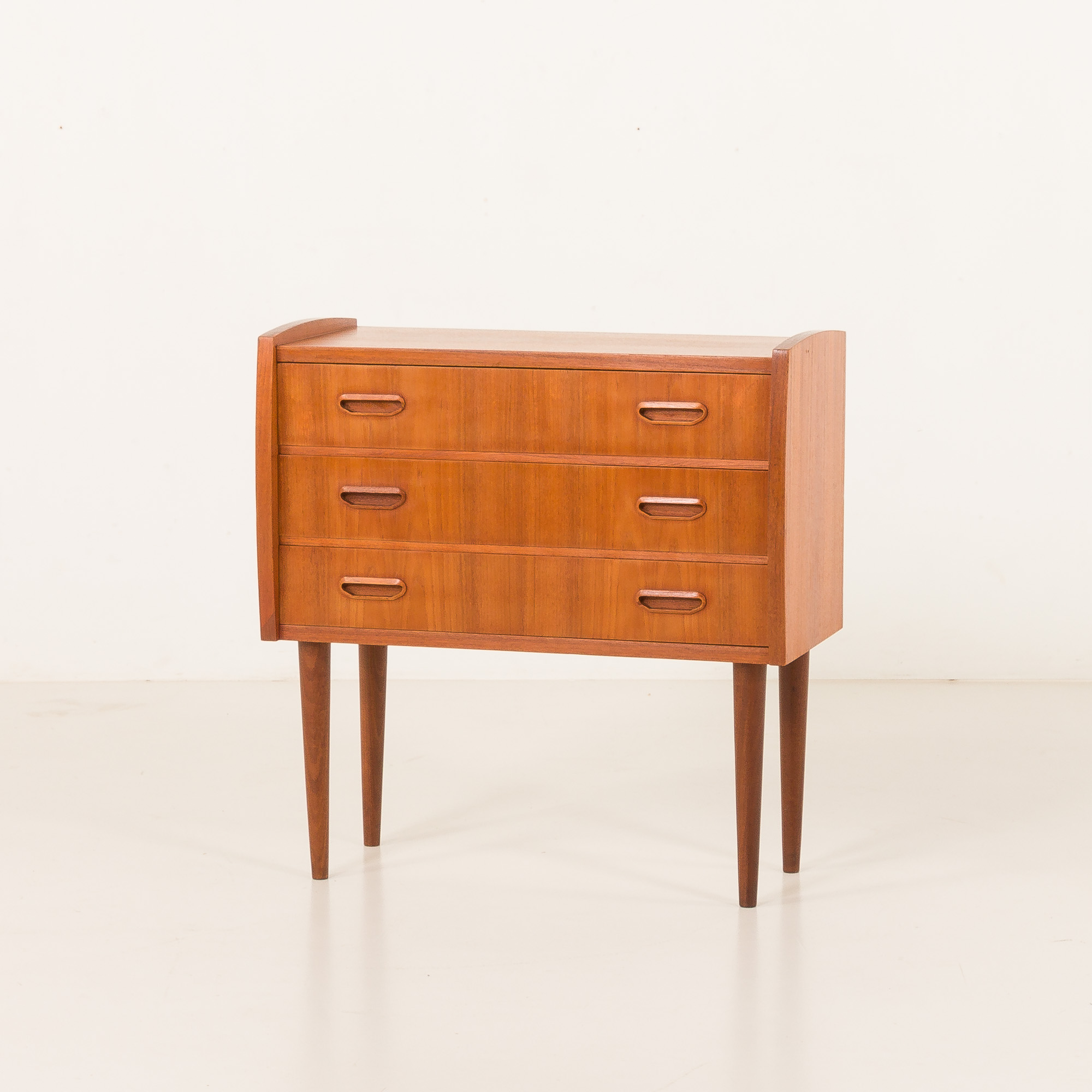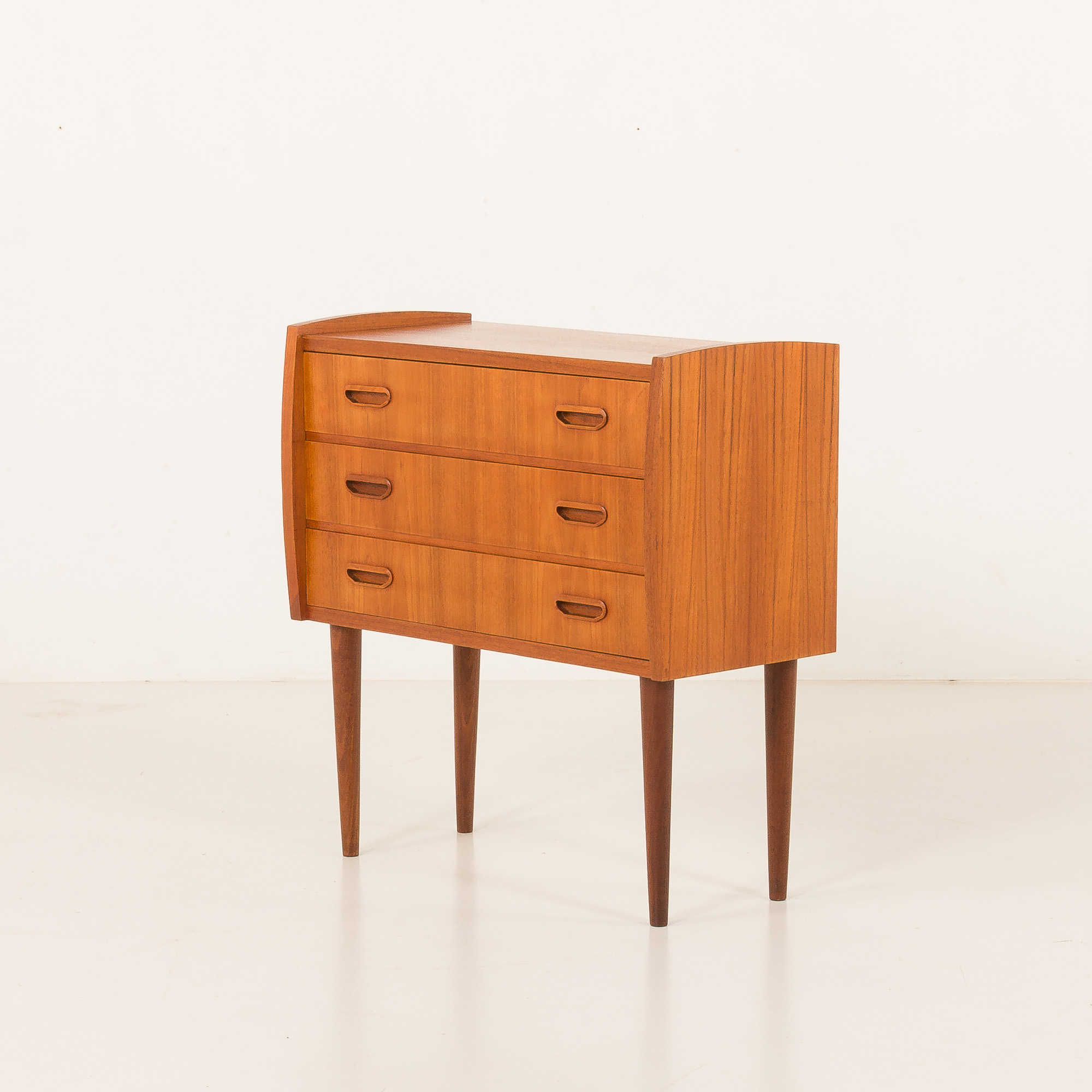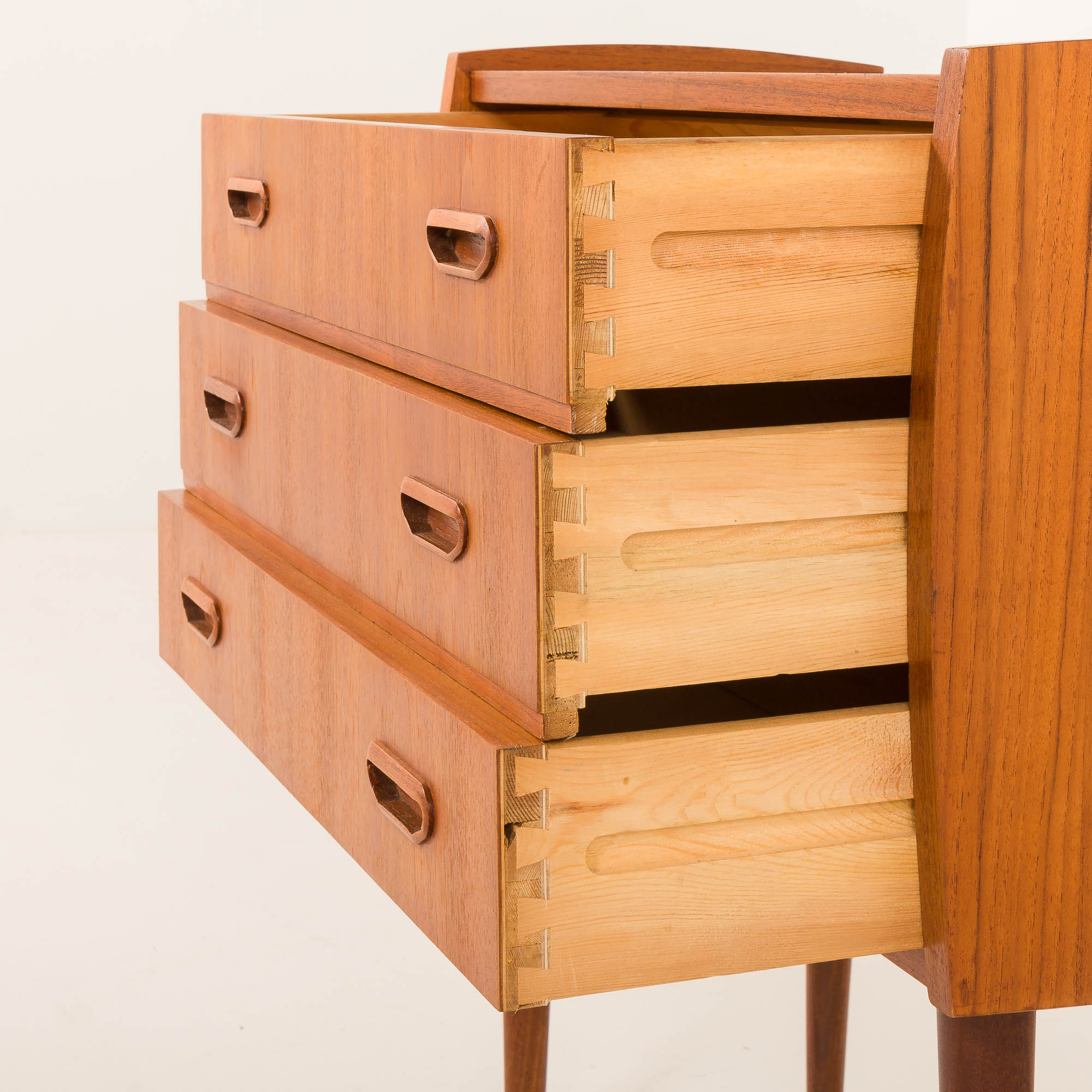 Komoda posiada trzy szuflady ozdobione rzeźbionymi uchwytami z litego drewna tekowego, płynnie zintegrowanymi z frontami. Te ręcznie profilowane uchwyty są nie tylko piękne, ale też ergonomiczne, podkreślając mistrzostwo duńskiego rzemiosła.