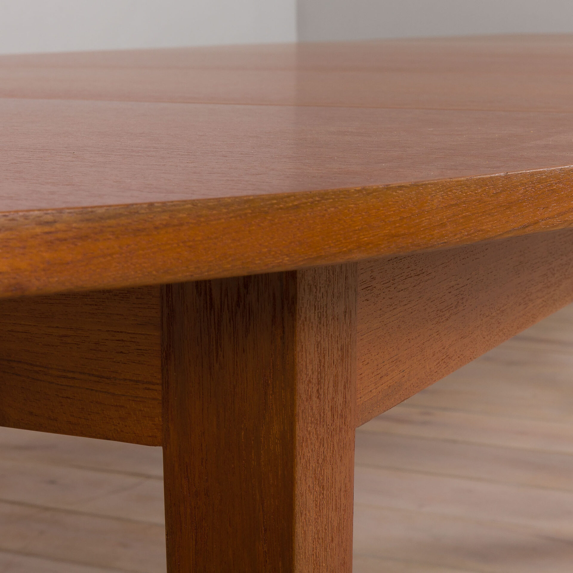 Efektowny tekowy stół wielorozkładany duńskiego producenta - CJ Rosengaarden pochodzi z lat 60-tych. Nadruk producenta zachowany na prowadnicach. Pięć liści (każdy o szerokości 60 cm) pozwala na rozłożenie go do imponujących 460 cm, wystarczająco długich, by pomieścić cały rodzinny obiad! Mechanizm rozkładania działa sprawnie, ale ze względu na rozmiary stołu do jego obsługi potrzebne są dwie osoby. Wspaniale prezentuje klasyczną duńską stolarkę z okresu połowy wieku.