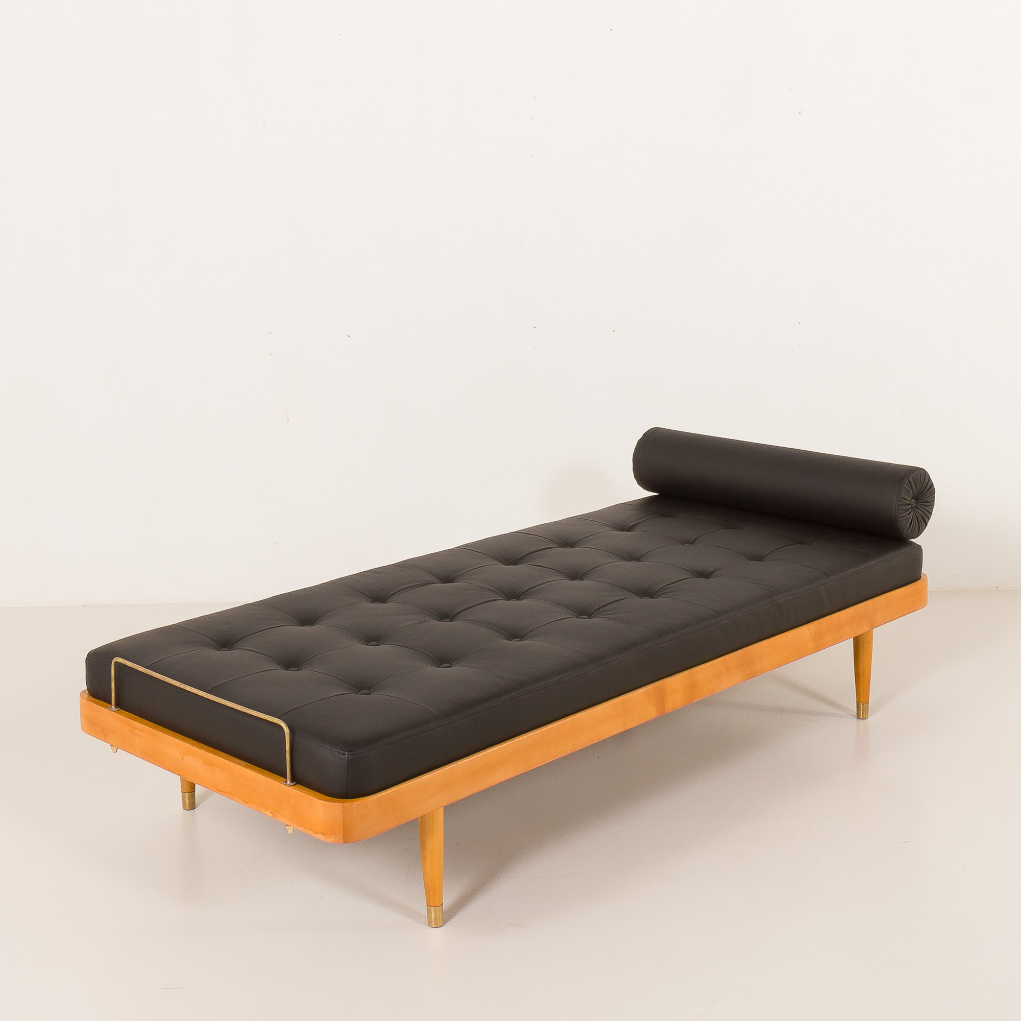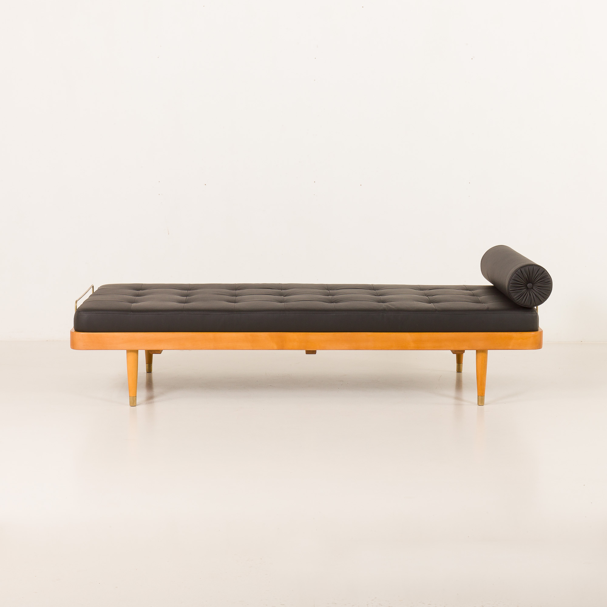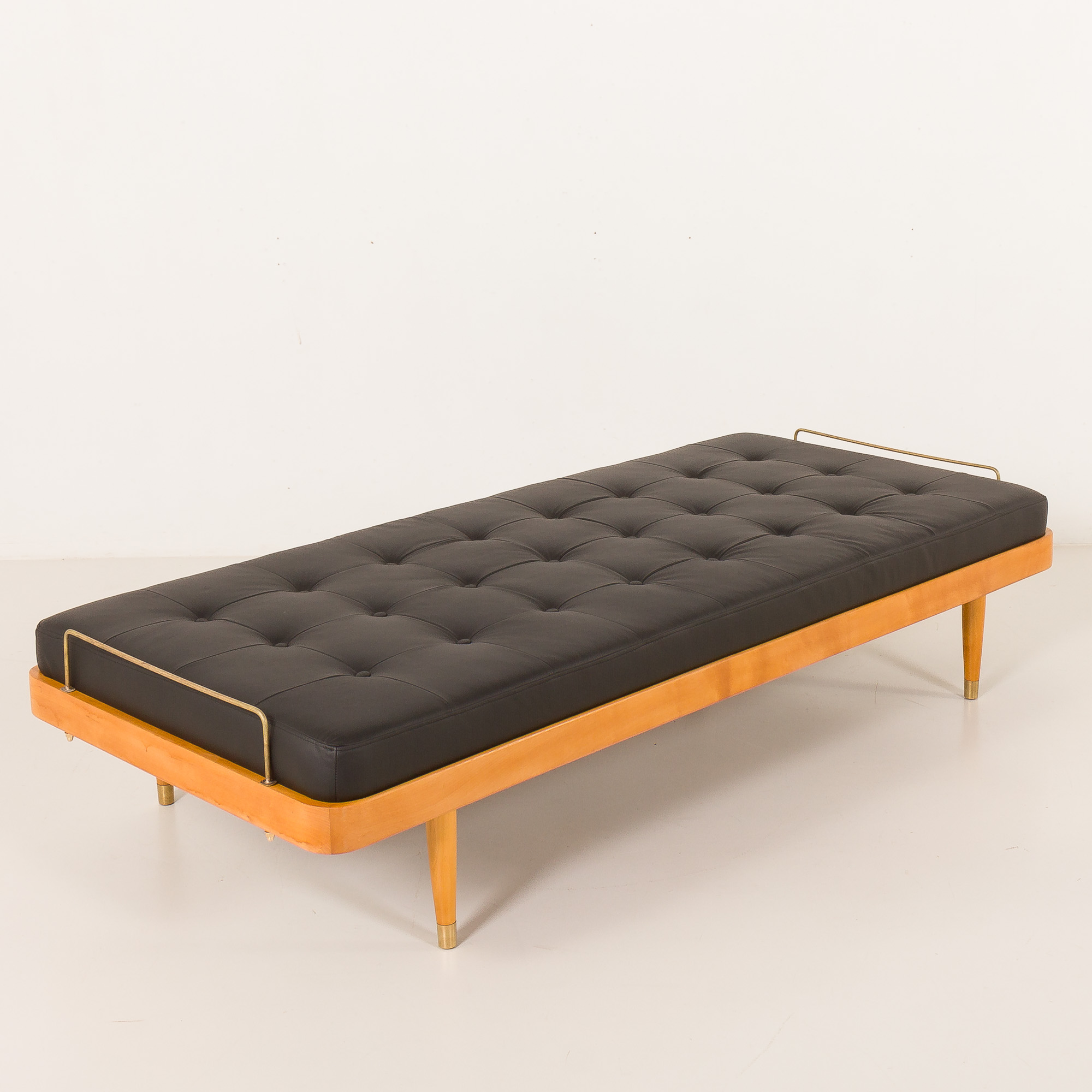 Leżanka stoi na nogach z litego drewna, wykończonych polerowanymi mosiężnymi końcówkami, i wyposażona jest w mosiężne ograniczniki materaca, które subtelnie dekorują, a jednocześnie zwiększają funkcjonalność. Mebel łączy w sobie komfort, kunszt wykonania i ponadczasową estetykę – dzięki czemu stanowi efektowny dodatek zarówno do nowoczesnych, jak i inspirowanych stylem vintage wnętrz.