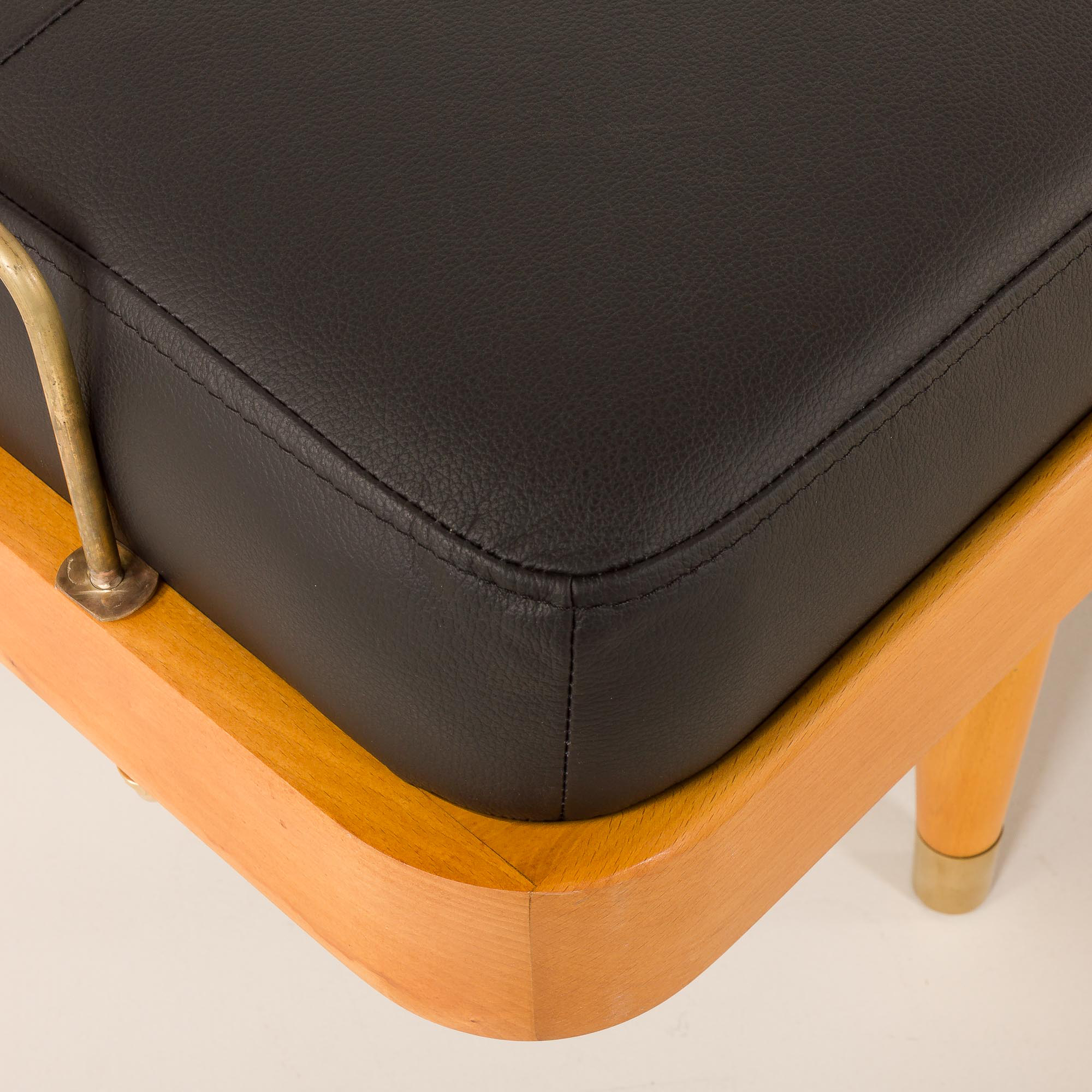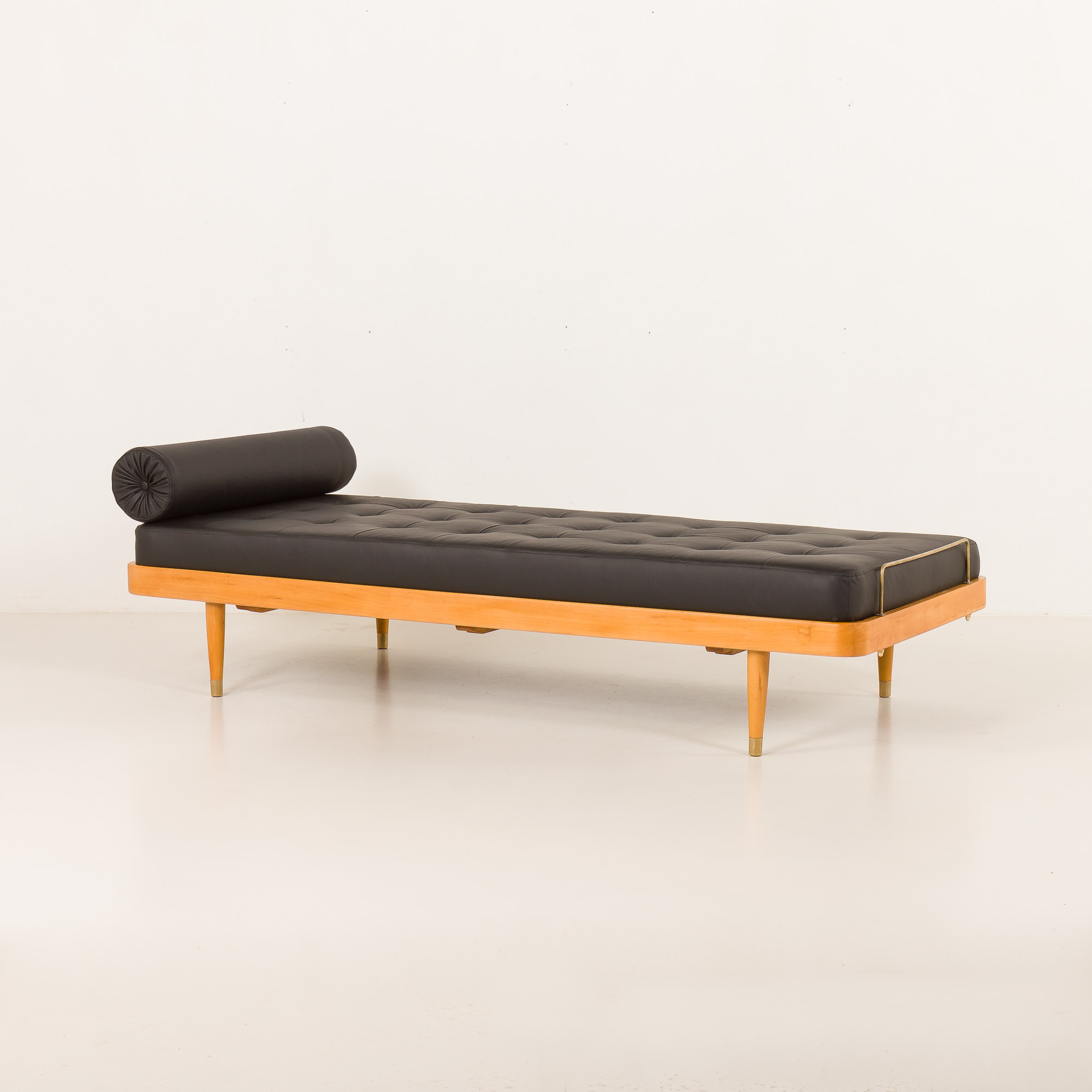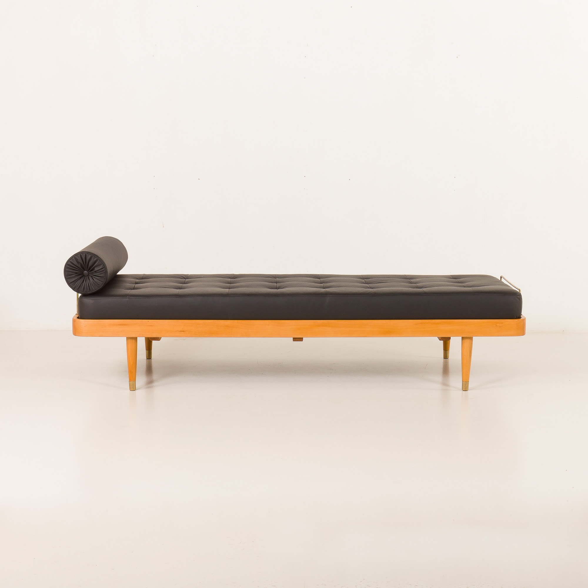 Leżanka stoi na nogach z litego drewna, wykończonych polerowanymi mosiężnymi końcówkami, i wyposażona jest w mosiężne ograniczniki materaca, które subtelnie dekorują, a jednocześnie zwiększają funkcjonalność. Mebel łączy w sobie komfort, kunszt wykonania i ponadczasową estetykę – dzięki czemu stanowi efektowny dodatek zarówno do nowoczesnych, jak i inspirowanych stylem vintage wnętrz.