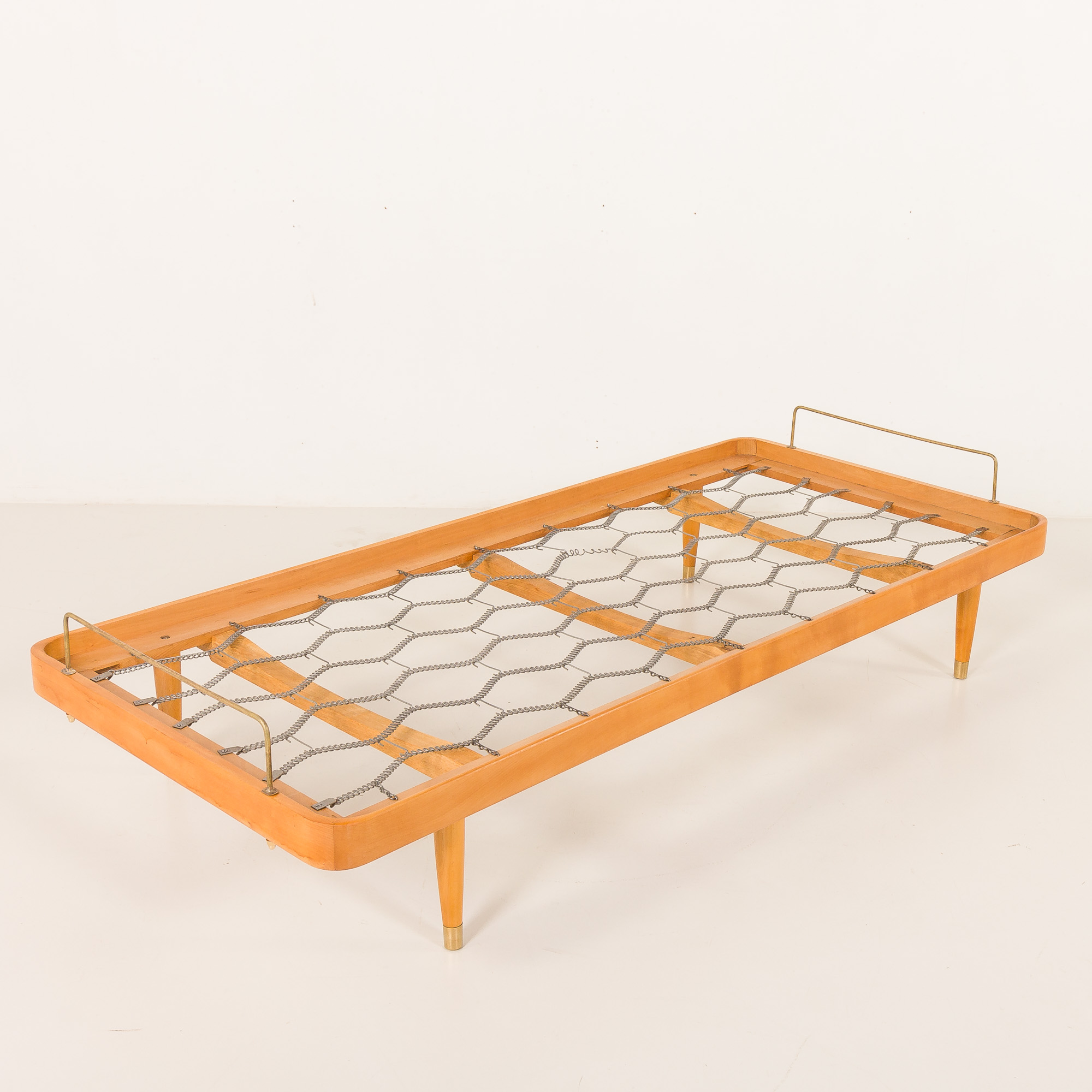 Wszystkie mosiężne elementy zostały starannie wypolerowane, a drewniana rama oczyszczona. Łóżko jest w bardzo dobrym, oryginalnym stanie. Nogi można zdemontować w celu ułatwienia transportu. Leżanka pozostaje w doskonałym, odrestaurowanym stanie z minimalnymi śladami użytkowania.