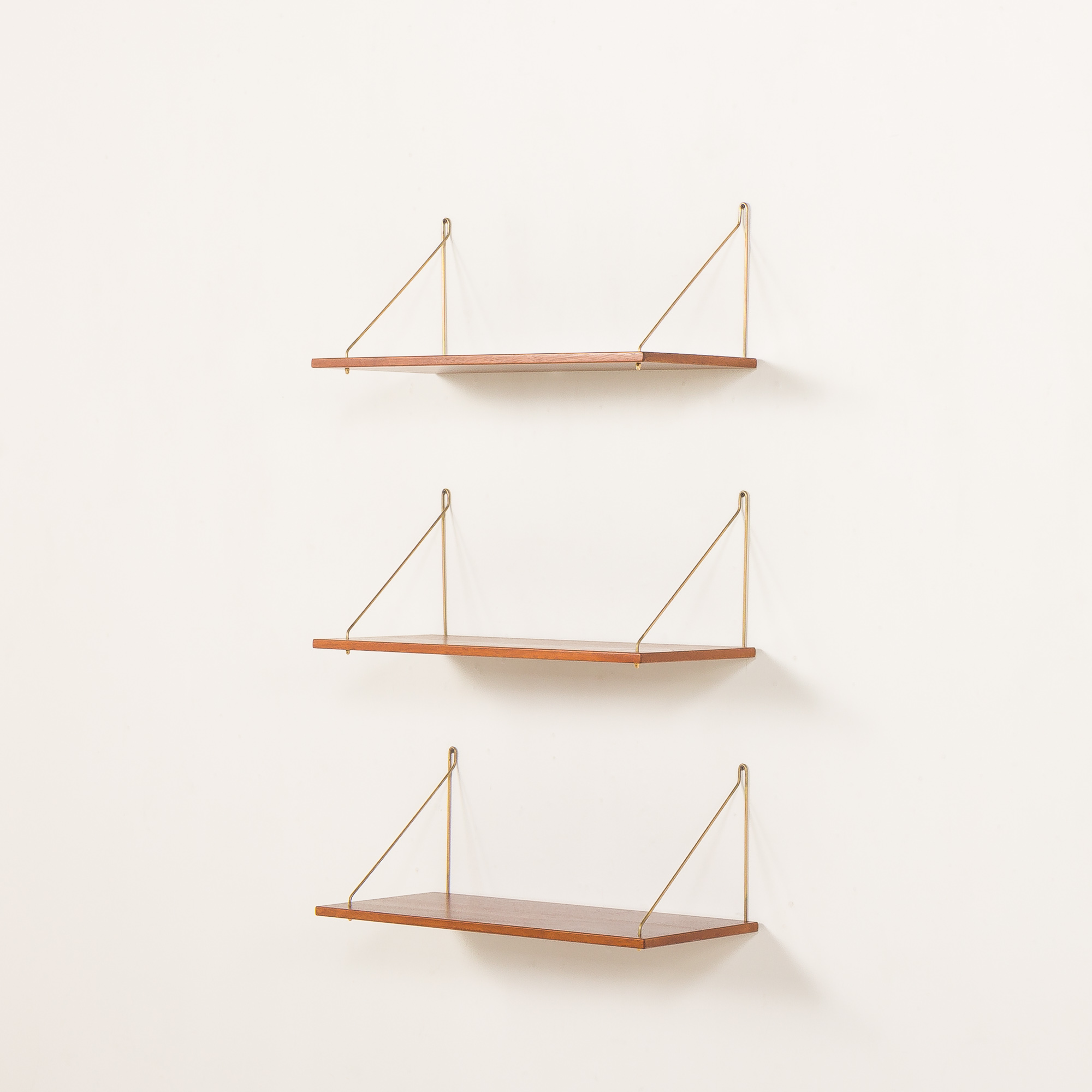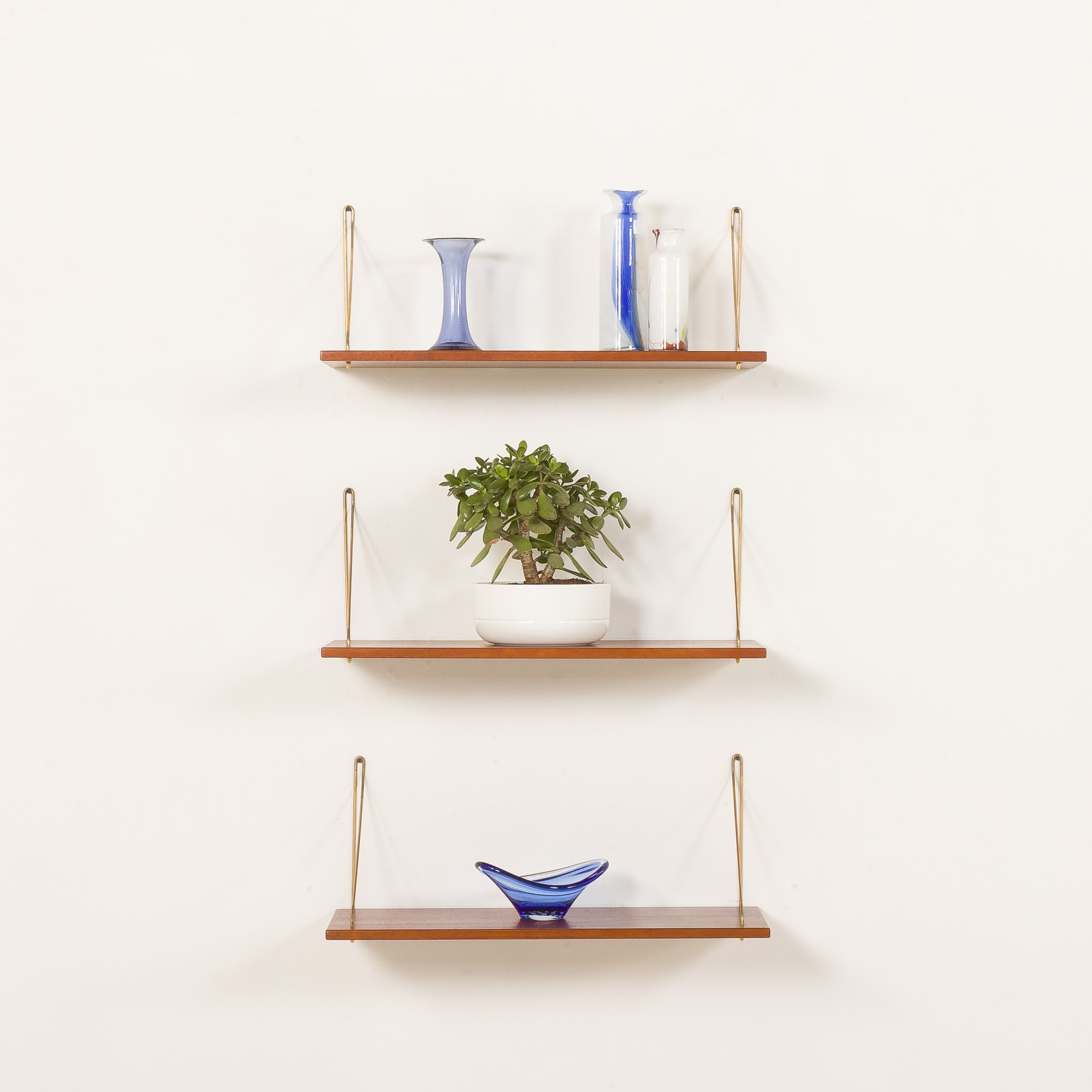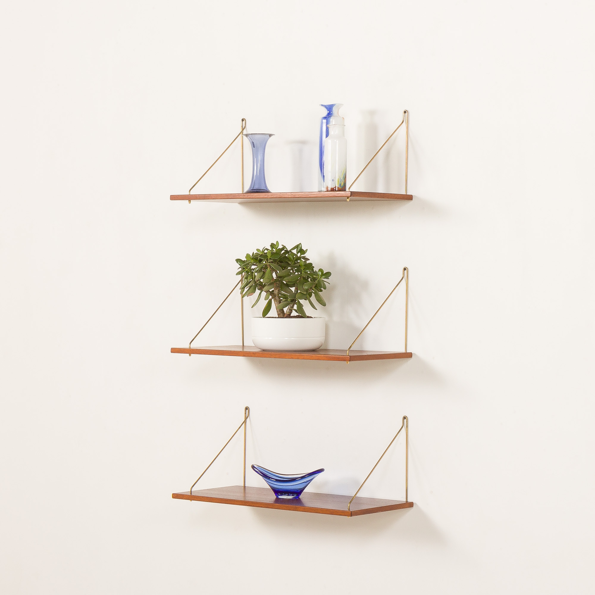Zestaw trzech wiszących półek, zaprojektowanych w Danii w latach 60., doskonale oddaje ponadczasową elegancję stylu mid-century modern. Wykonane z forniru tekowego i ozdobione oryginalnymi mosiężnymi zawieszkami, łączą w sobie starannie dobrane materiały, znakomite rzemiosło i minimalistyczne wzornictwo. Ciepły, brązowy odcień drewna tekowego podkreśla ich wizualny urok, a praktyczna głębokość 30 cm sprawia, że półki doskonale sprawdzą się jako miejsce do przechowywania lub ekspozycji ulubionych przedmiotów.