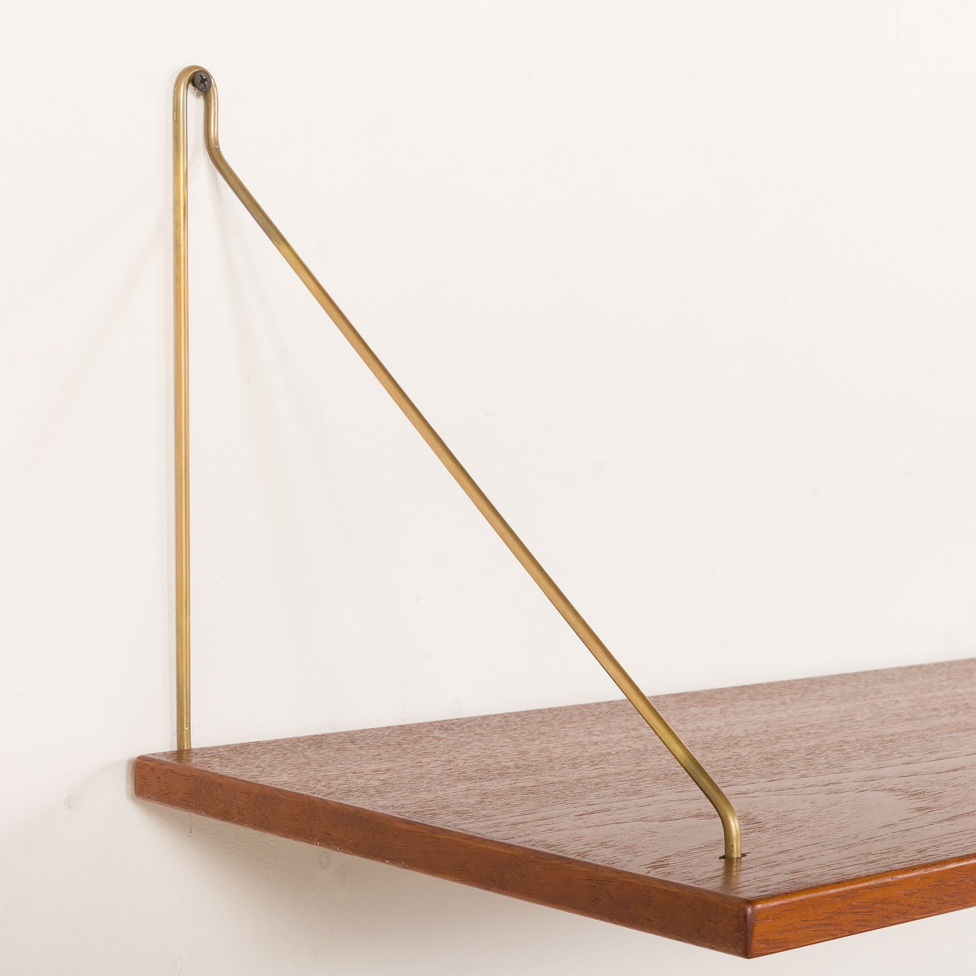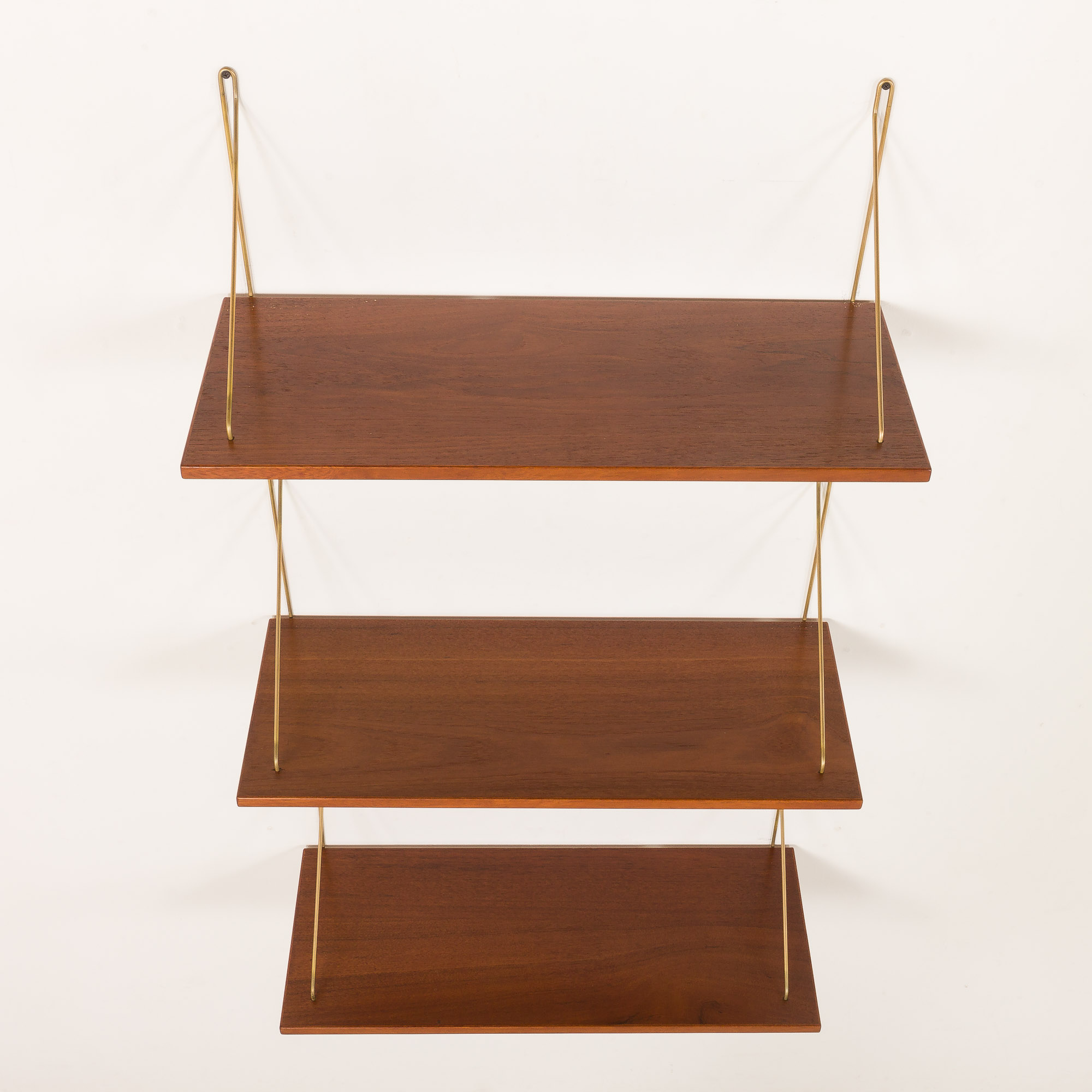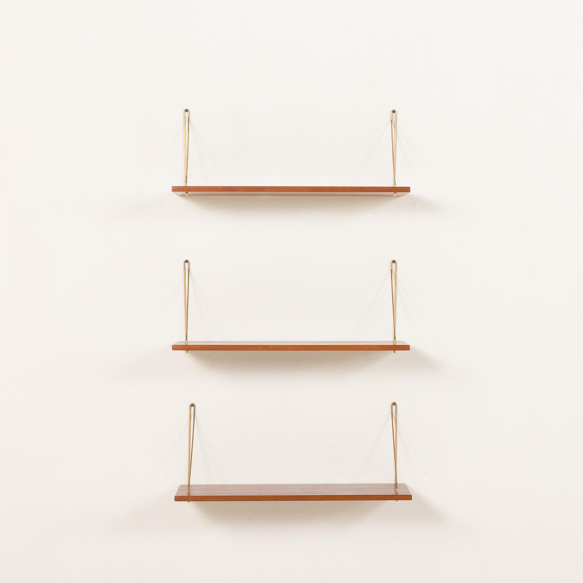 Zestaw trzech wiszących półek, zaprojektowanych w Danii w latach 60., doskonale oddaje ponadczasową elegancję stylu mid-century modern. Wykonane z forniru tekowego i ozdobione oryginalnymi mosiężnymi zawieszkami, łączą w sobie starannie dobrane materiały, znakomite rzemiosło i minimalistyczne wzornictwo. Ciepły, brązowy odcień drewna tekowego podkreśla ich wizualny urok, a praktyczna głębokość 30 cm sprawia, że półki doskonale sprawdzą się jako miejsce do przechowywania lub ekspozycji ulubionych przedmiotów.