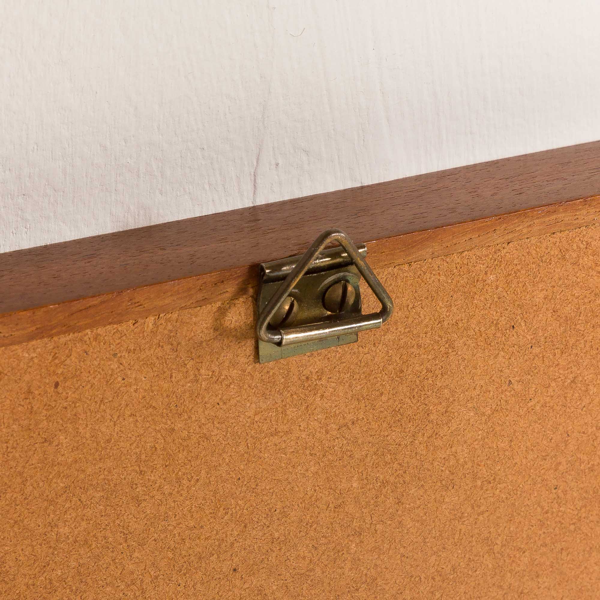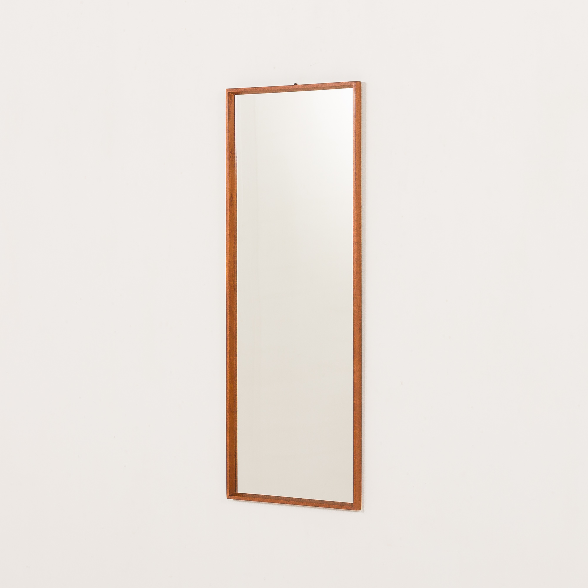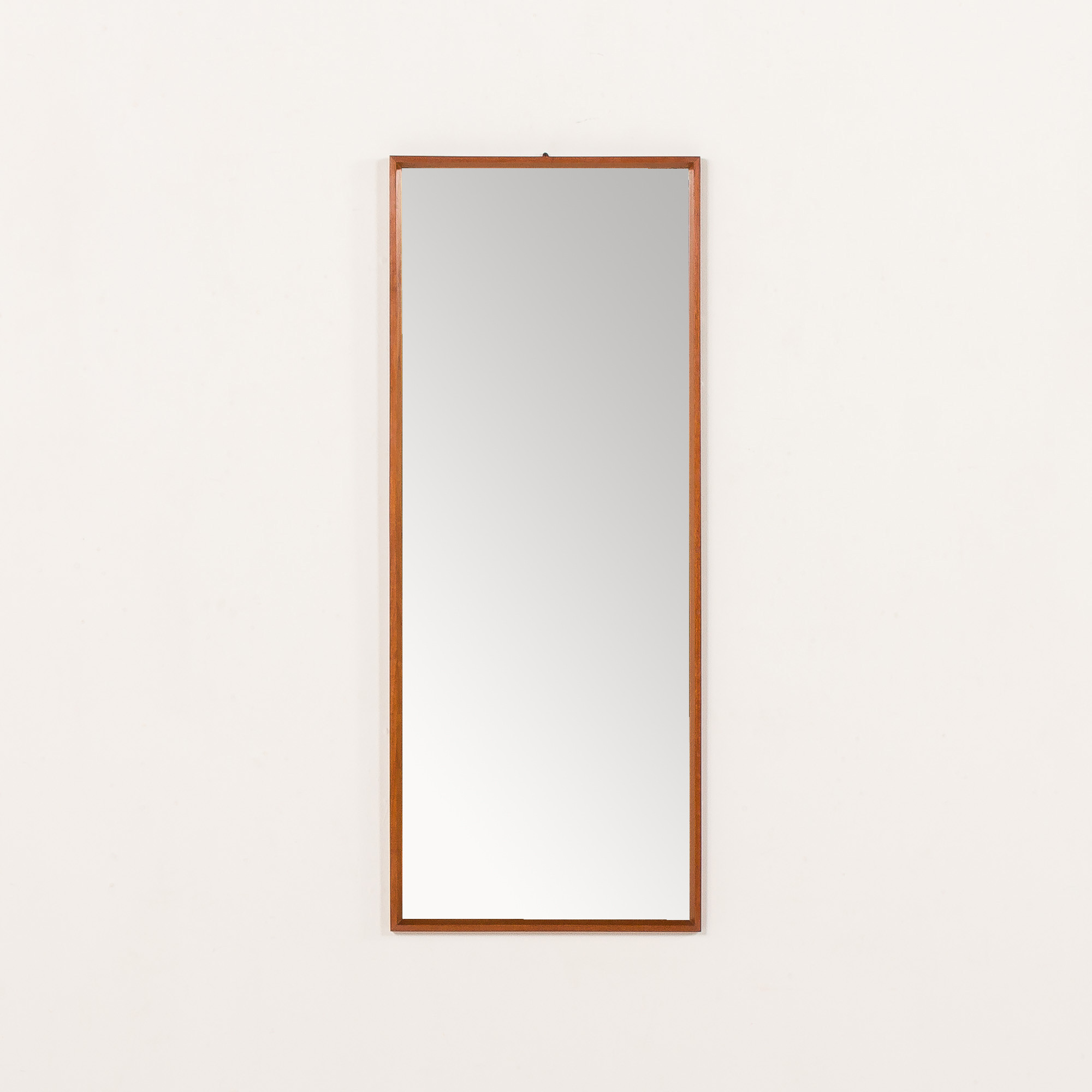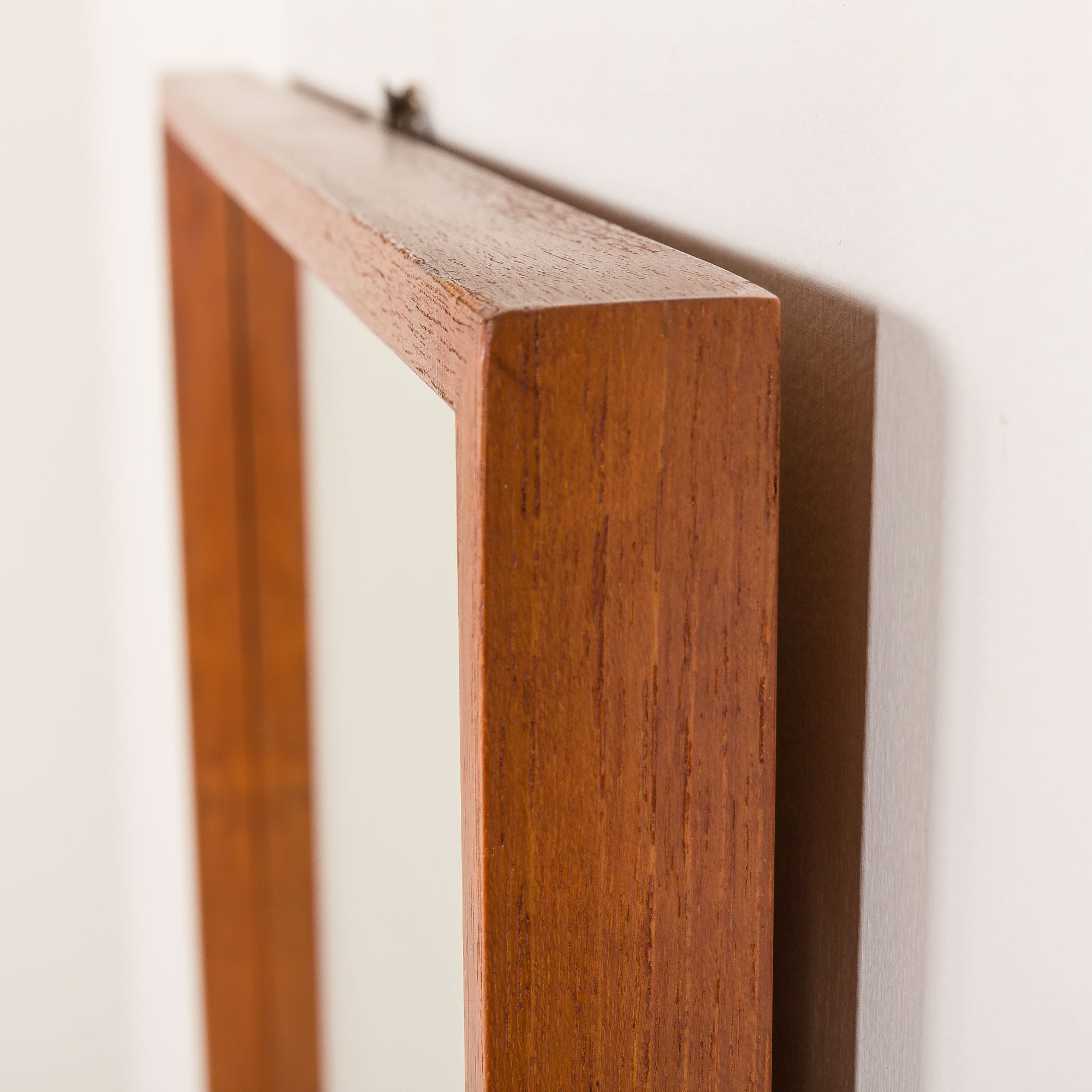 Duńskie lustro mid-century w prostokątnej ramie z litego drewna tekowego, datowane na lata 60., prezentuje typowy dla tego okresu modernistyczny wygląd.