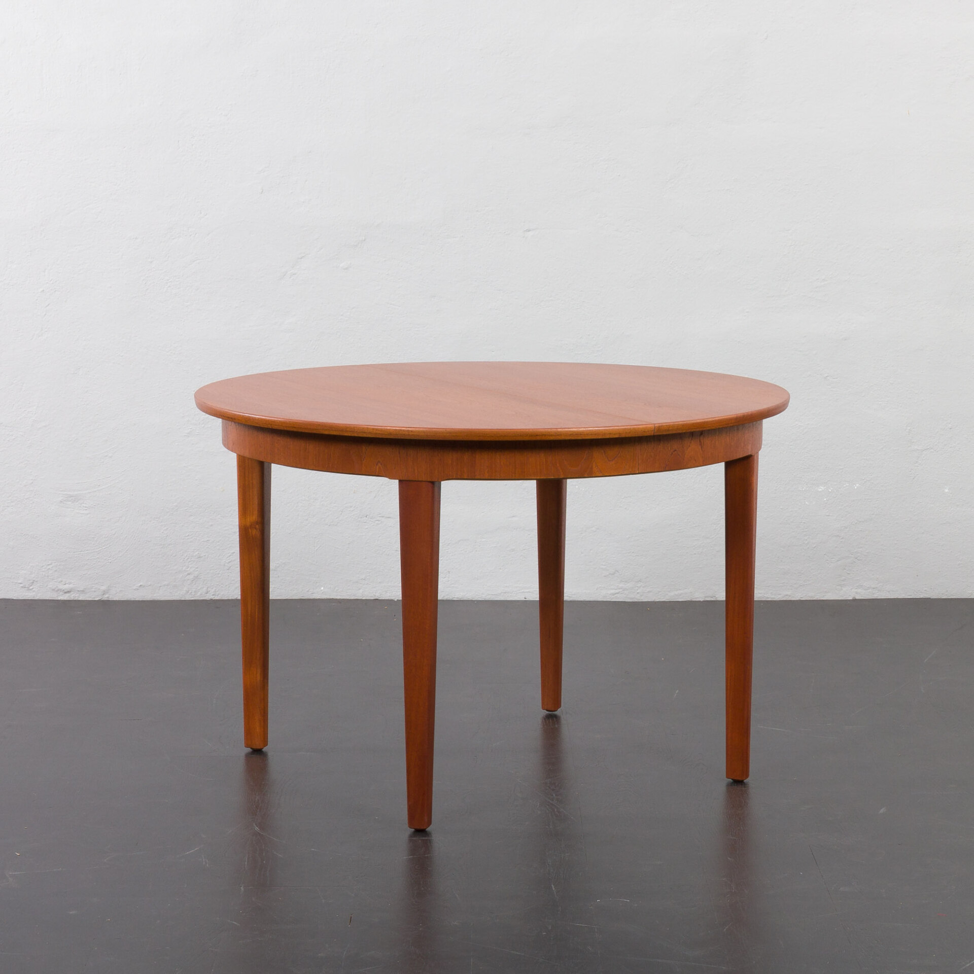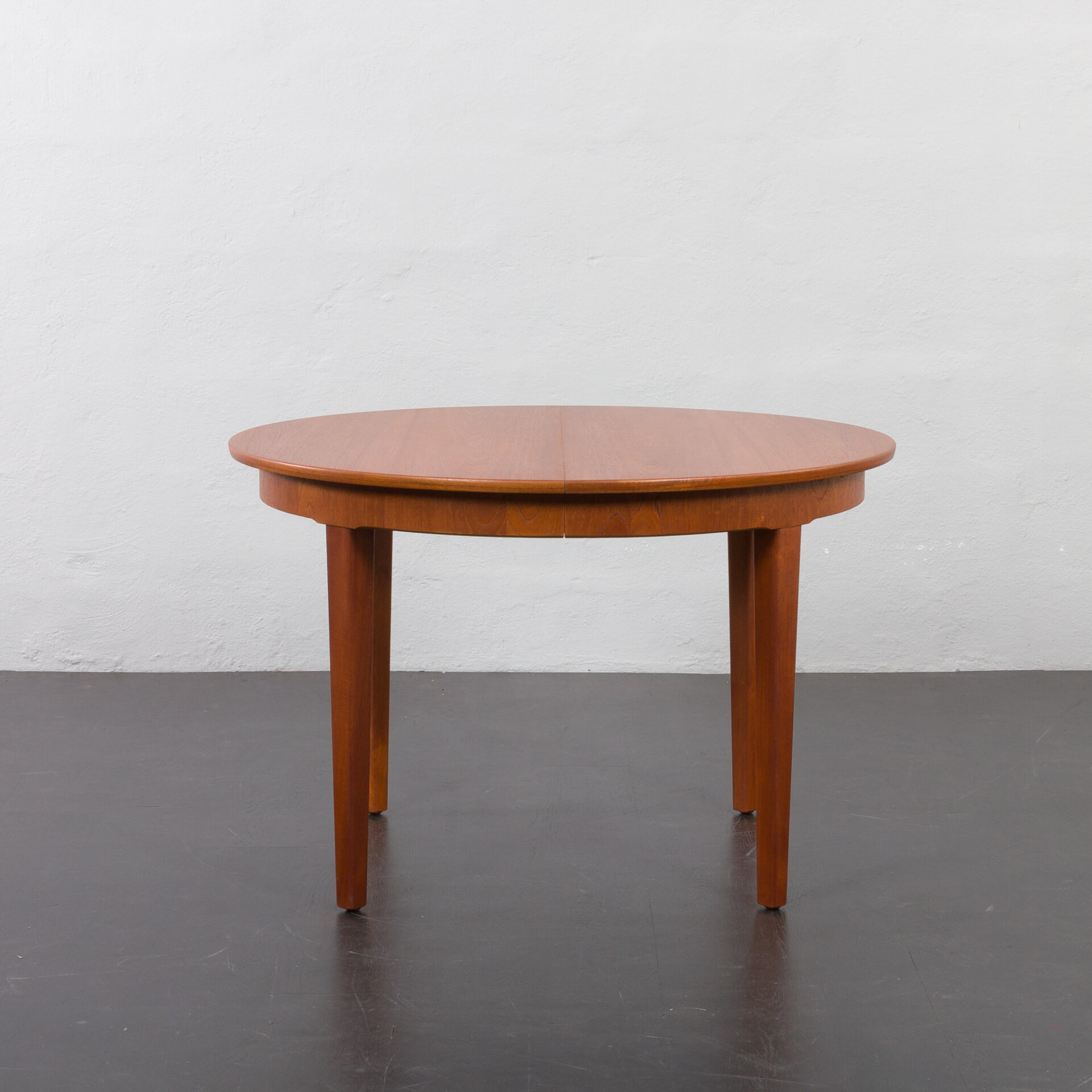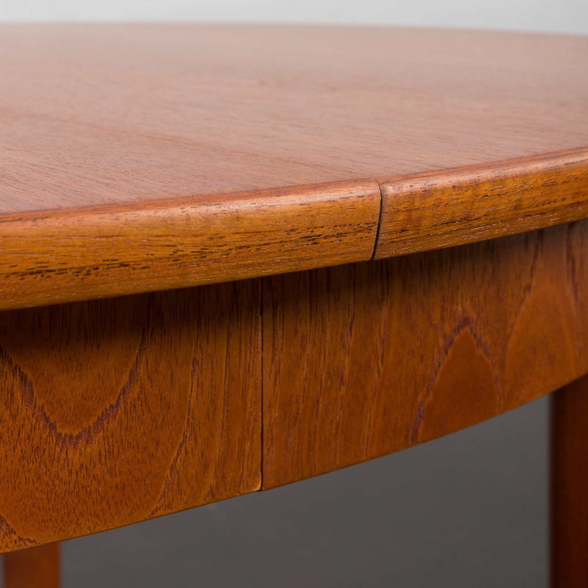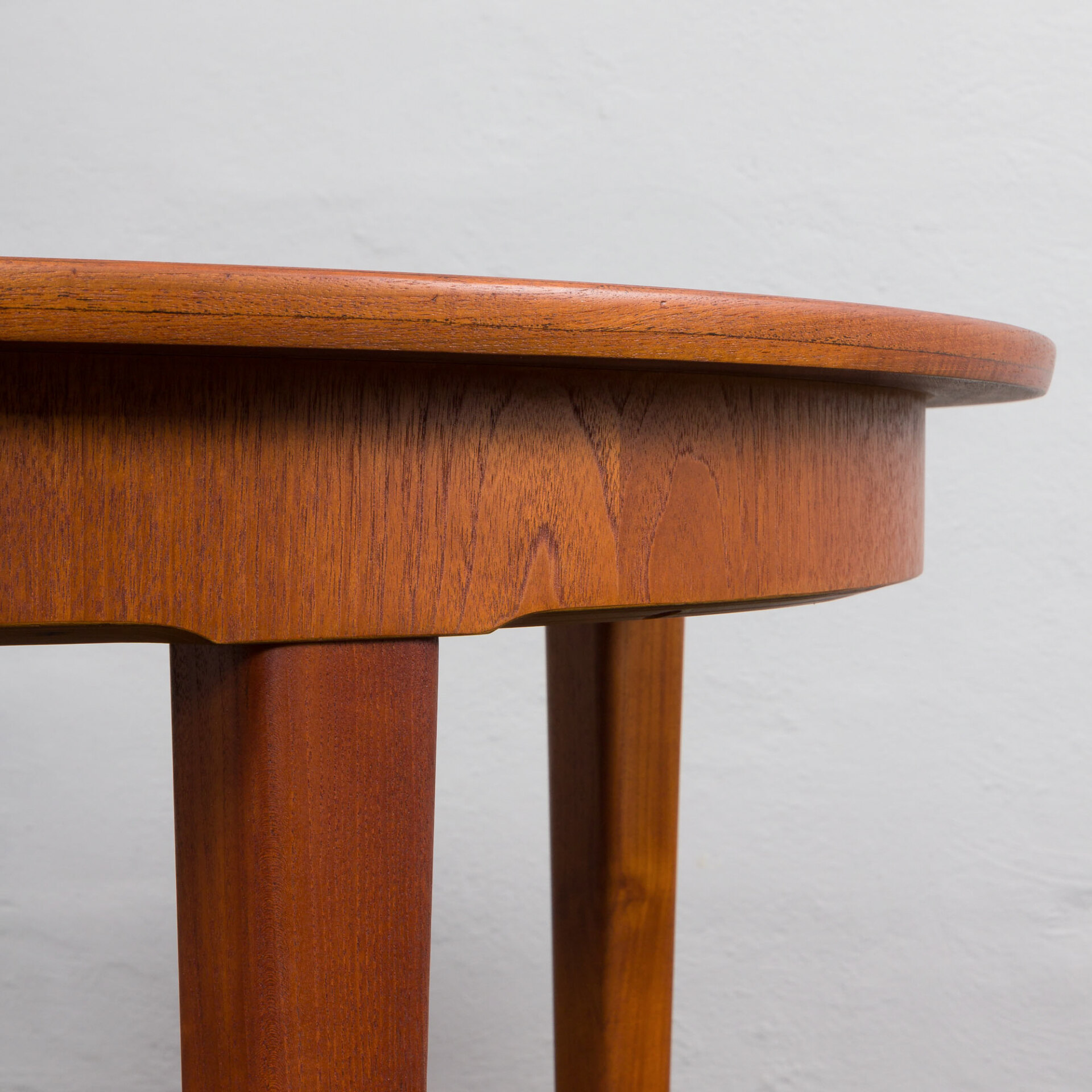 Ten okrągły, rozkładany stół to doskonały przykład klasycznego duńskiego designu z okresu mid-century w stylu Skovmand i Andersen wyprodukowany w latach 60. Posiada on dwa dodatkowe blaty - jeden z obramowaniem, który tworzy doskonałą linię i harmonijnie kontynuuje wzór drewna. Drugi blat z nieco innym usłojeniem, co dodaje mu charakteru jako "dodatkowej" opcji. W tamtym okresie, stoły w małych duńskich mieszkaniach rzadko były rozkładane do takiej długości, ale wiele firm oferowało jedną dodatkową wkładkę, często wykonaną z różnych oklein lub pomalowaną w innym kolorze.
