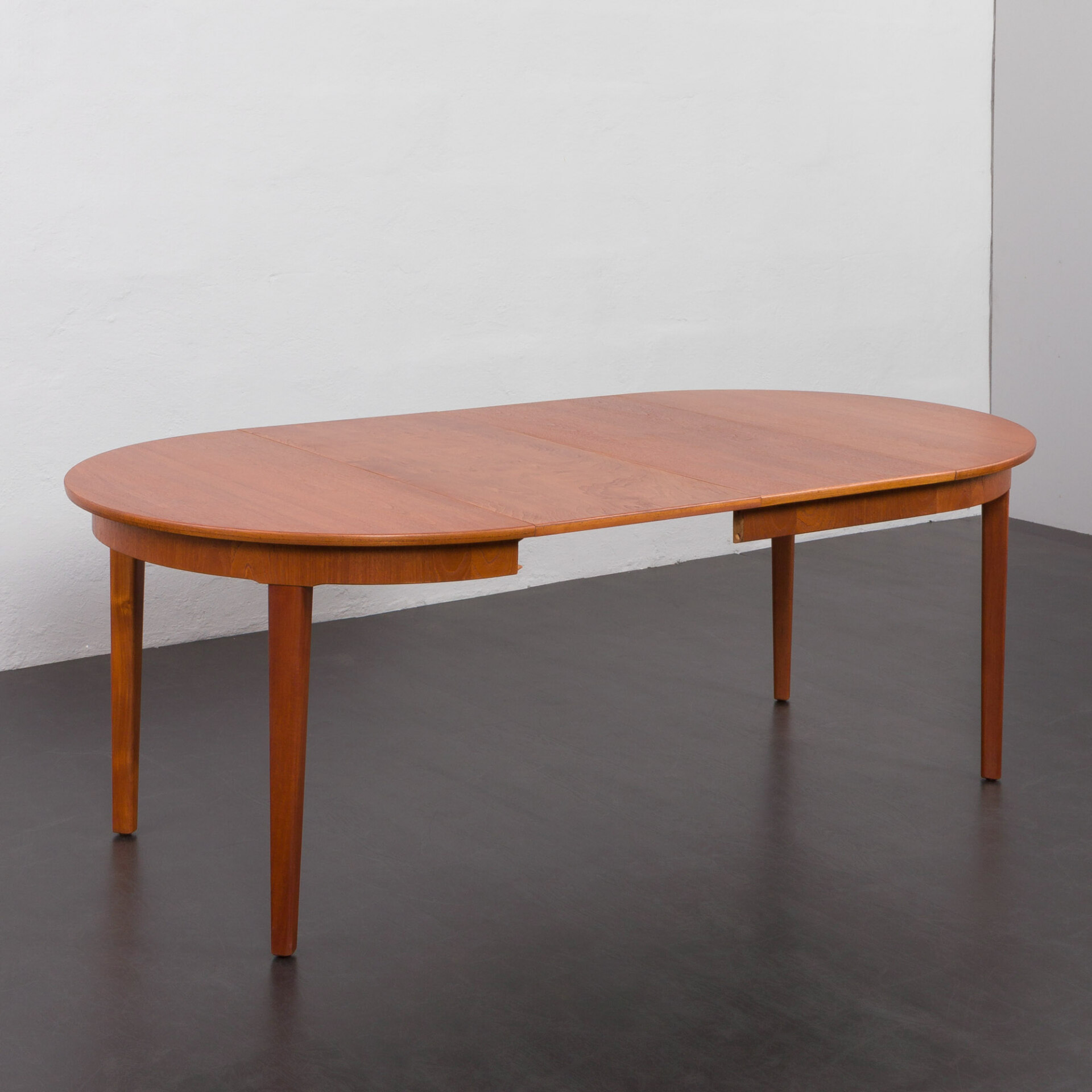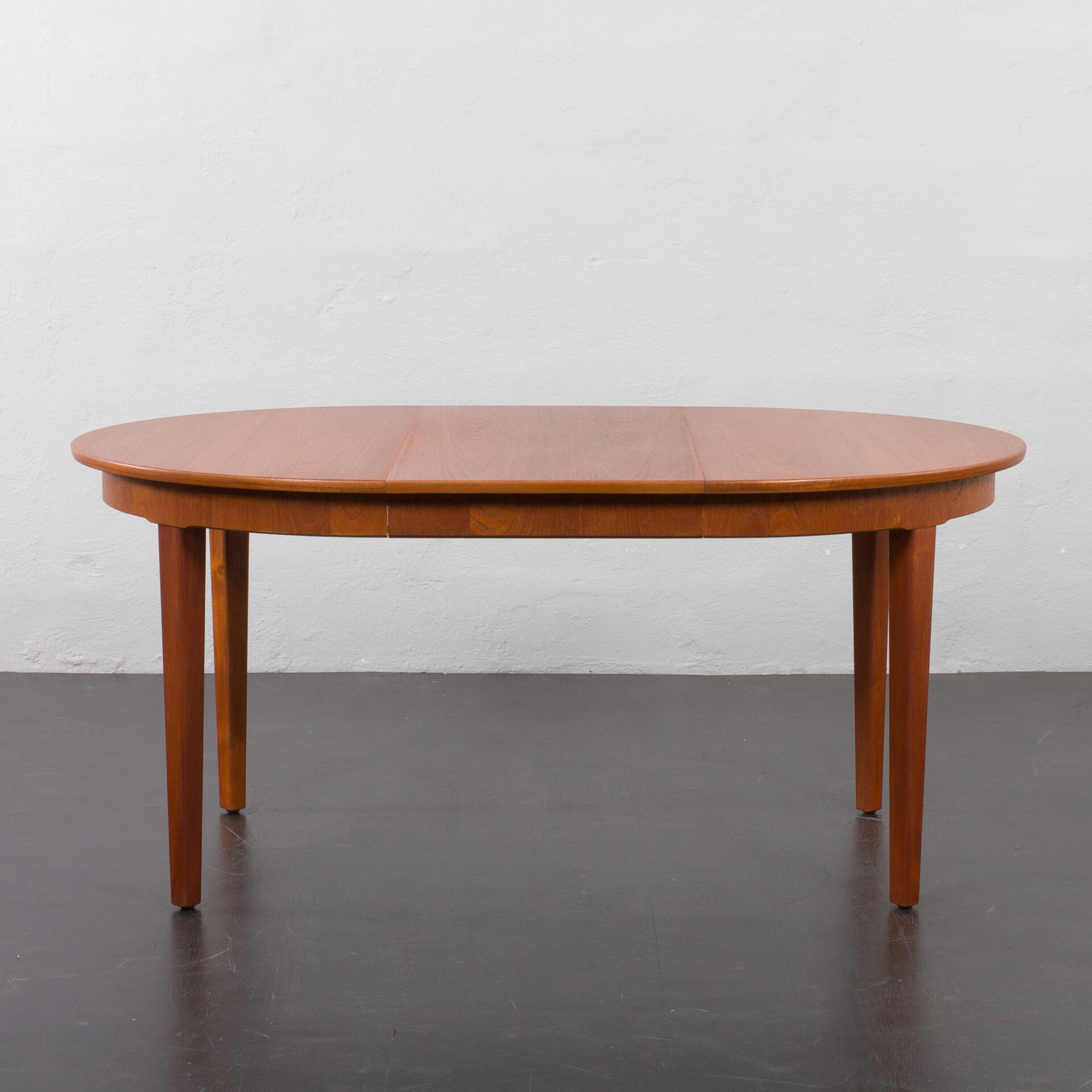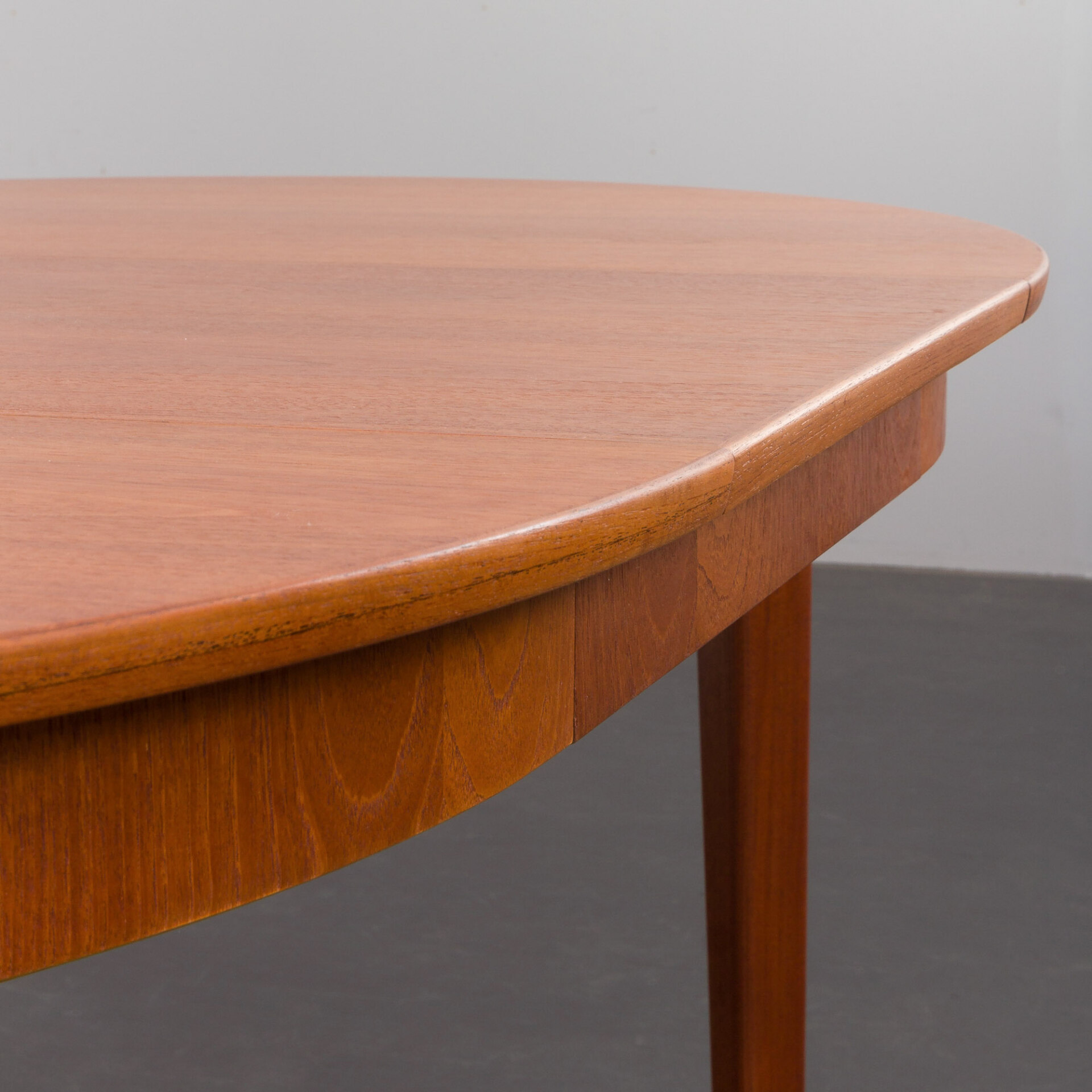 Ten okrągły, rozkładany stół to doskonały przykład klasycznego duńskiego designu z okresu mid-century w stylu Skovmand i Andersen wyprodukowany w latach 60. Posiada on dwa dodatkowe blaty - jeden z obramowaniem, który tworzy doskonałą linię i harmonijnie kontynuuje wzór drewna. Drugi blat z nieco innym usłojeniem, co dodaje mu charakteru jako "dodatkowej" opcji. W tamtym okresie, stoły w małych duńskich mieszkaniach rzadko były rozkładane do takiej długości, ale wiele firm oferowało jedną dodatkową wkładkę, często wykonaną z różnych oklein lub pomalowaną w innym kolorze.