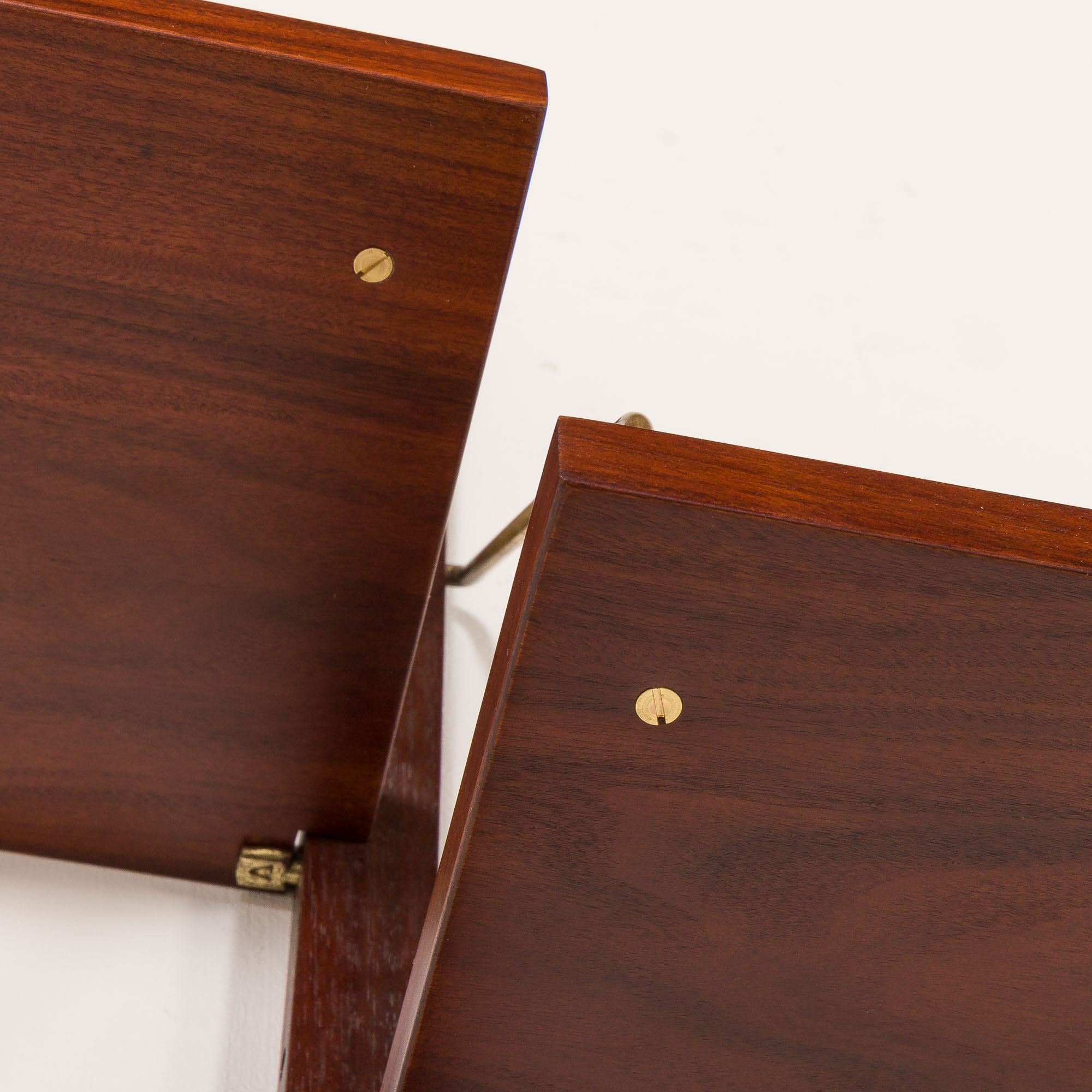 Mebel został poddany pełnej renowacji przez nasz zespół. Drewno zostało oczyszczone i wykończone nowym, satynowym lakierem. Mosiężne zawieszki zostały wypolerowane, a wszystkie elementy starannie sprawdzone. Stare, wygięte lub uszkodzone mosiężne śruby wymieniono na nowe. Wszystko jest idealnie dopasowane.