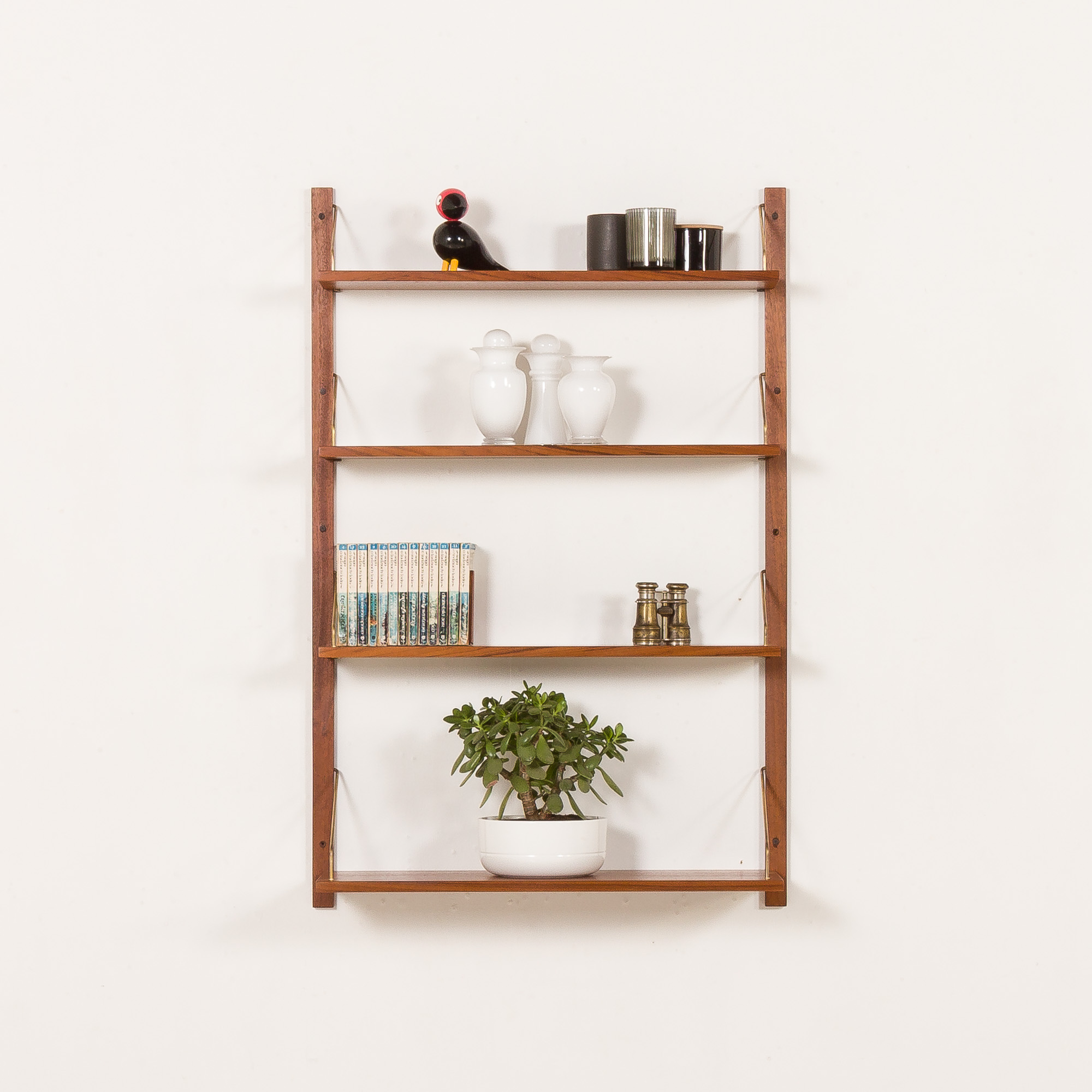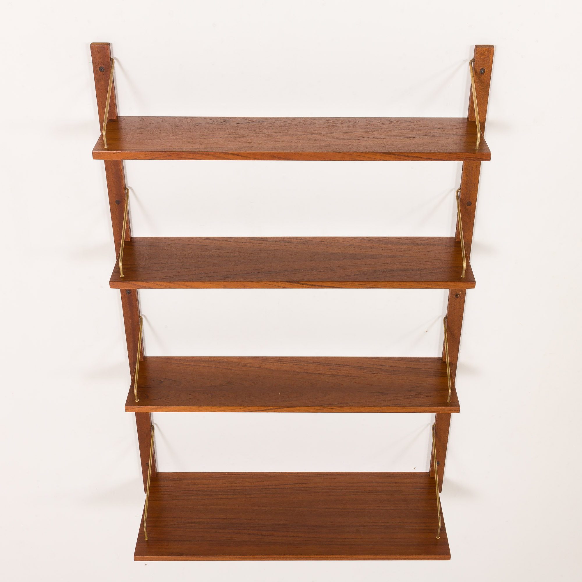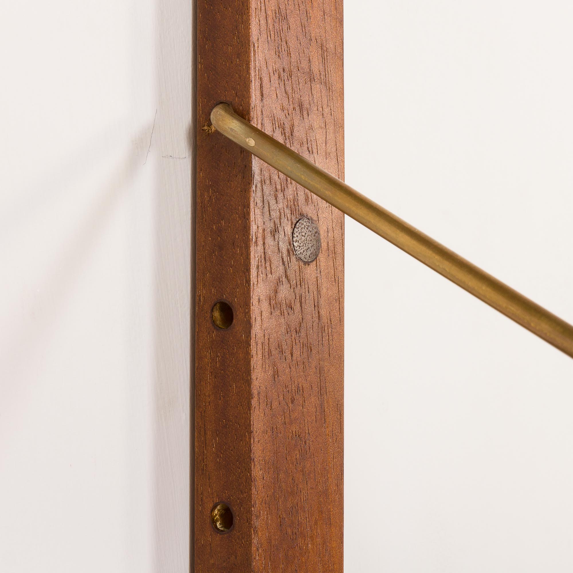 Ten regał jest w pełni modułowy, oferując możliwość dowolnej konfiguracji, dostosowując się do Twoich potrzeb. Montaż jest prosty i intuicyjny, a półki trzymają się na litych tekowych listwach za pomocą mosiężnych zawieszek.