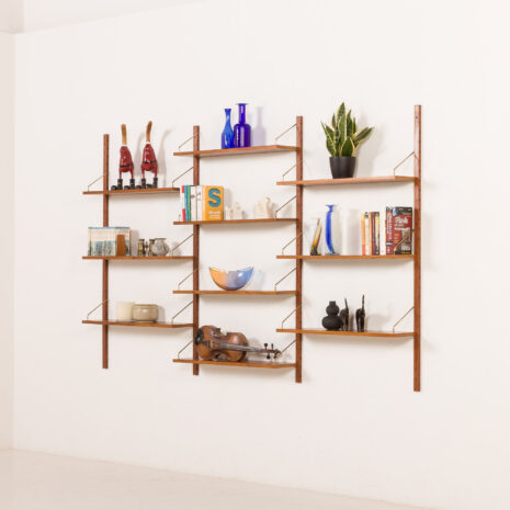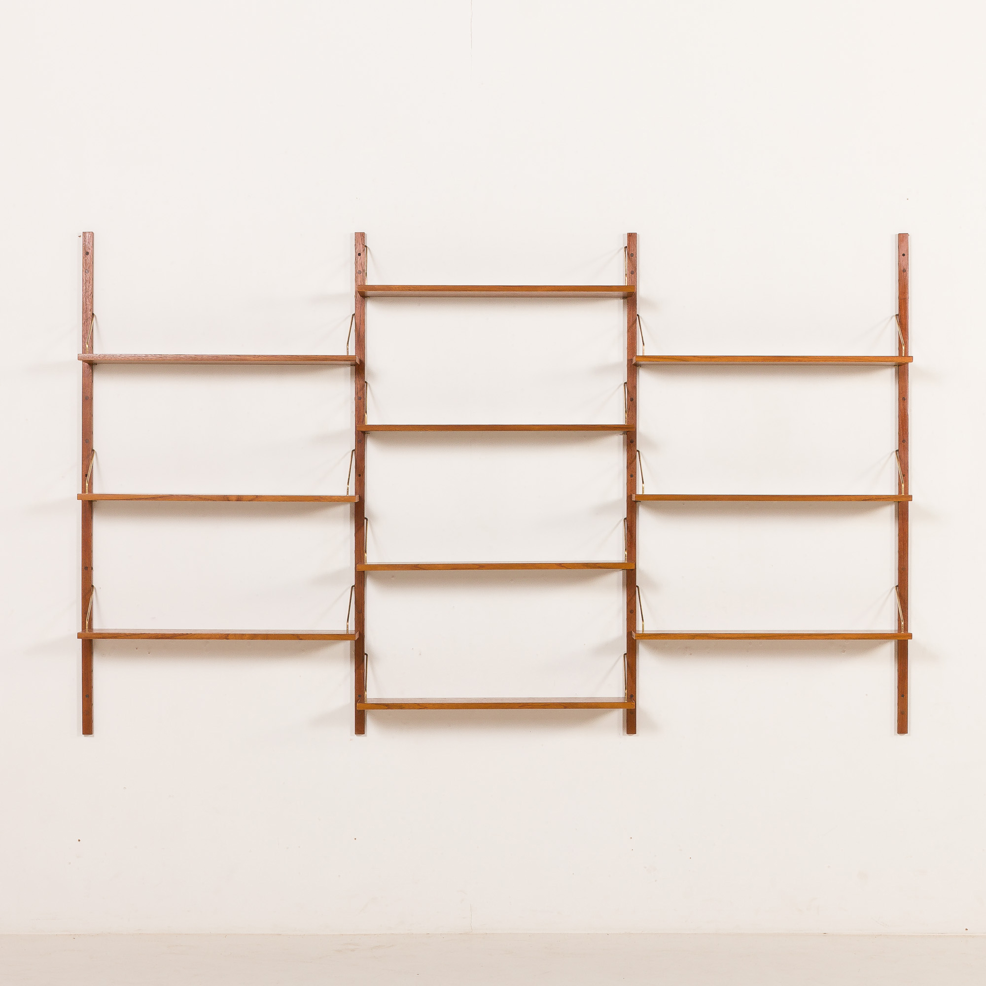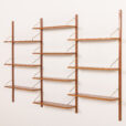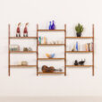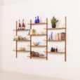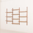 Klasyczna kompozycja skandynawskich półek z drewna tekowego, zawieszonych na listwach z litego drewna i mosiężnych zawieszkach. Zostały wykonane w Danii w latach 60.