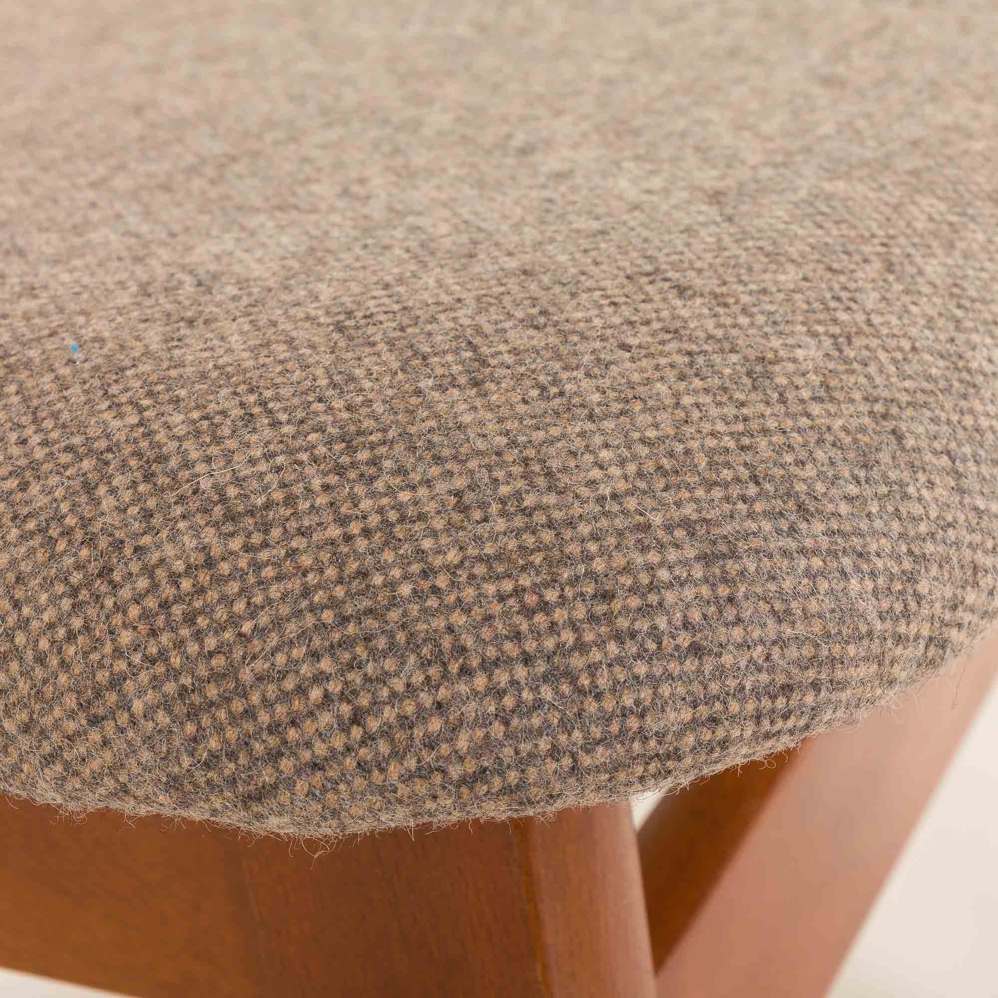 Kształt oparcia mówi sam za siebie: ergonomicznie wygięte, o wydłużonym, owalnym kształcie, zapewnia doskonałe podparcie i odpoczynek dla pleców. Zastosowanie formowanej sklejki pozwoliło na uzyskanie lekkiej, a jednocześnie solidnej konstrukcji. Krzesła zostały ponownie obite szarą, recyklingowaną wełną o subtelnym wzorze, który pięknie komponuje się z drewnianą ramą i dodaje harmonii współczesnym wnętrzom wypełnionym materiałami sztucznymi.