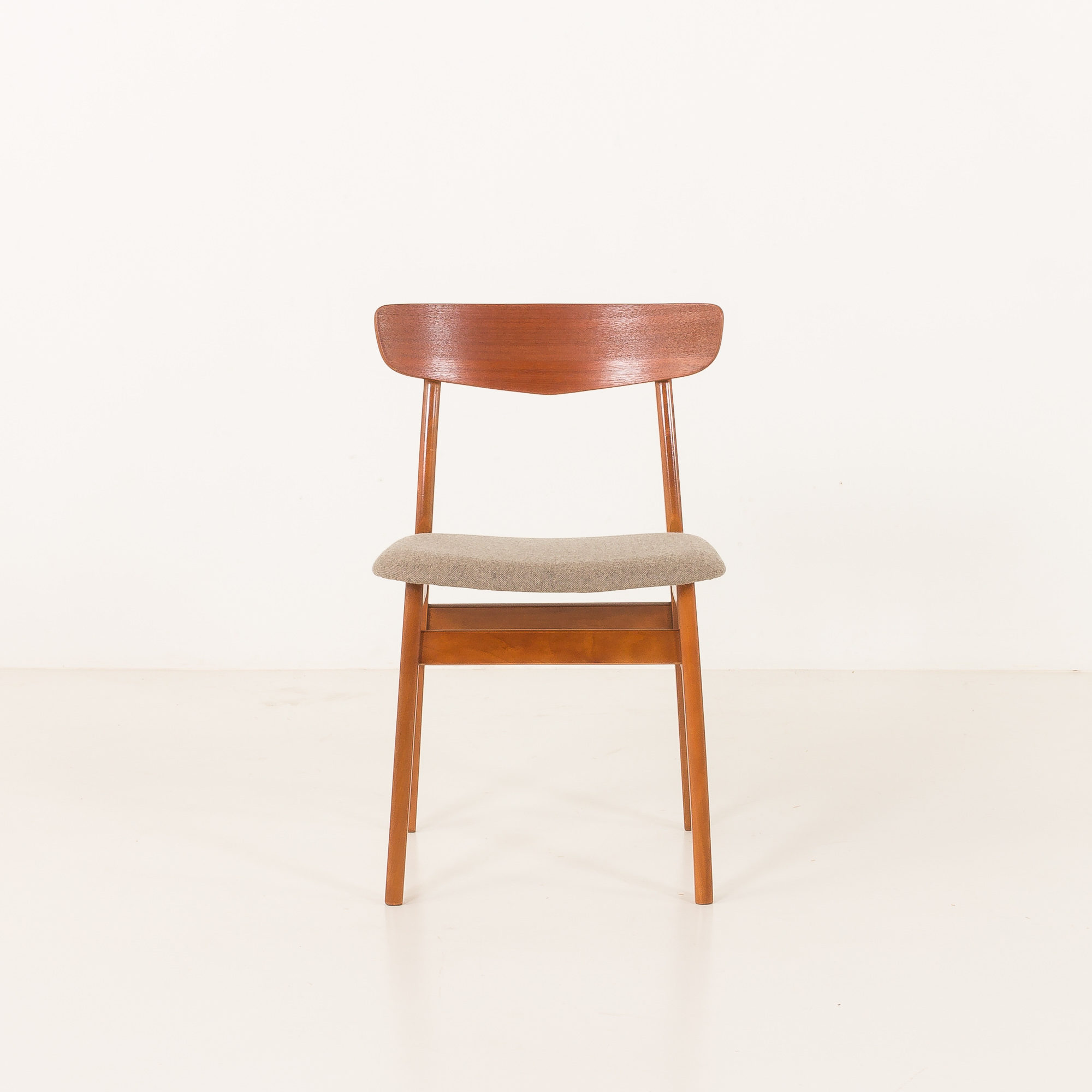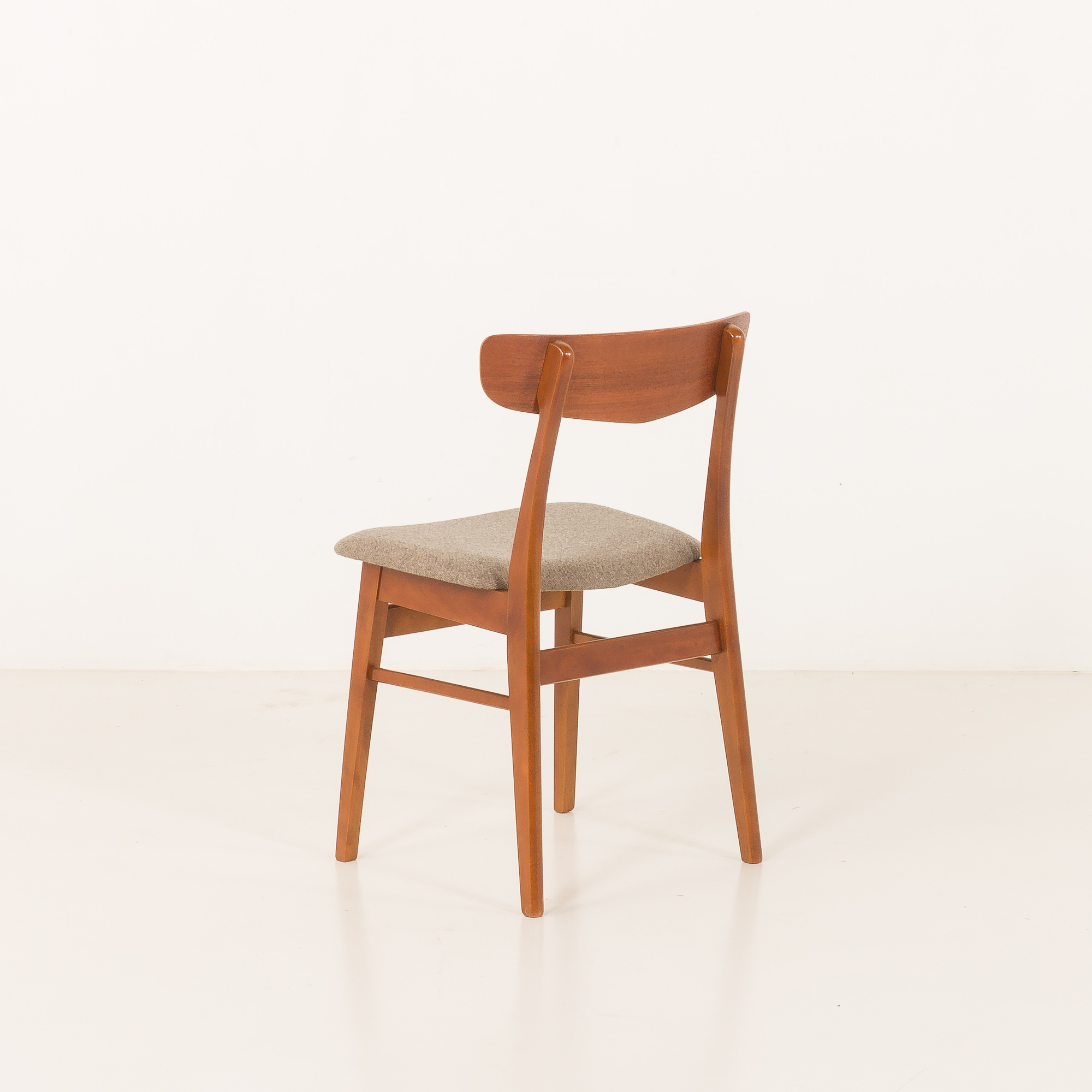 To duńskie krzesło w stylu mid-century z drewna tekowego pochodzi z Danii i zostało najprawdopodobniej wyprodukowane przez Farstrup Mobelfabrik w latach 60. Charakteryzuje się on misternie wykonaną ramą z litego drewna bukowego w kolorze tekowym oraz oparciem z drewna tekowego. Mistrzowsko wyrzeźbiona i łączona rama z litego drewna oraz nowa, naturalna tapicerka z wełny z recyklingu w kolorze szarym to idealne połączenie skandynawskiego rzemiosła vintage z nowoczesną, ekologiczną koncepcją, nadając krzesłu stylowy i wyjątkowy charakter.