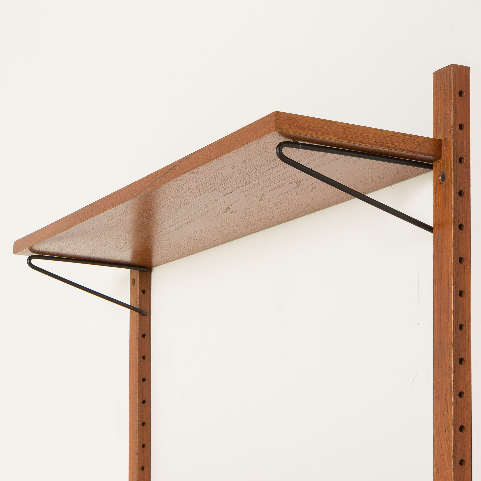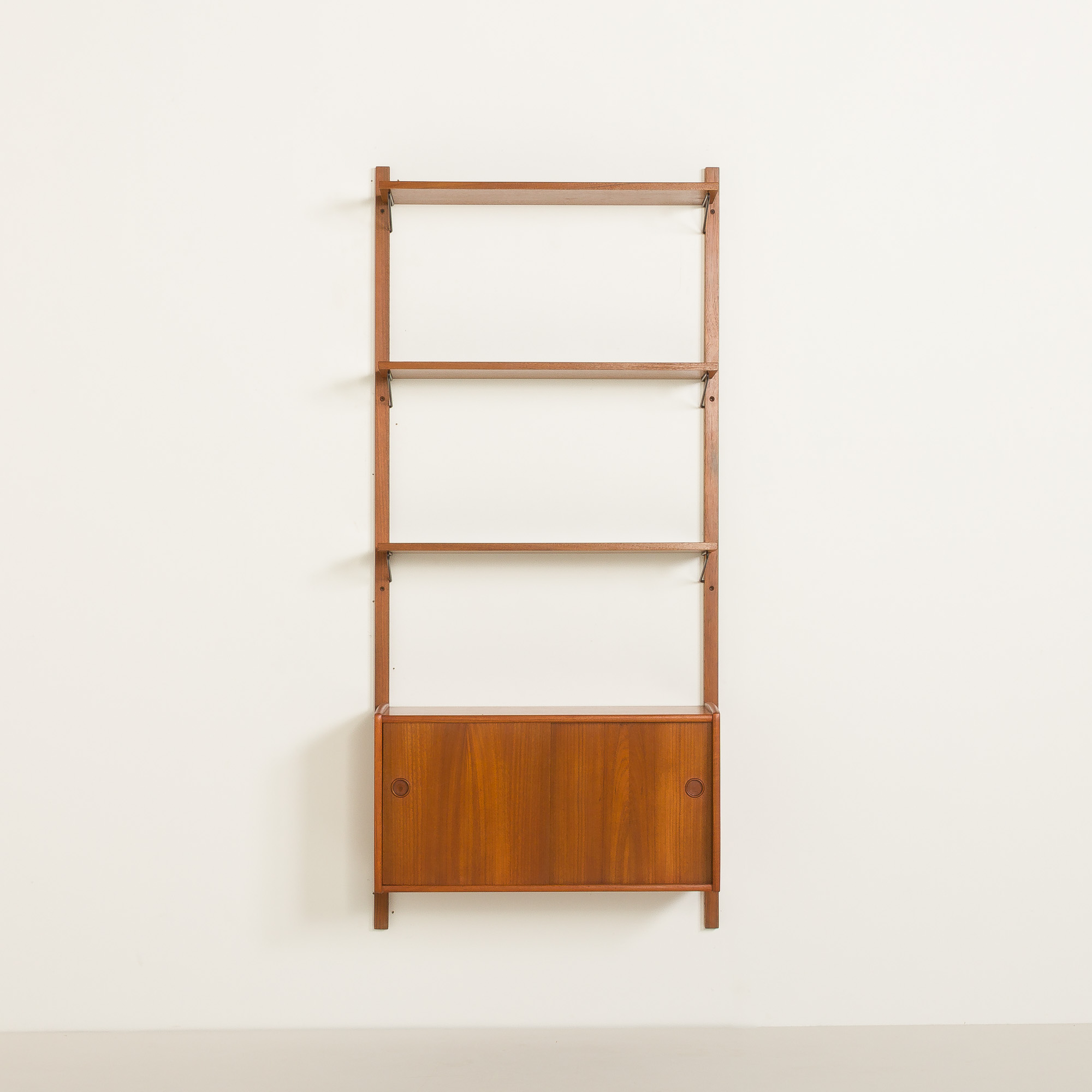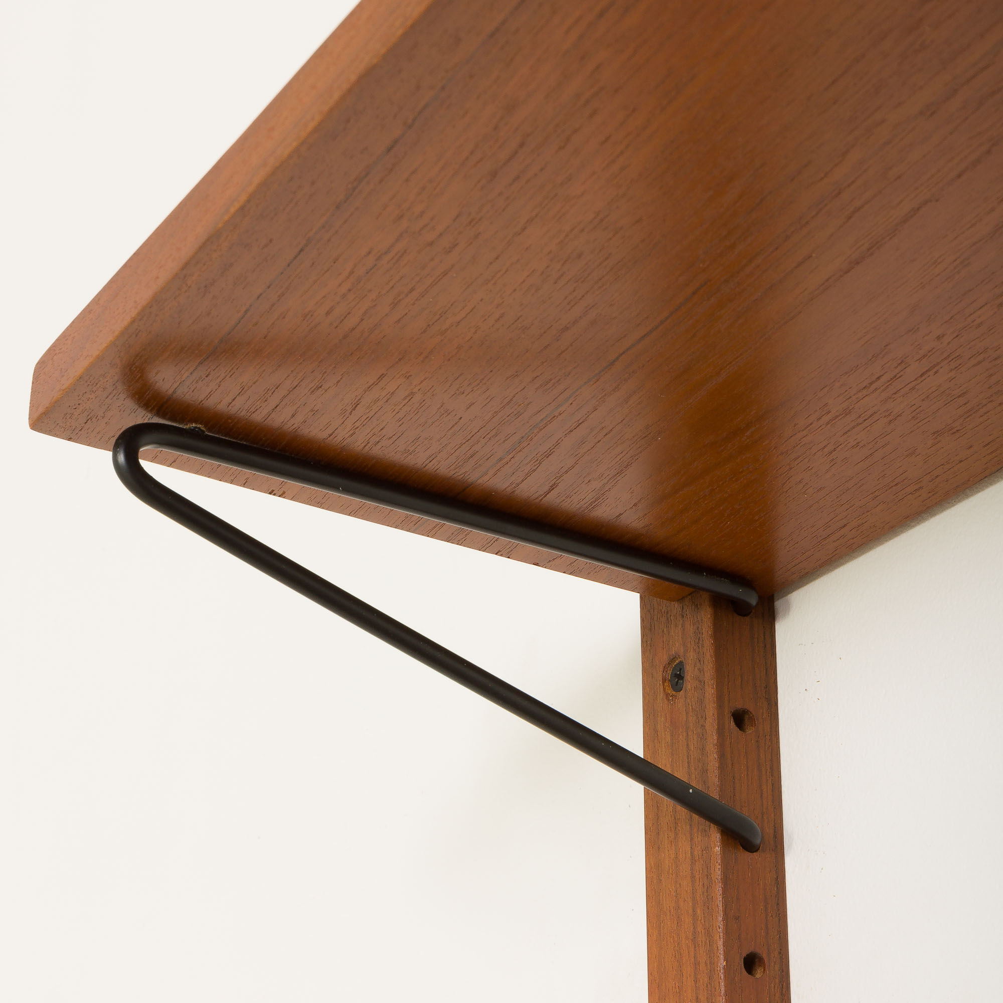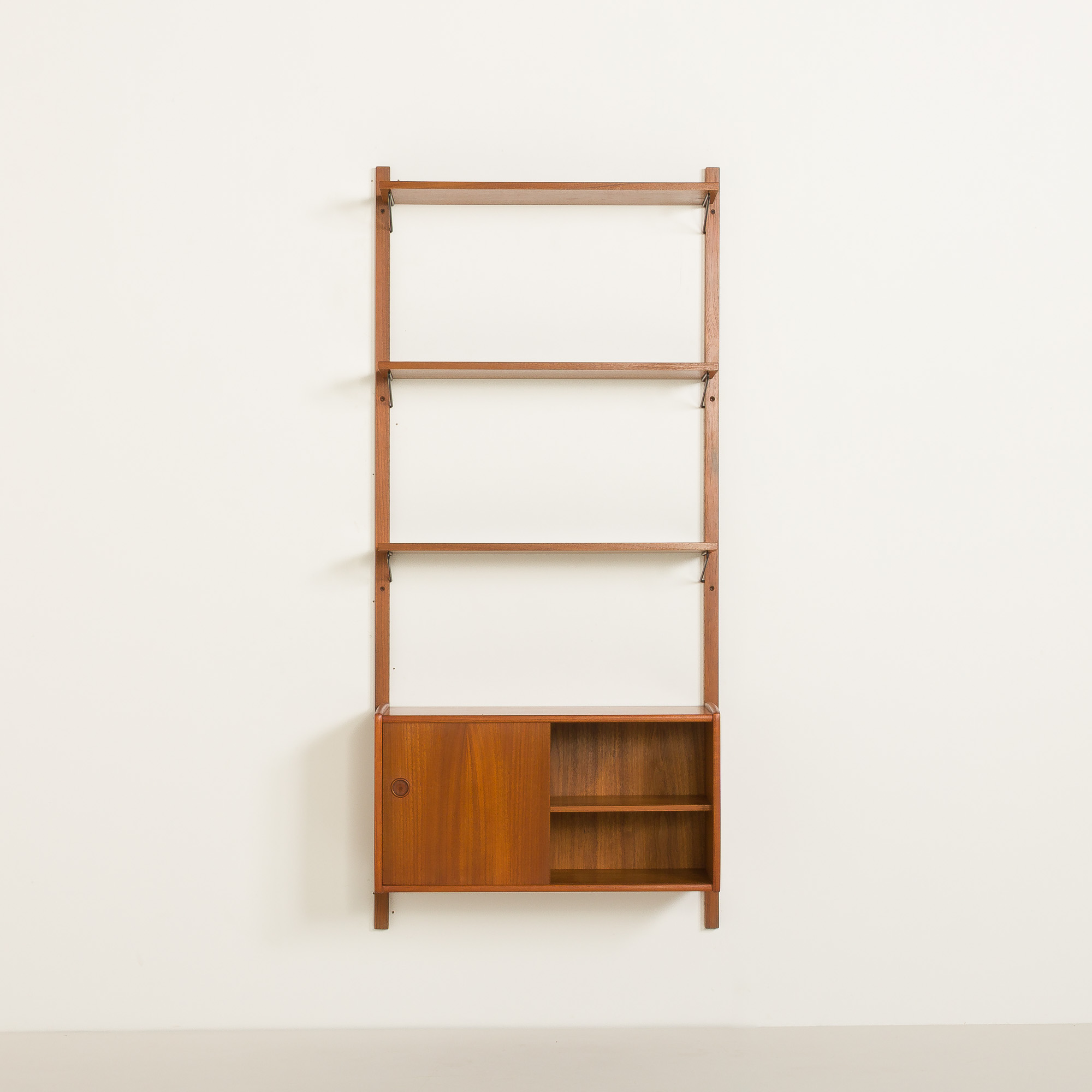 Klasyczny duński regał ścienny z drewna tekowego okresu mid-century zaprojektowany w latach 60 przypomina projekty Poula Cadoviusa z tego samego okresu. Ten regał, wyposażony w szafkę i trzy półki, zapewni wystarczającą ilość miejsca do przechowywania w małych mieszkaniach. Jest to modułowy system regałów, który można dowolnie aranżować. Półki są montowane za pomocą czarnych metalowych zawieszek i można je opuszczać lub podnosić za pomocą regularnie rozmieszczonych otworów w drewnianych relingach.