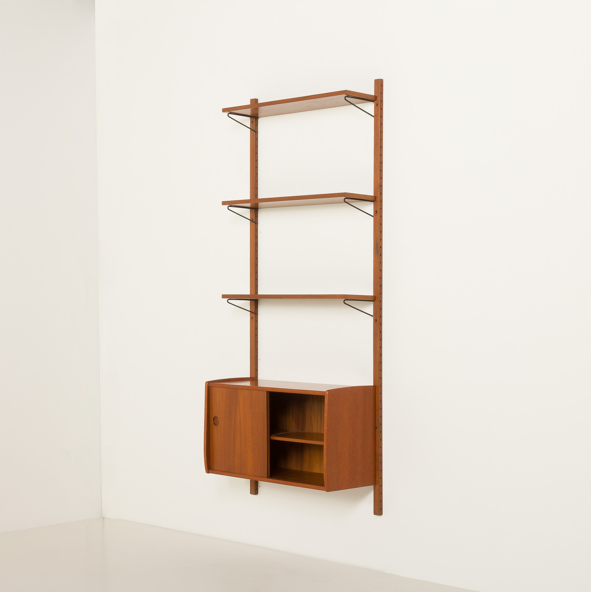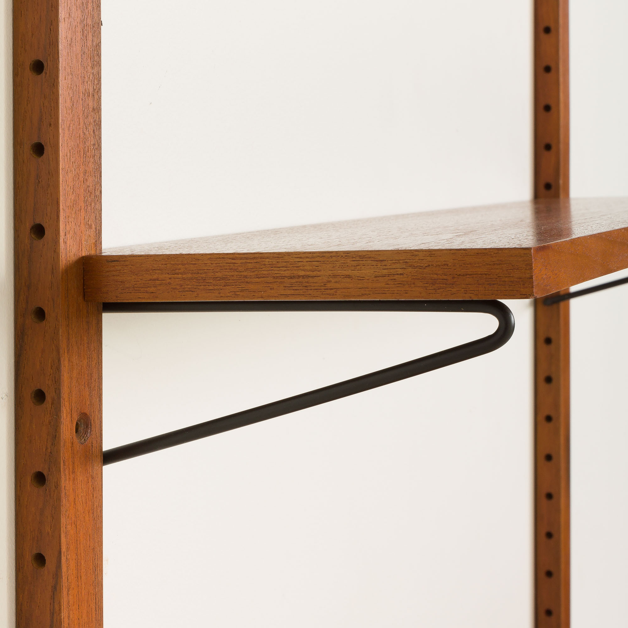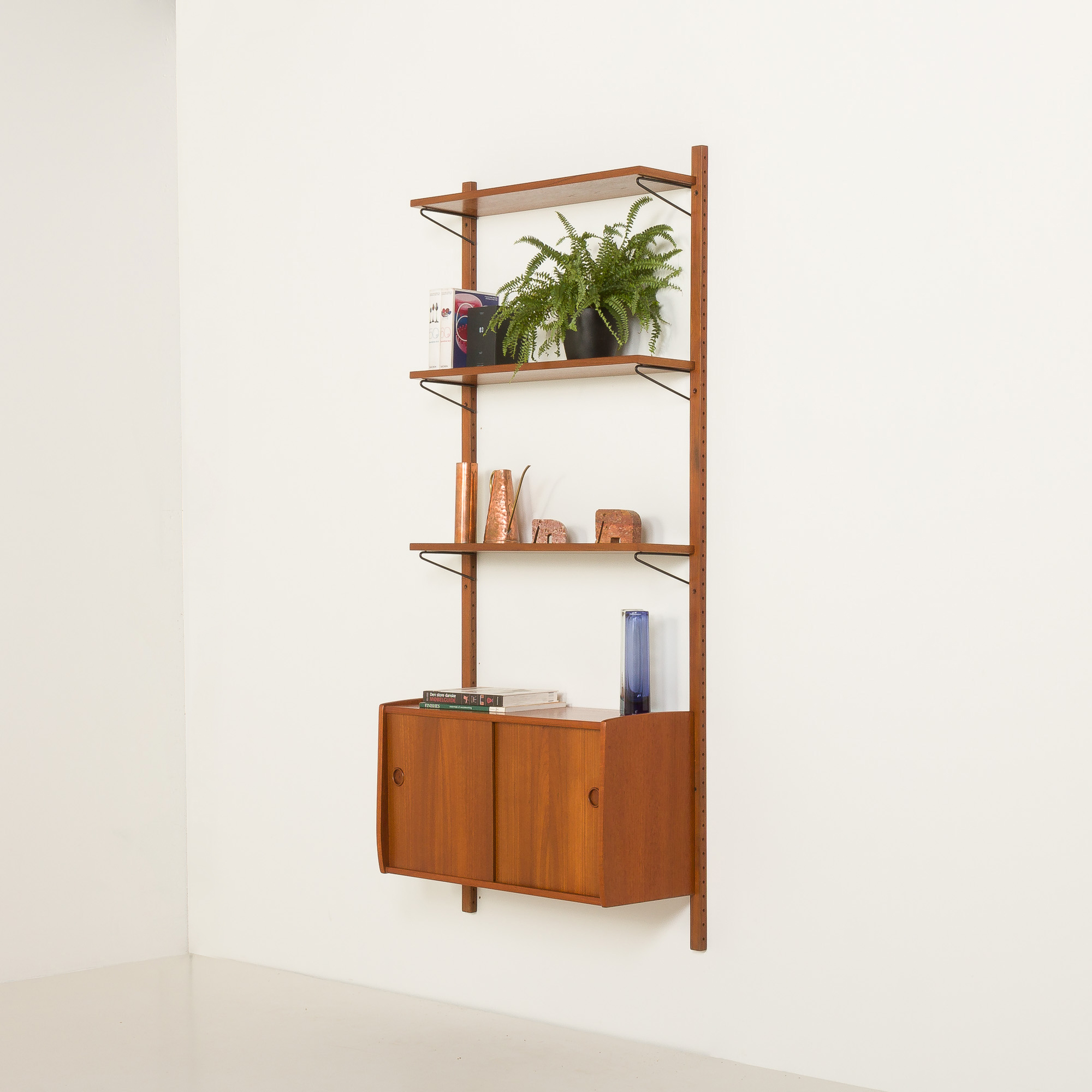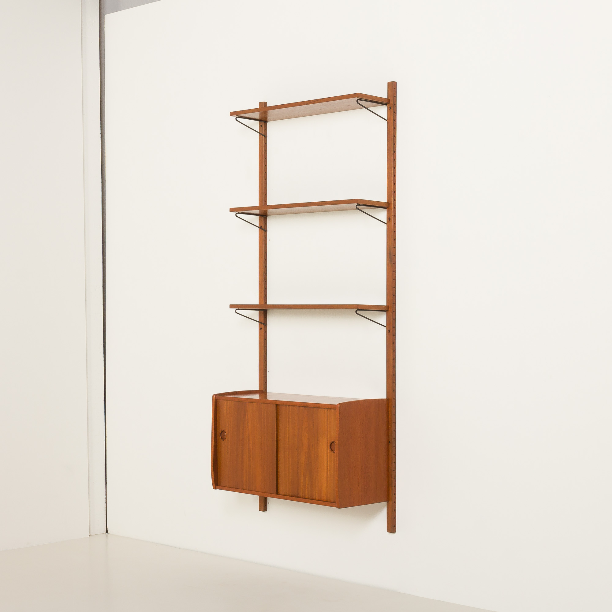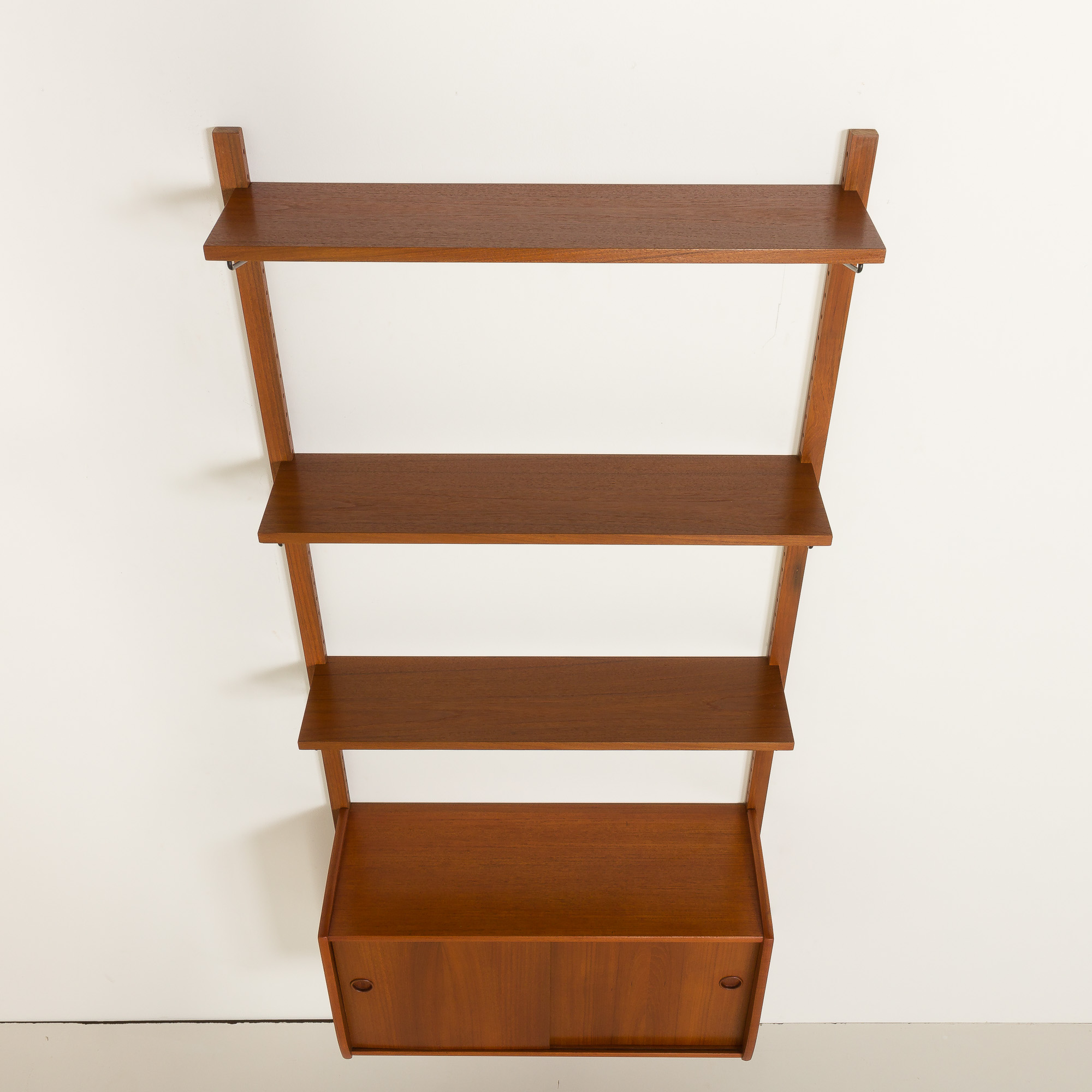 Klasyczny duński regał ścienny z drewna tekowego okresu mid-century zaprojektowany w latach 60 przypomina projekty Poula Cadoviusa z tego samego okresu. Ten regał, wyposażony w szafkę i trzy półki, zapewni wystarczającą ilość miejsca do przechowywania w małych mieszkaniach. Jest to modułowy system regałów, który można dowolnie aranżować. Półki są montowane za pomocą czarnych metalowych zawieszek i można je opuszczać lub podnosić za pomocą regularnie rozmieszczonych otworów w drewnianych relingach.