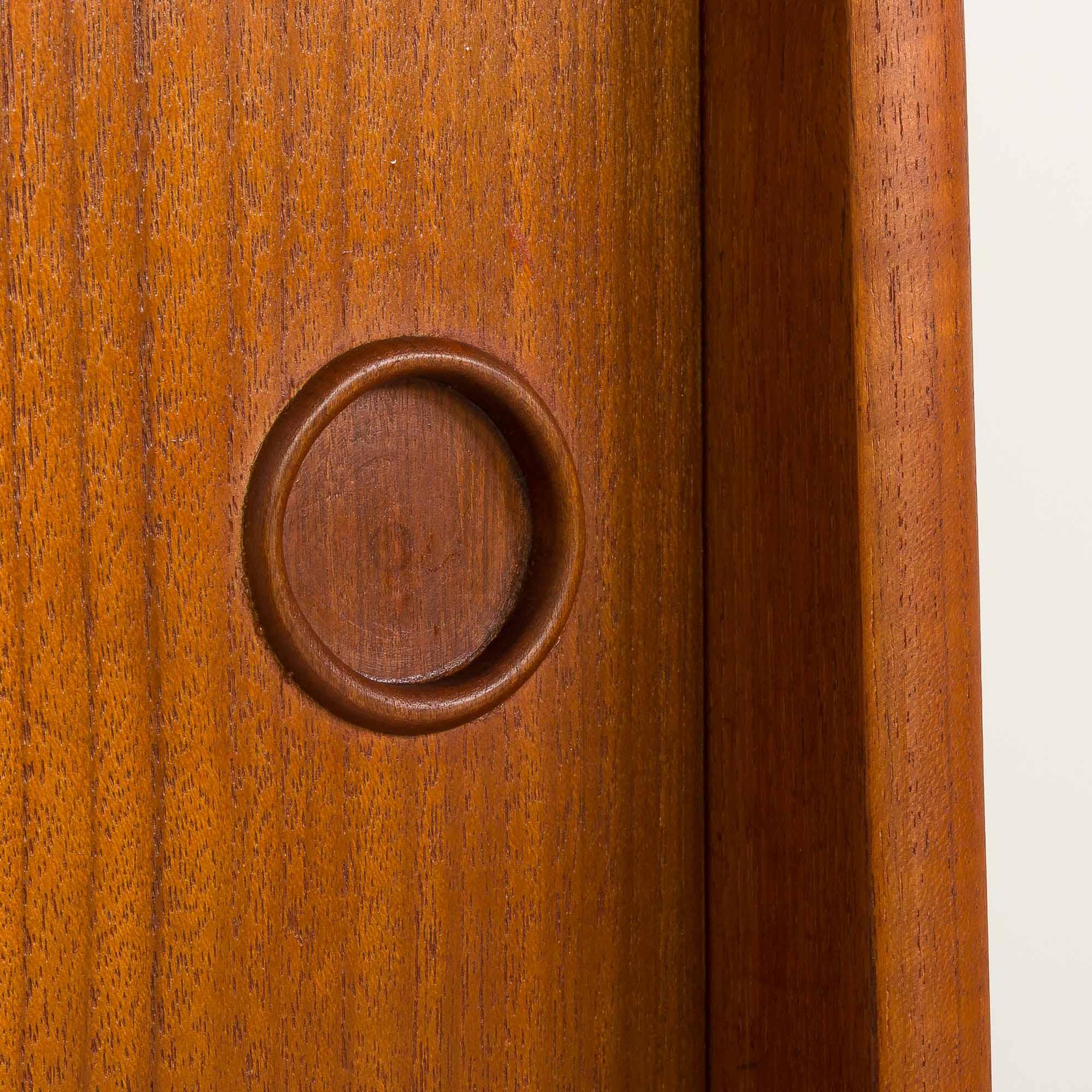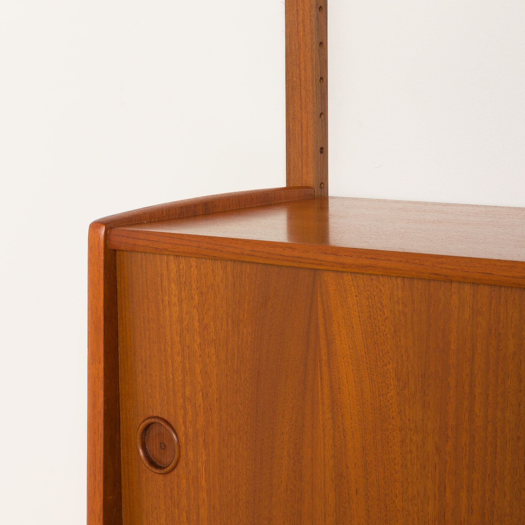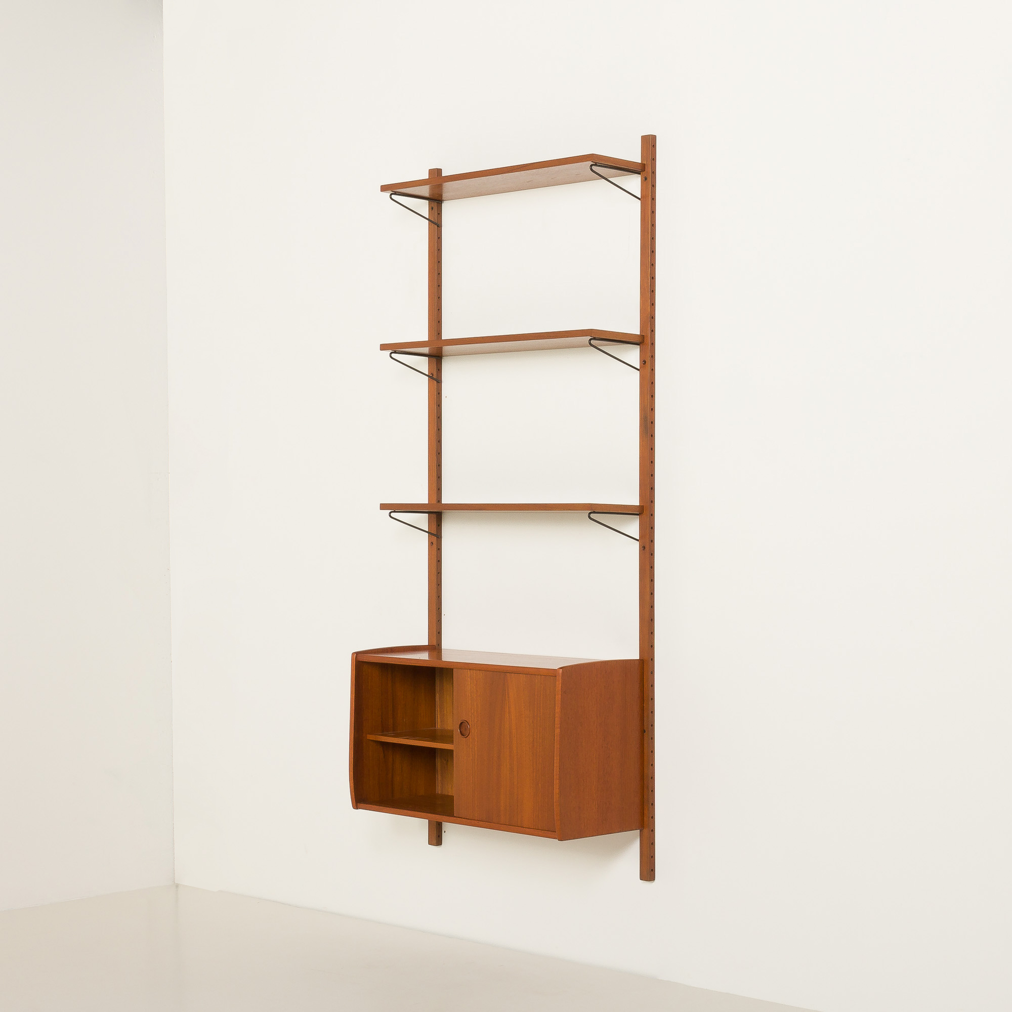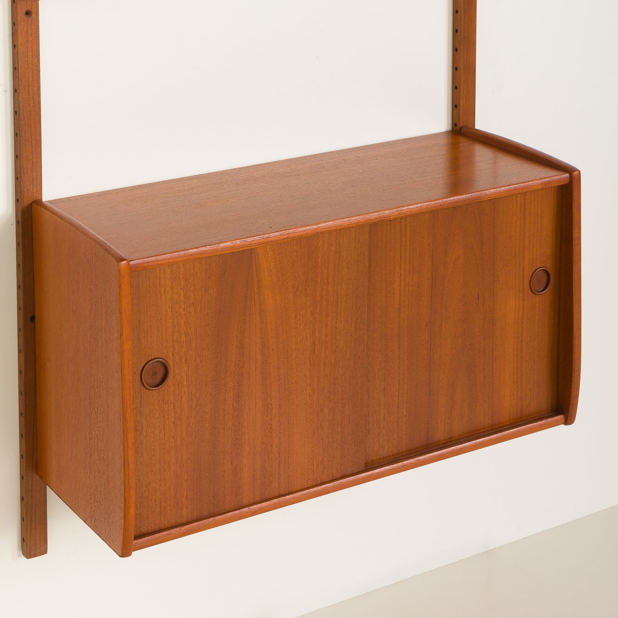 Klasyczny duński regał ścienny z drewna tekowego okresu mid-century zaprojektowany w latach 60 przypomina projekty Poula Cadoviusa z tego samego okresu. Ten regał, wyposażony w szafkę i trzy półki, zapewni wystarczającą ilość miejsca do przechowywania w małych mieszkaniach. Jest to modułowy system regałów, który można dowolnie aranżować. Półki są montowane za pomocą czarnych metalowych zawieszek i można je opuszczać lub podnosić za pomocą regularnie rozmieszczonych otworów w drewnianych relingach.