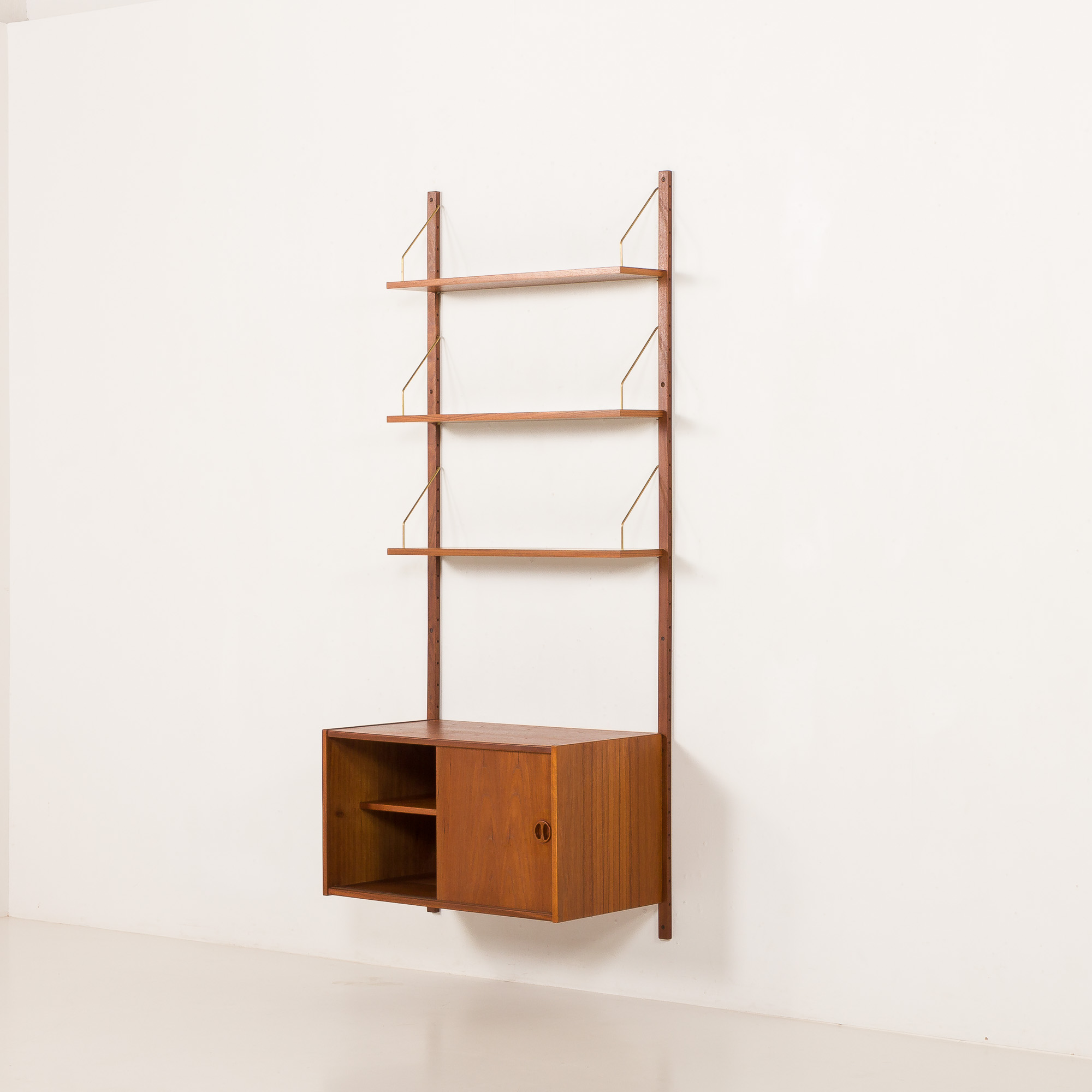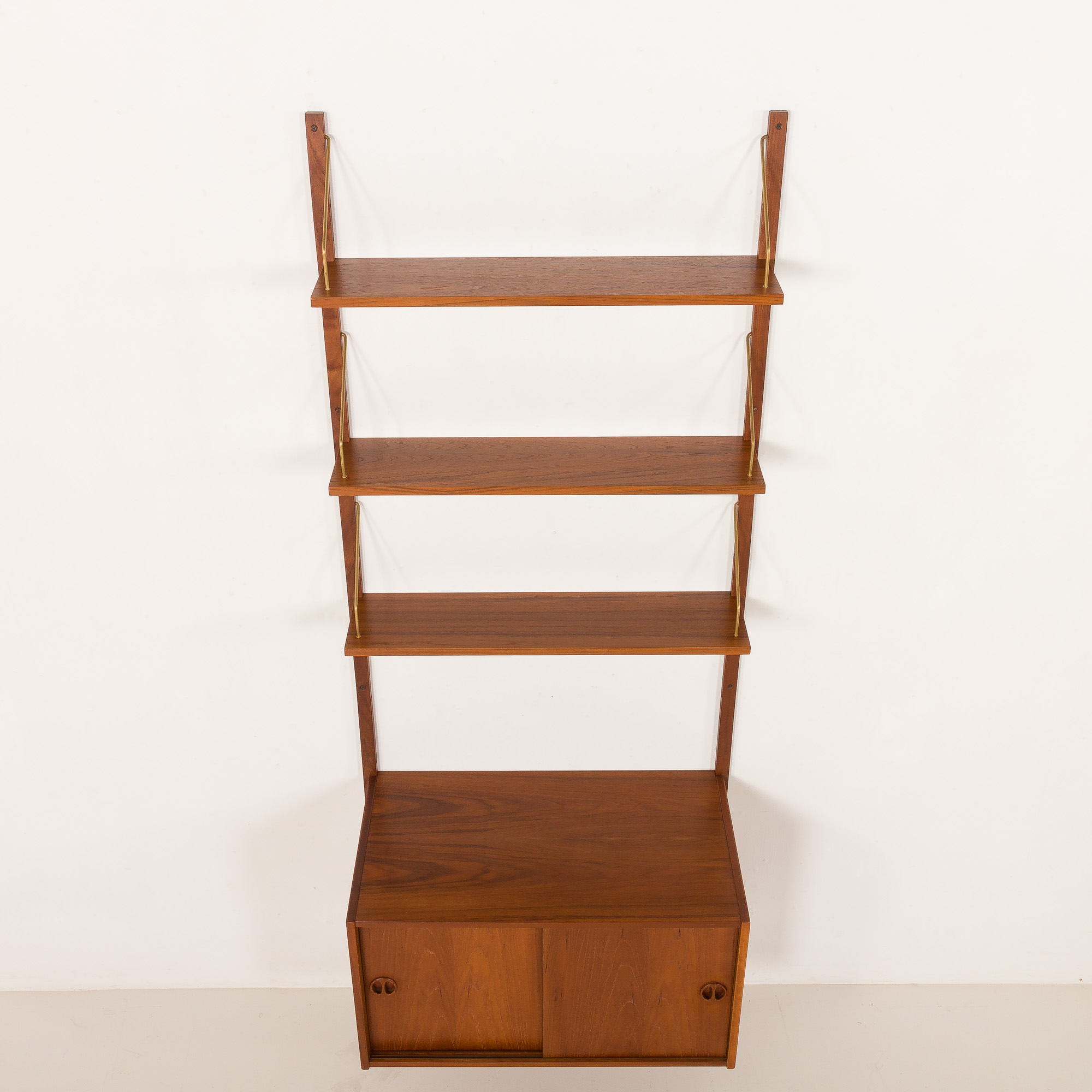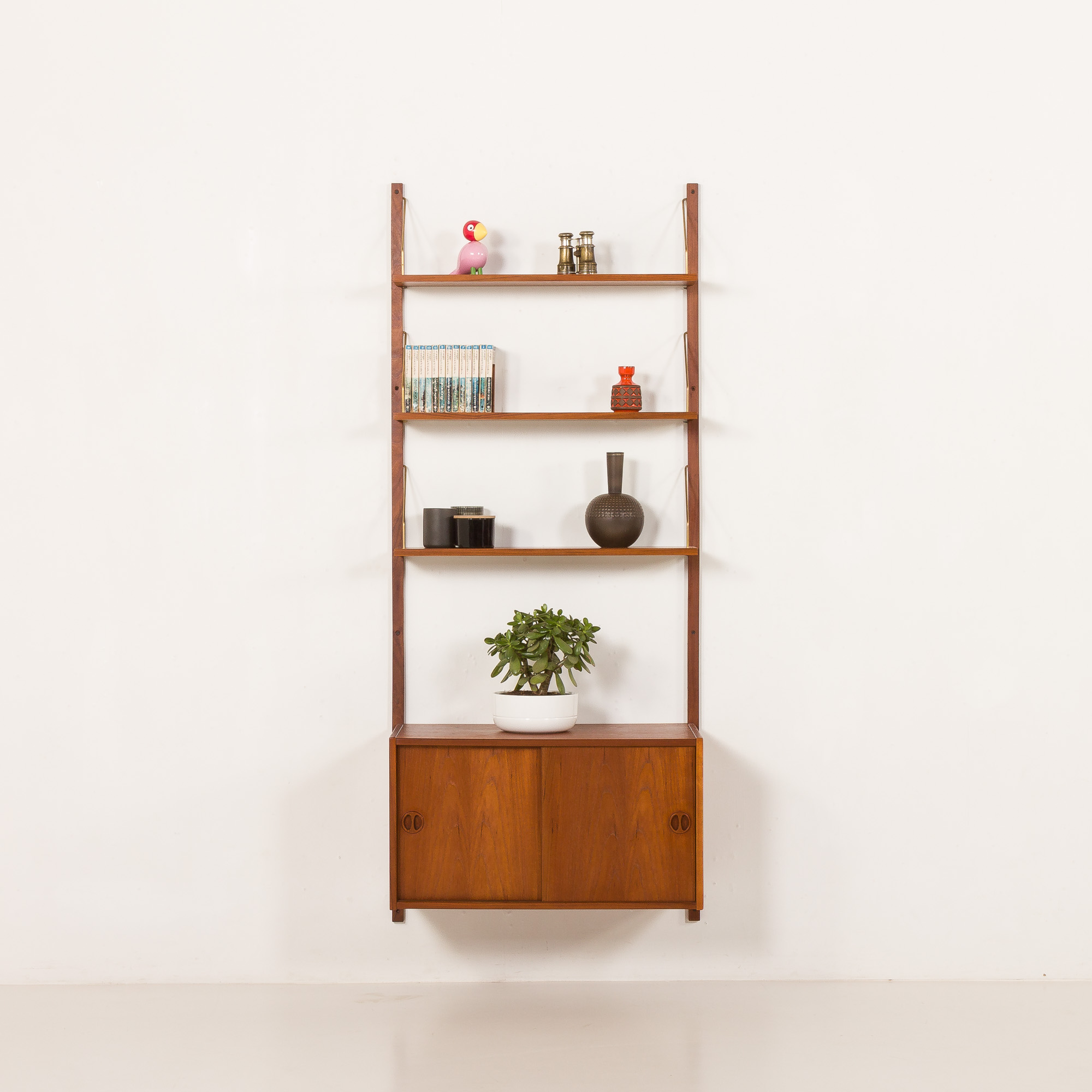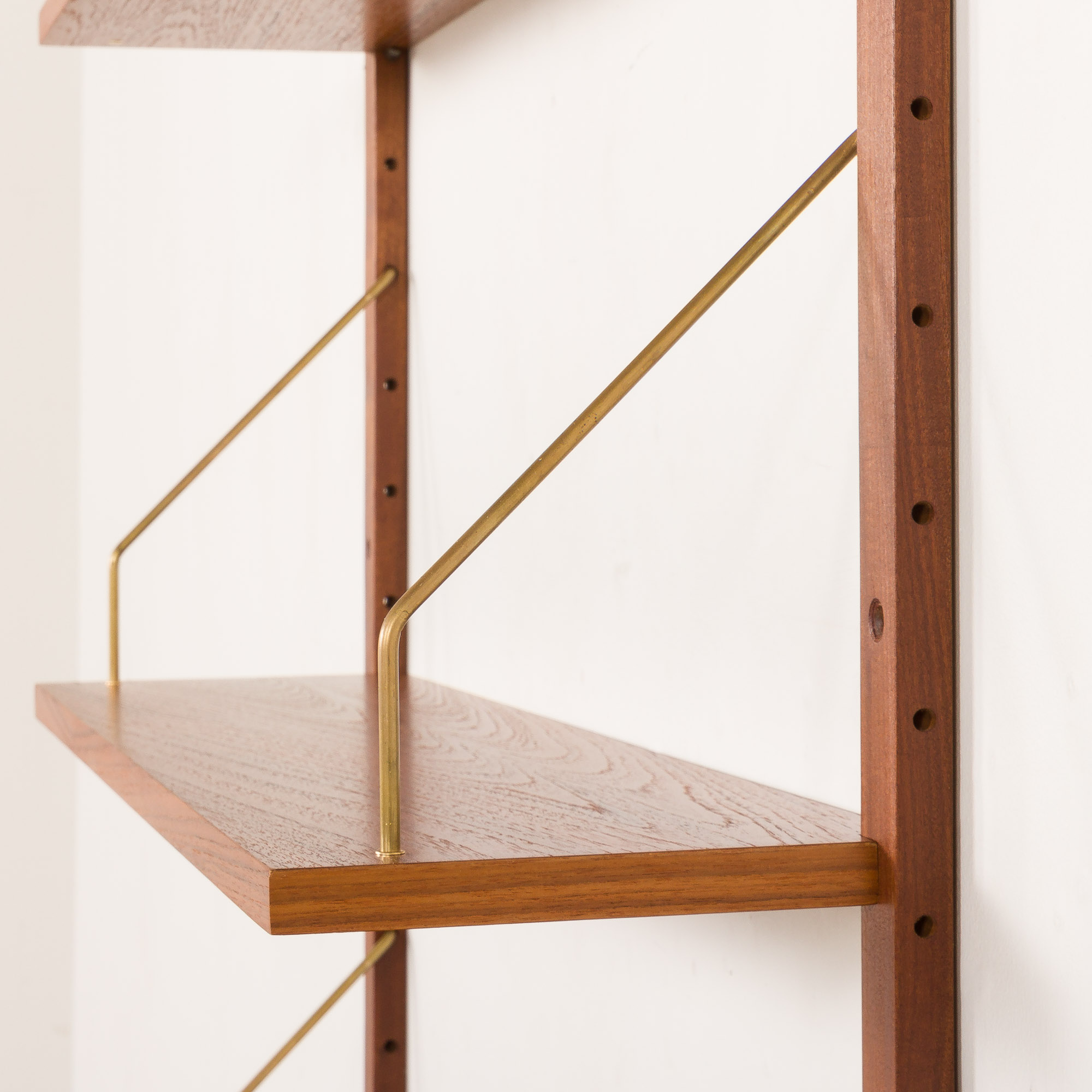 Ten skandynawski regał vintage z drewna tekowego został wyprodukowany w Danii w latach 60. Pochodzi z tego samego okresu i bardzo przypomina słynne meble Poula Cadoviusa. Posiada trzy półki i jedną szafkę z przesuwnymi drzwiczkami. Front szafki pokryty jest starannie dobranym fornirem, który w połączeniu z wyrzeźbionymi uchwytami tworzy spójny, modernistyczny wygląd. Półki zamontowane są na mosiężnych zawieszkach na listwach z litego drewna, a dzięki regularnym otworom można je umieścić niżej lub wyżej. Dzięki temu zestaw jest nie tylko stylowy, ale i funkcjonalny. Może stanowić idealny mebel wejściowy lub praktyczną ozdobę salonu lub sypialni.