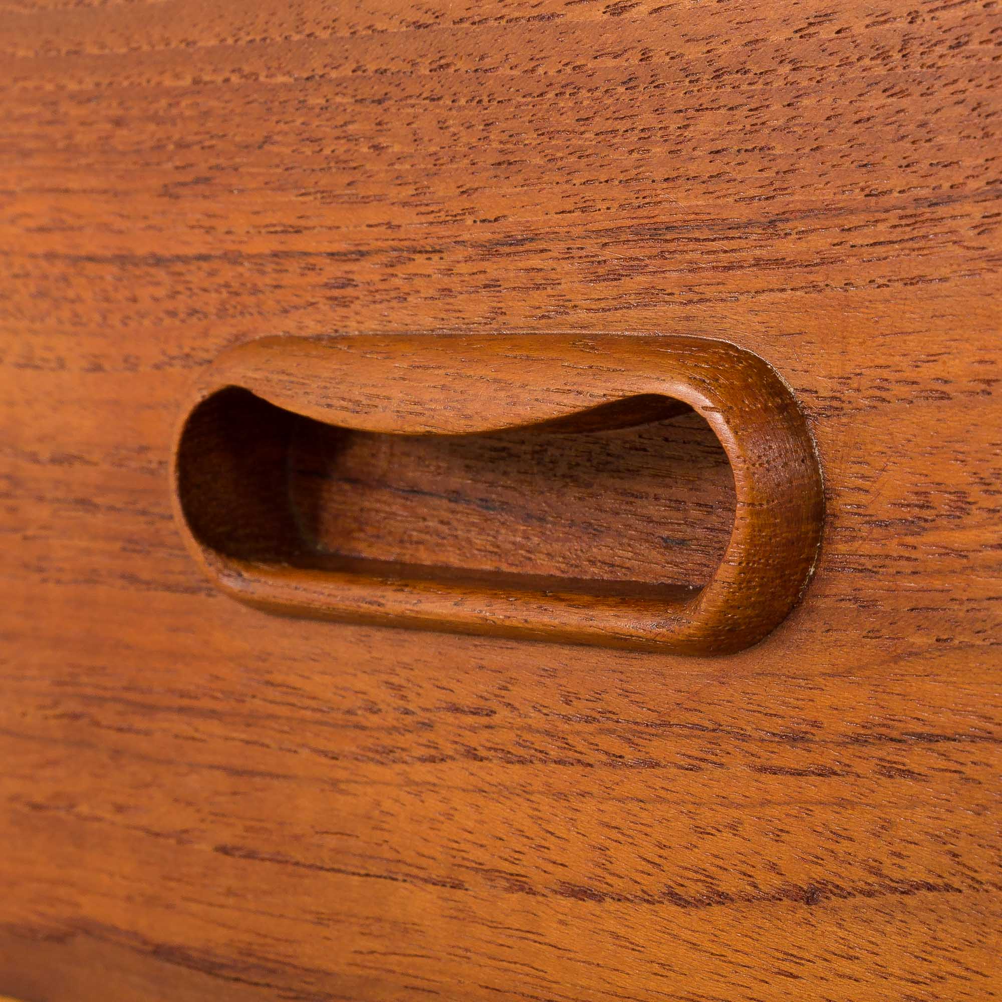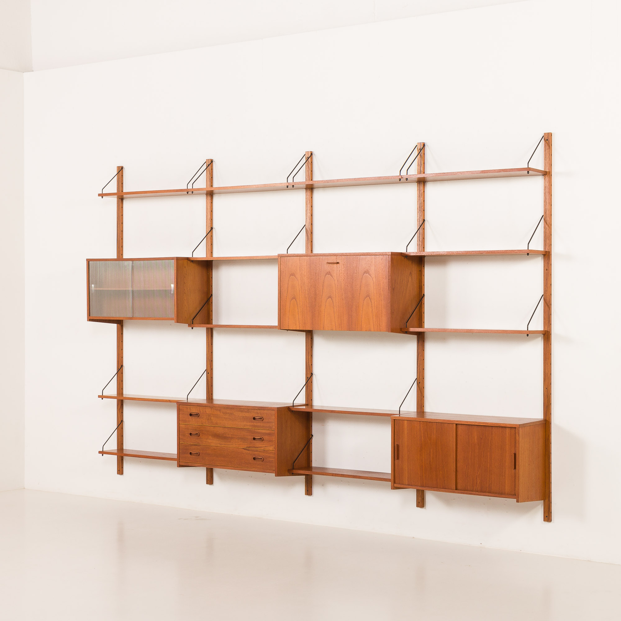 Duński, niezwykle funkcjonalny tekowy regał mid-century, bardzo przypominający projekty Poula Cadoviusa. Pochodzi z tego okresu gdy duńscy stolarze produkowali równolegle z Cadoviusem. Charakteryzuje się pięknym usłojeniem drewna zarówno na zewnątrz, jak i wewnątrz szafek. Zastosowanie wysokiej jakości drewna tekowego i forniru tekowego zapewnia trwałość i długowieczność mebla.