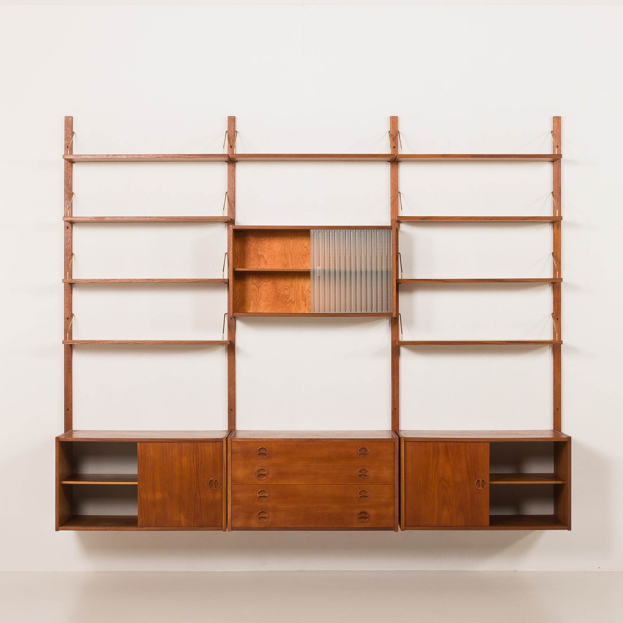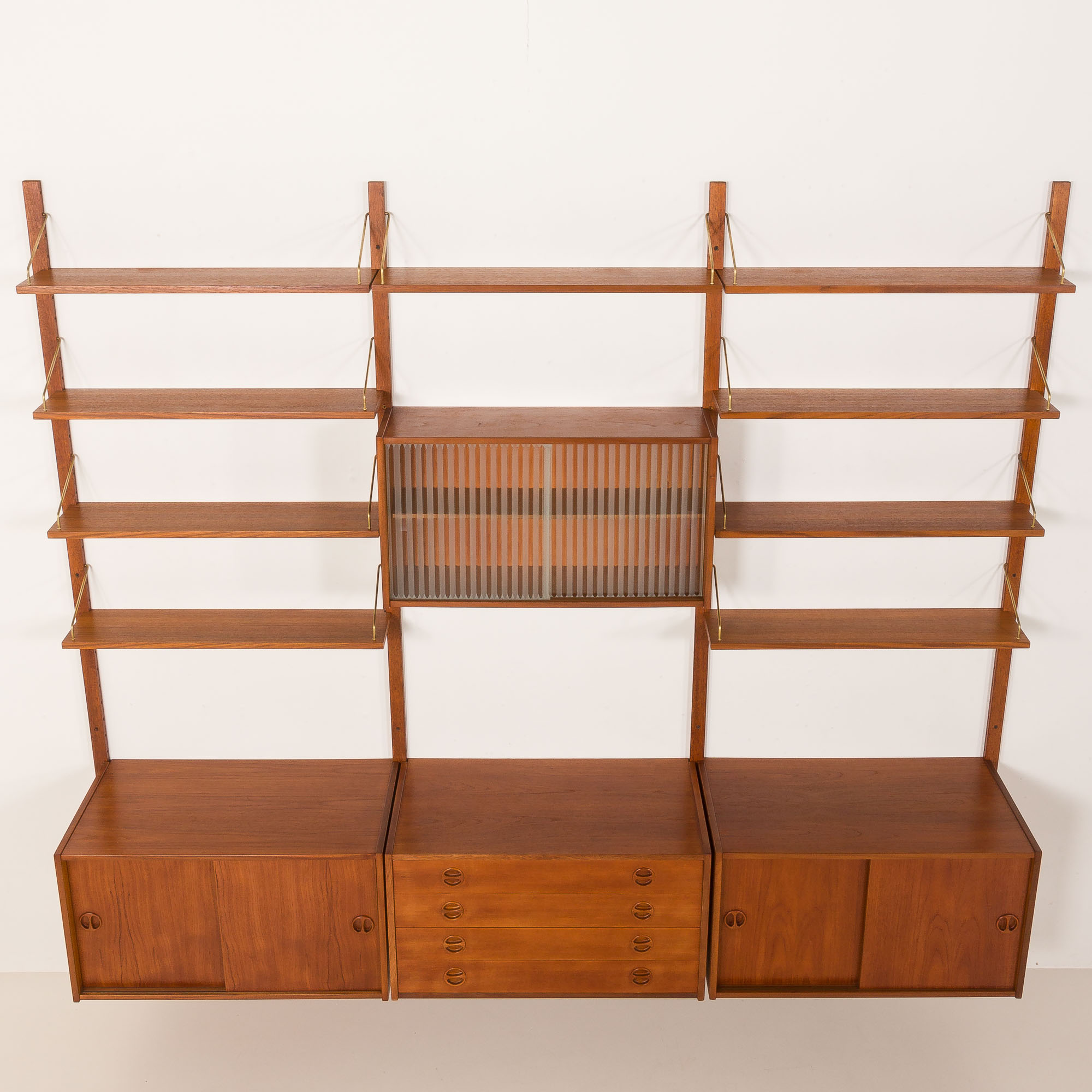 Ten elegancki, 3 sekcyjny zestaw ścienny z drewna tekowego w stylu mid-century został wykonany w Danii w latach 60. XX wieku. W wielu aspektach przypomina meble Poula Cadoviousa z tego samego okresu, zarówno rozwiązania techniczne, jak i jakość są bardzo podobne. Mebel łączy funkcjonalność z ponadczasową estetyką. Jest w pełni modułowy, a każdy element można zawiesić wyżej, niżej, a także zamieniać. Układ na zdjęciu jest tylko przykładem.