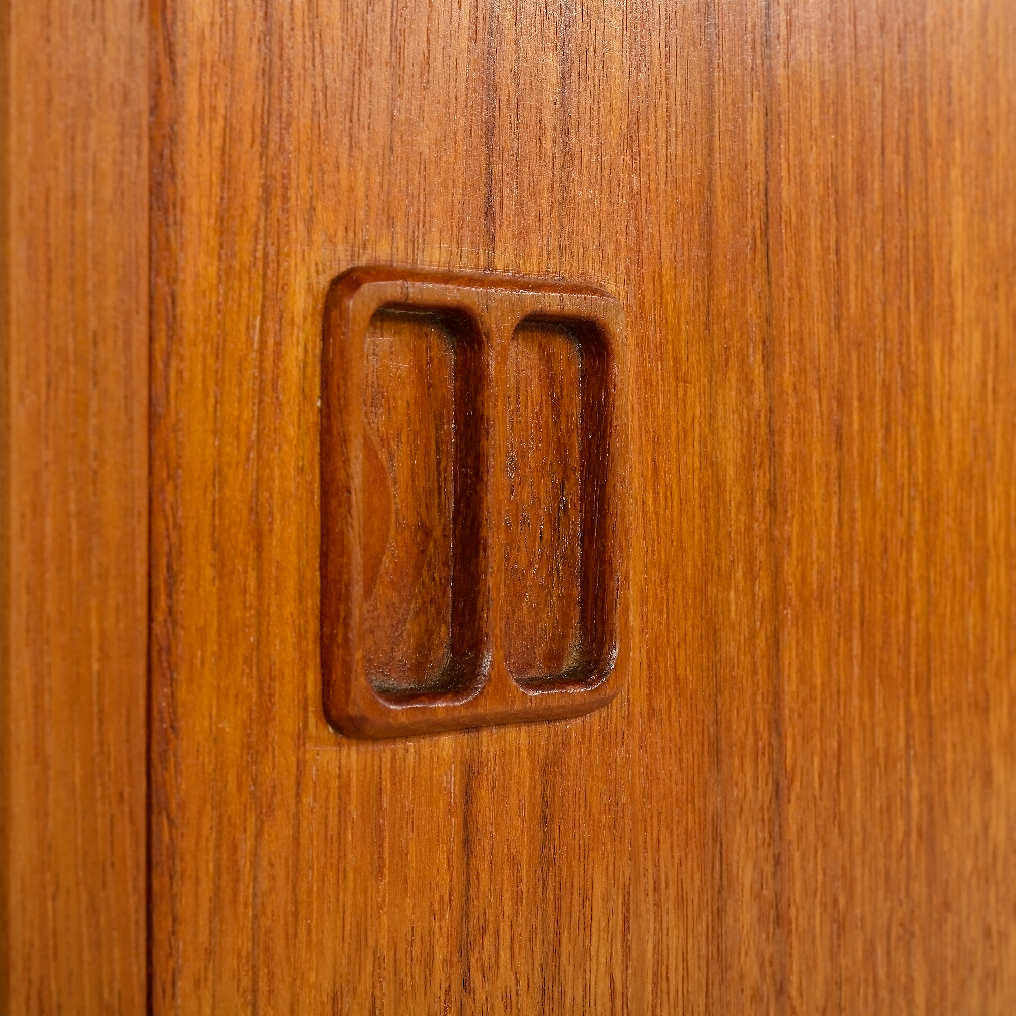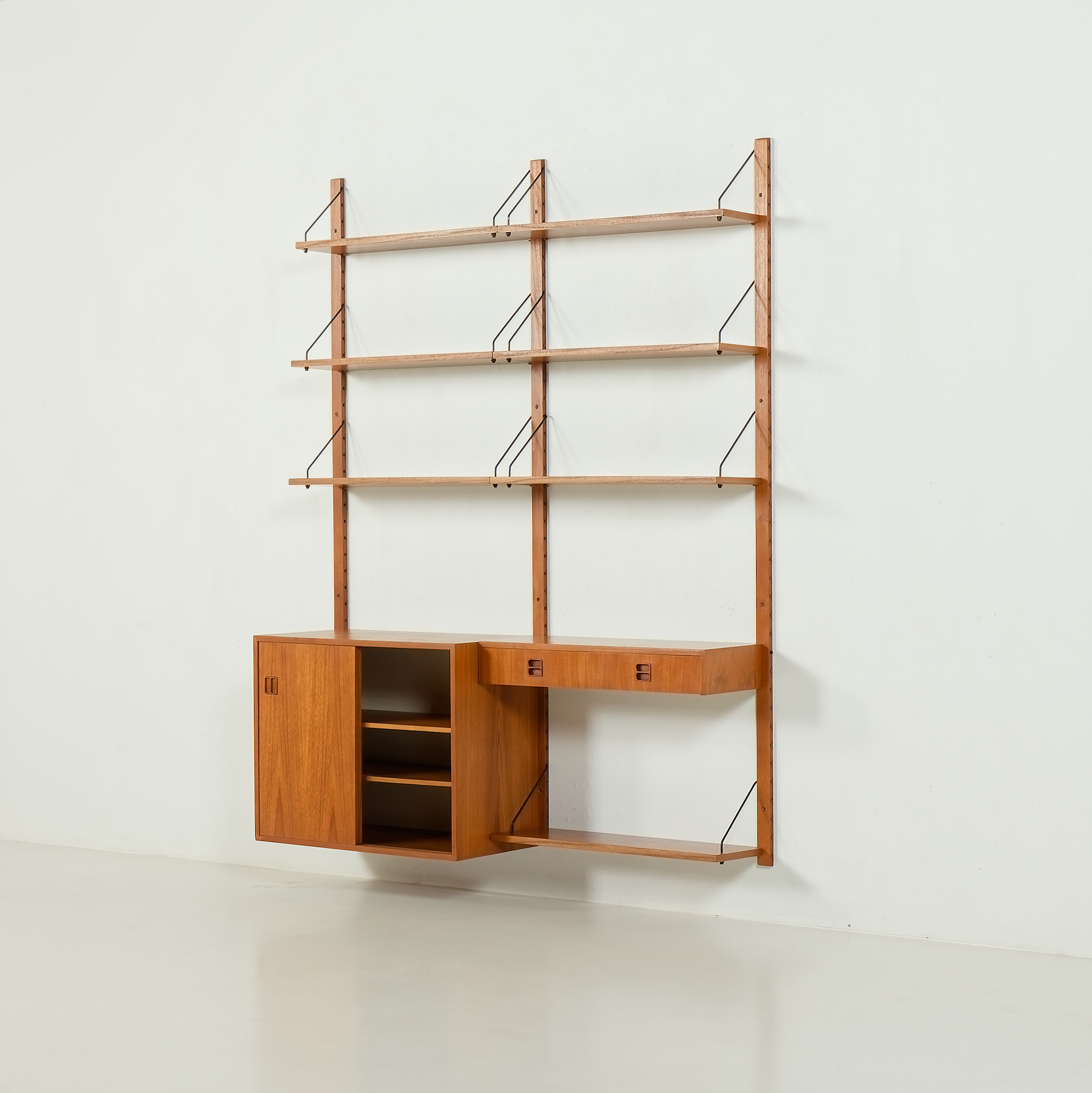 Ten skandynawski, tekowy vintage regał ścienny została wyprodukowany w Danii w latach 60. Posiada siedem półek, konsolę z dwiema szufladami oraz jedną dużą szafkę z przesuwnymi drzwiami.