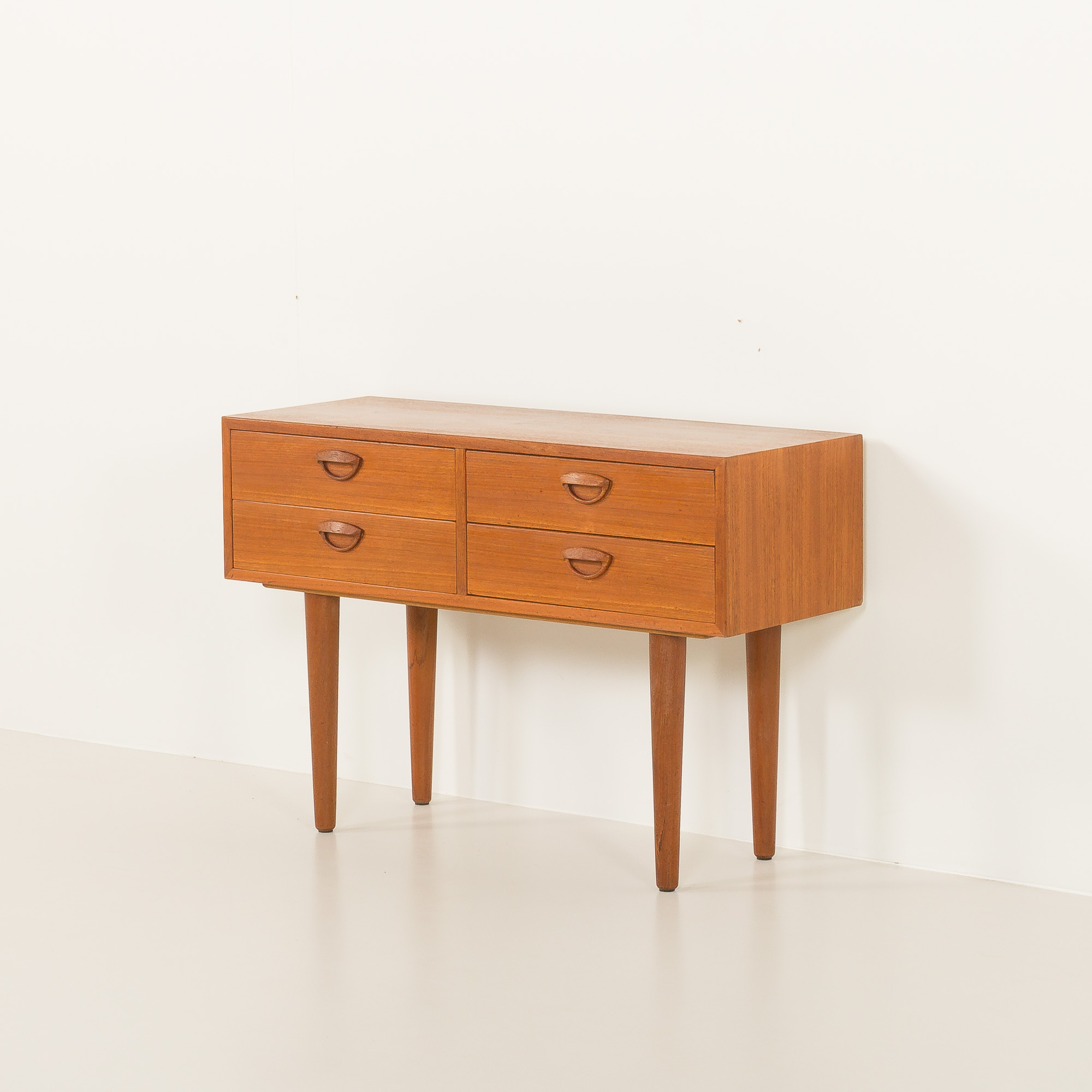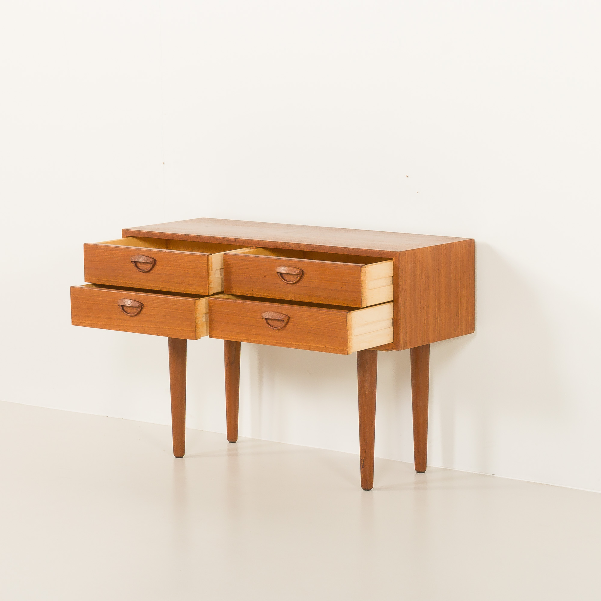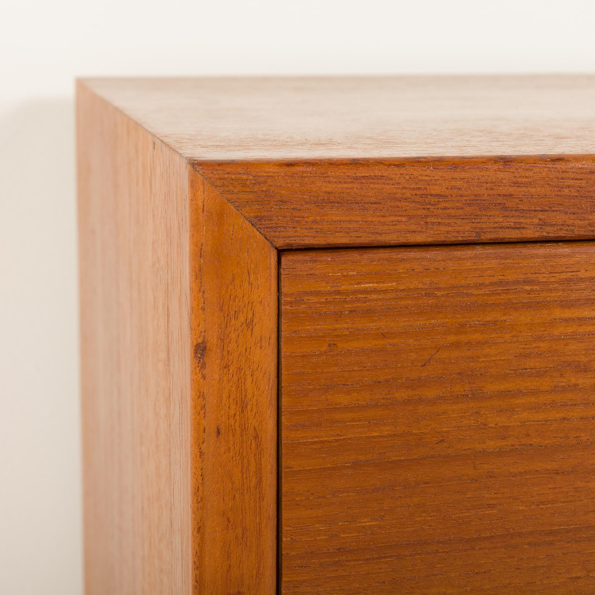 Konstrukcja uwydatnia starannie dobrane usłojenie forniru tekowego na froncie, uzupełnione szufladami z litego drewna z połączeniami na jaskółczy ogon – prawdziwy dowód wyjątkowego kunsztu duńskiego wzornictwa z połowy XX wieku. Smukłe, zwężające się nogi z litego teku nadają meblowi lekki i wyrafinowany wygląd.