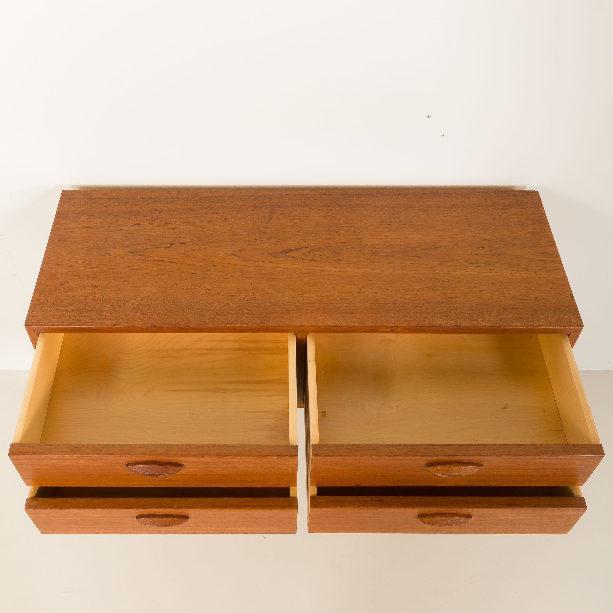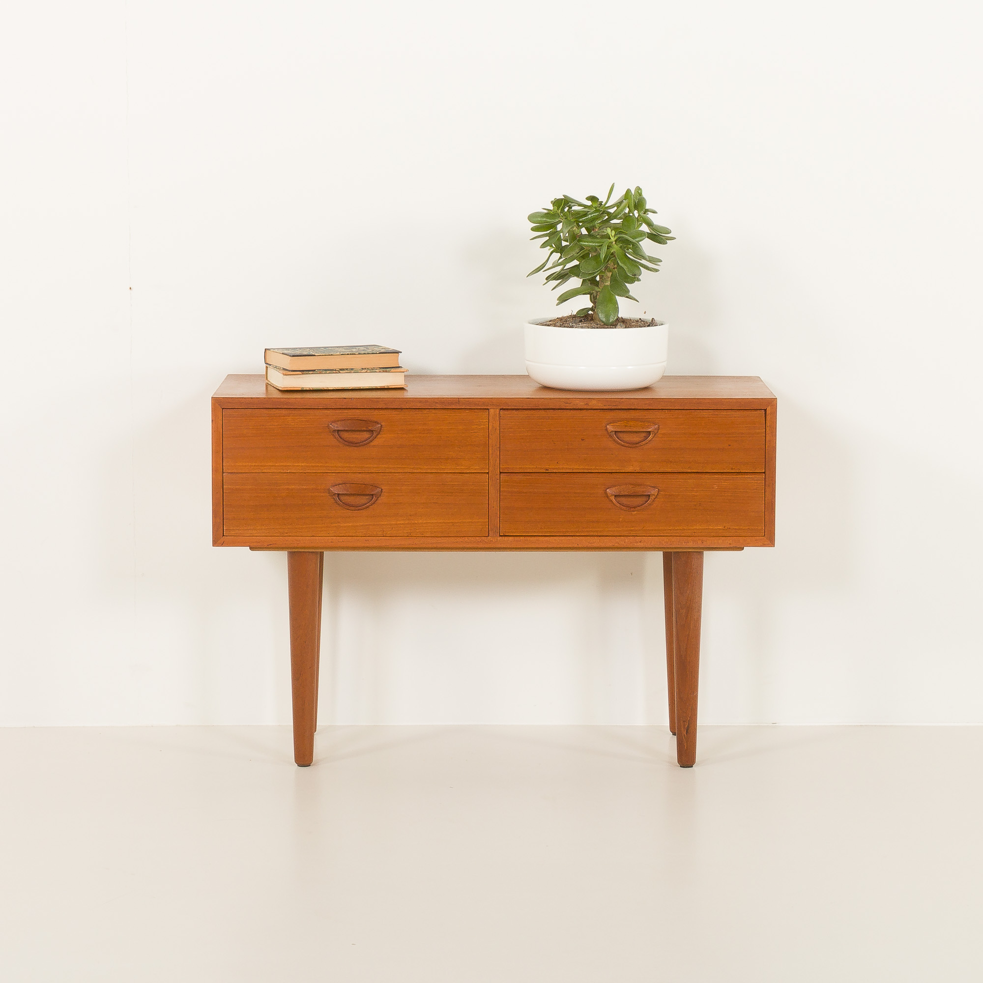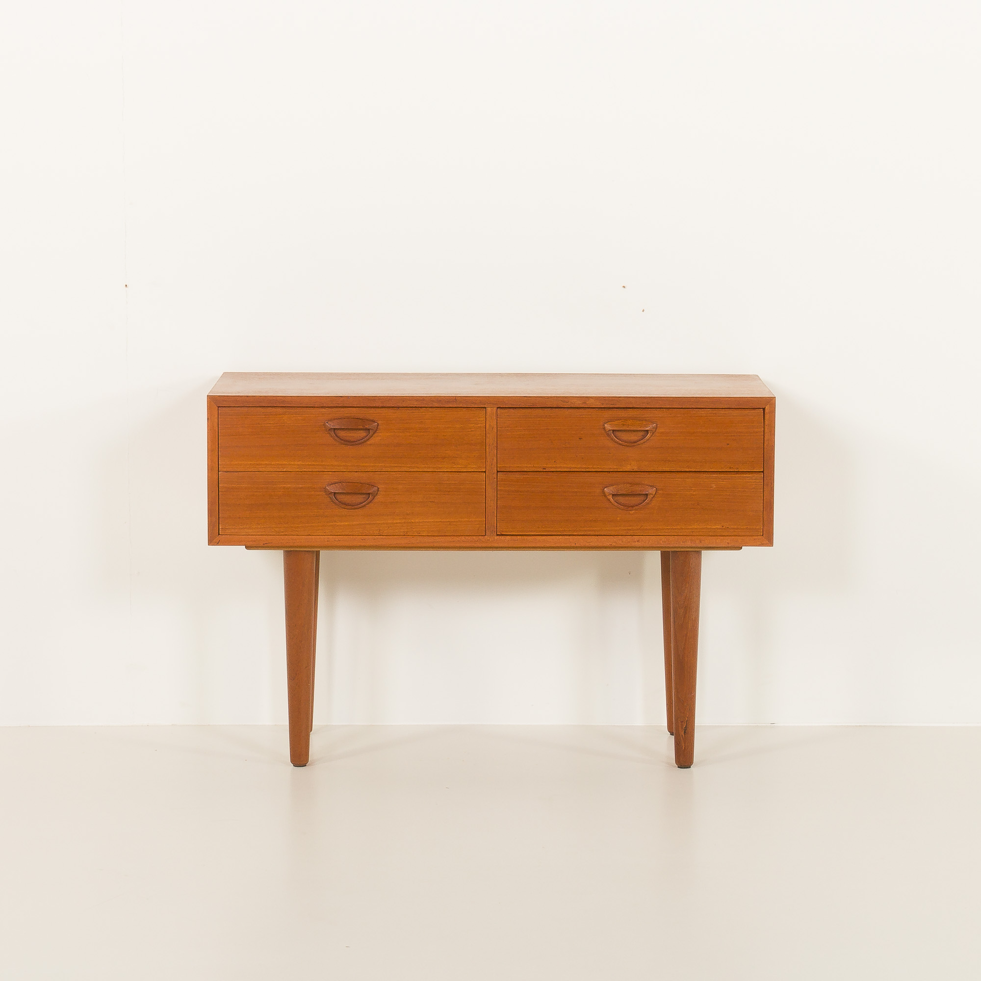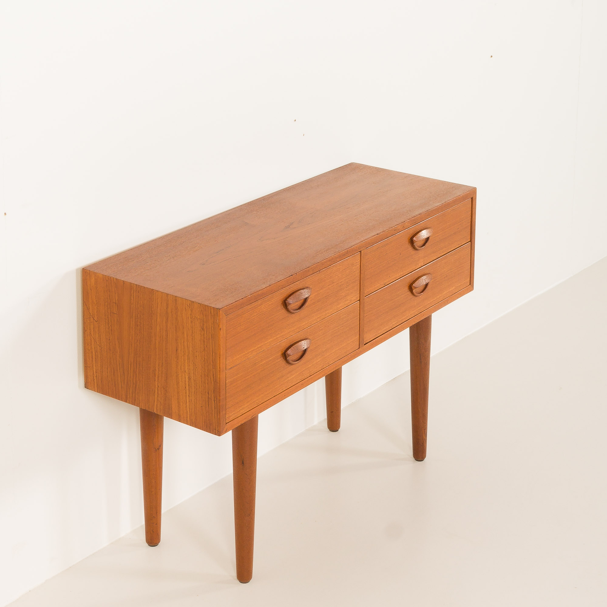Konstrukcja uwydatnia starannie dobrane usłojenie forniru tekowego na froncie, uzupełnione szufladami z litego drewna z połączeniami na jaskółczy ogon – prawdziwy dowód wyjątkowego kunsztu duńskiego wzornictwa z połowy XX wieku. Smukłe, zwężające się nogi z litego teku nadają meblowi lekki i wyrafinowany wygląd.