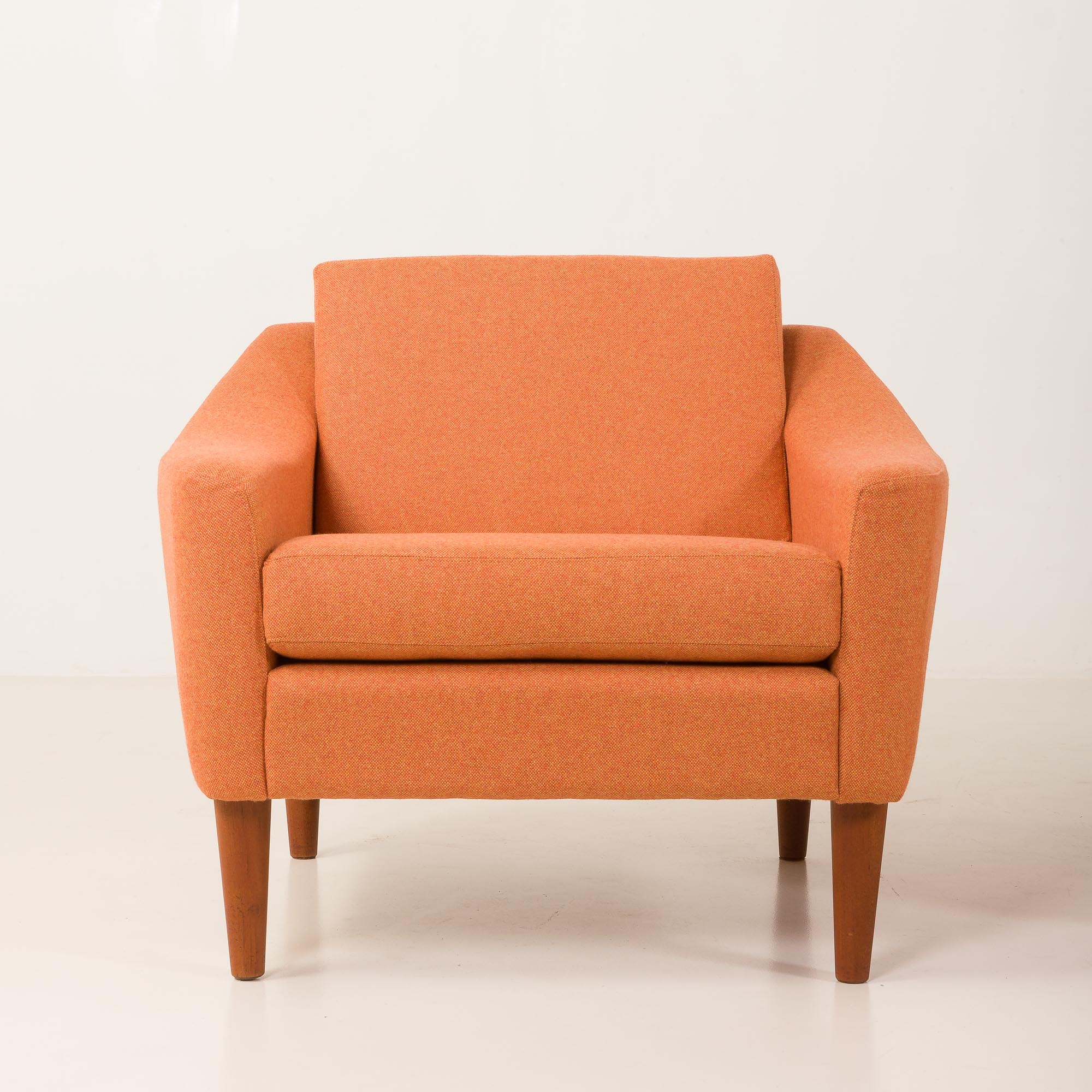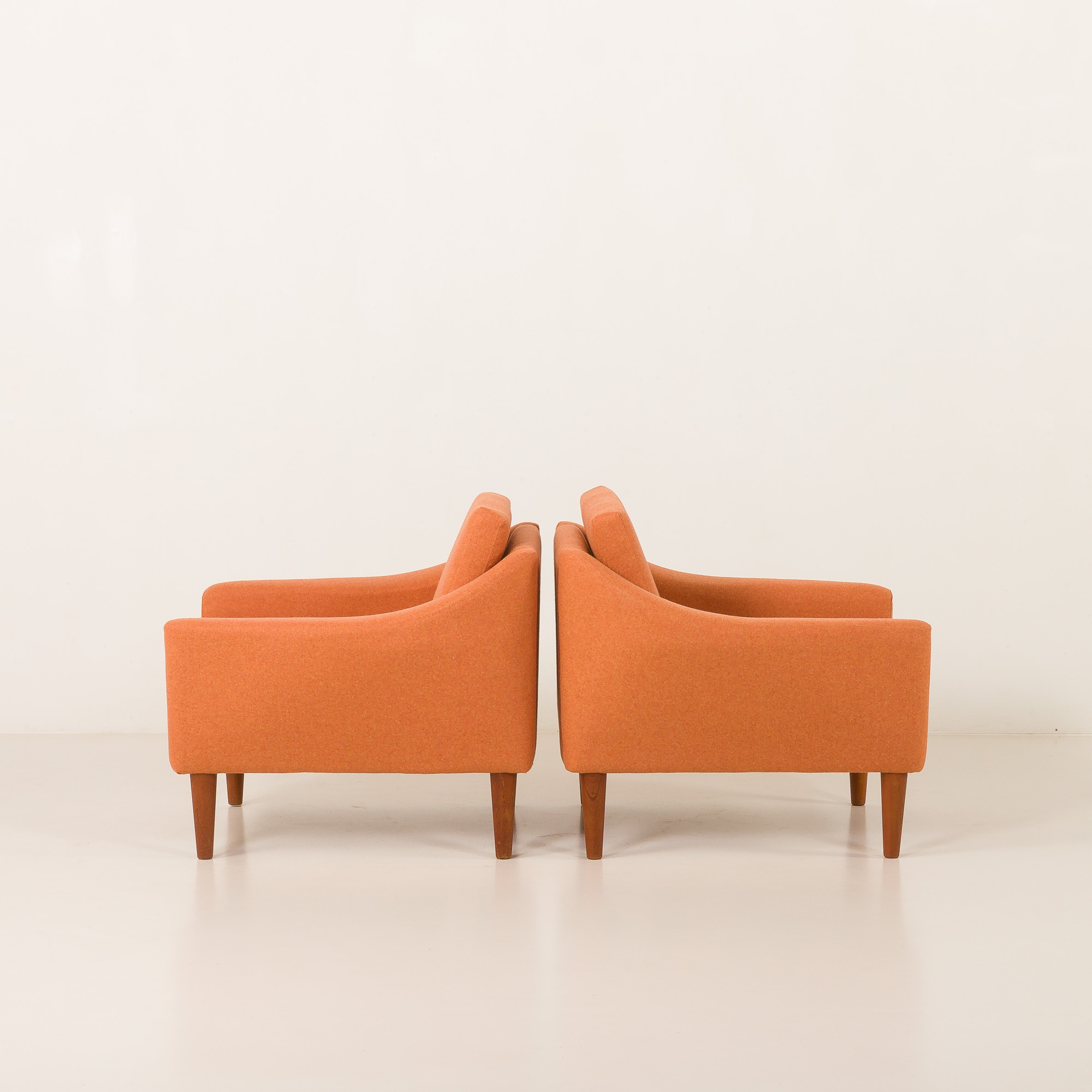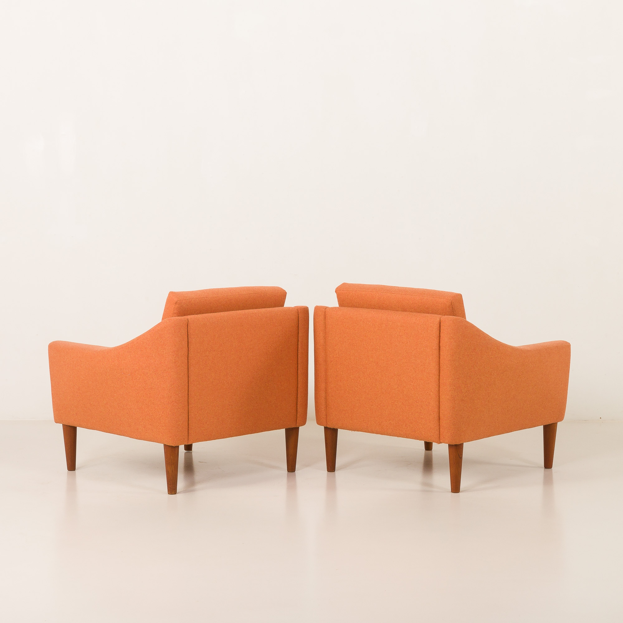 Piękna para foteli wypoczynkowych w stylu mid century, prawdopodobnie autorstwa projektanta Folke Ohlssona, wyprodukowanych w szwedzkiej manufakturze DUX w latach 60. XX wieku. Te wygodne fotele zostały odnowione, pokryte jasnopomarańczową wełną z recyklingu, oferując idealne połączenie skandynawskiego kunsztu rzemieślniczego vintage z nowoczesną, ekologiczną koncepcją. Ich sylwetka, proporcje i tapicerka w ciepłym odcieniu sprawiają, że stanowią przyciągający wzrok, a zarazem funkcjonalny dodatek do każdego współczesnego czy inspirowanego stylem vintage wnętrza.