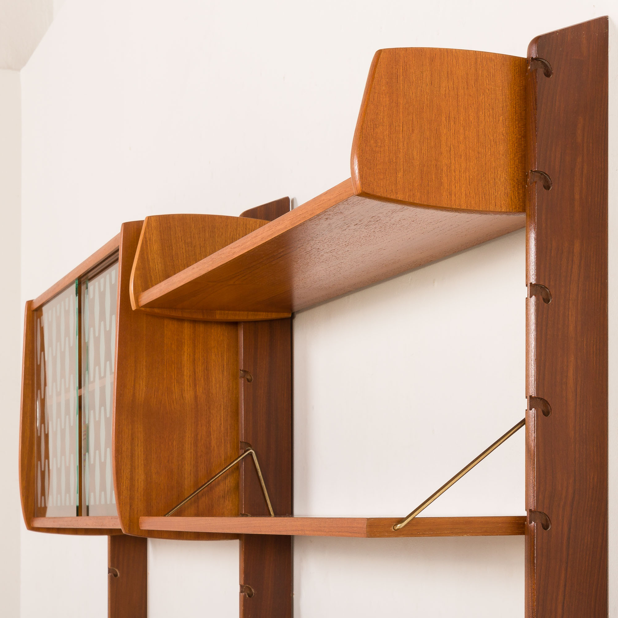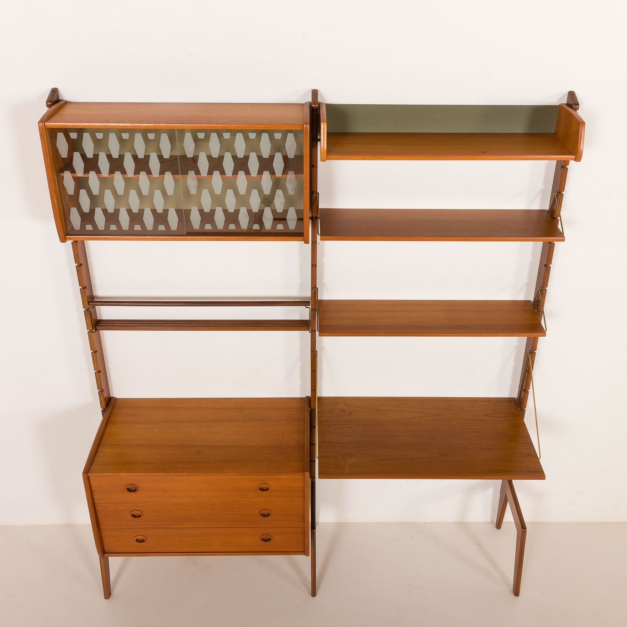 Zestaw składa się z praktycznej komody, biurka-półki, witrynki o charakterystycznym wzorze szkła oraz półki ekspozycyjnej na płyty winylowe, zdjęcia lub talerze. Lekko zaokrąglone szafki wpływają na spójny wizerunek mebla, a okazałe wsporniki sprawiają, że całość jest elegancka. Regał idealnie nadaje się do salonu, sypialni lub jadalni. Autentyczność zestawu potwierdza stempel „Made in Norway” z tyłu witrynki.