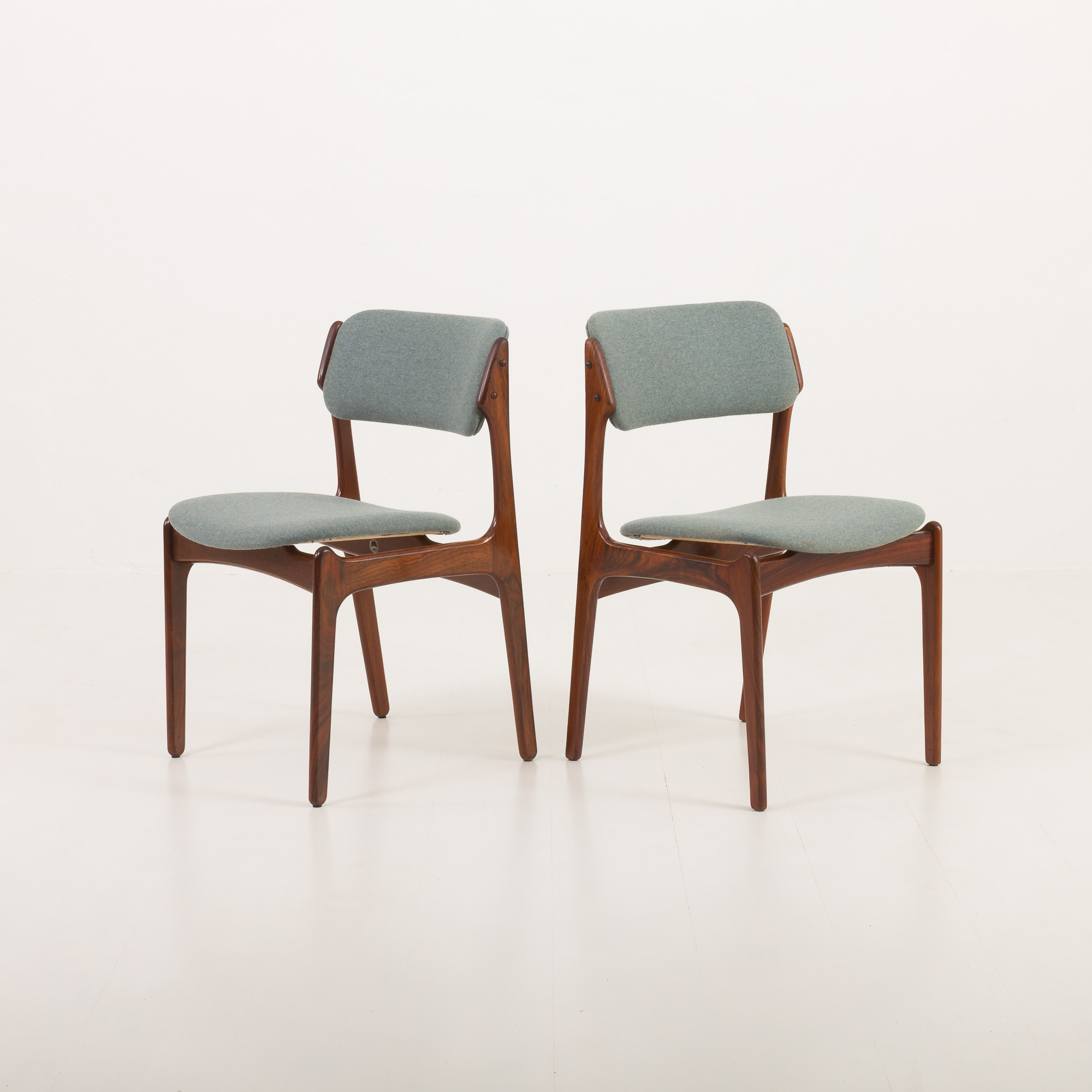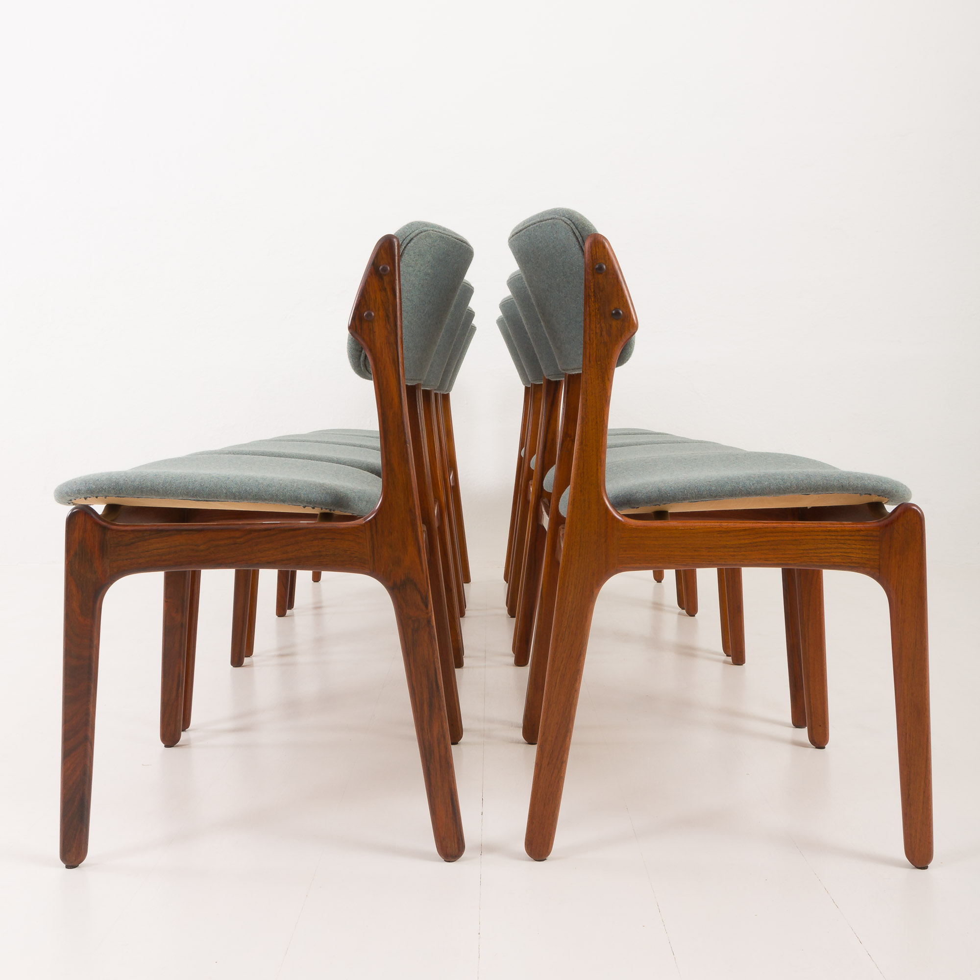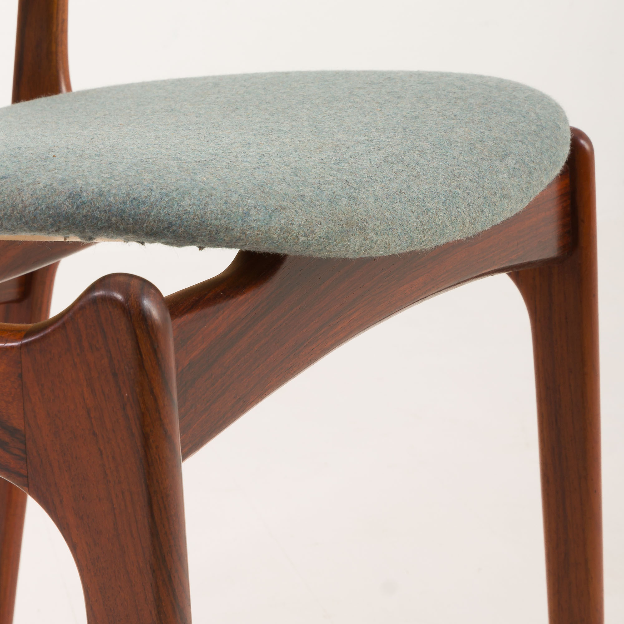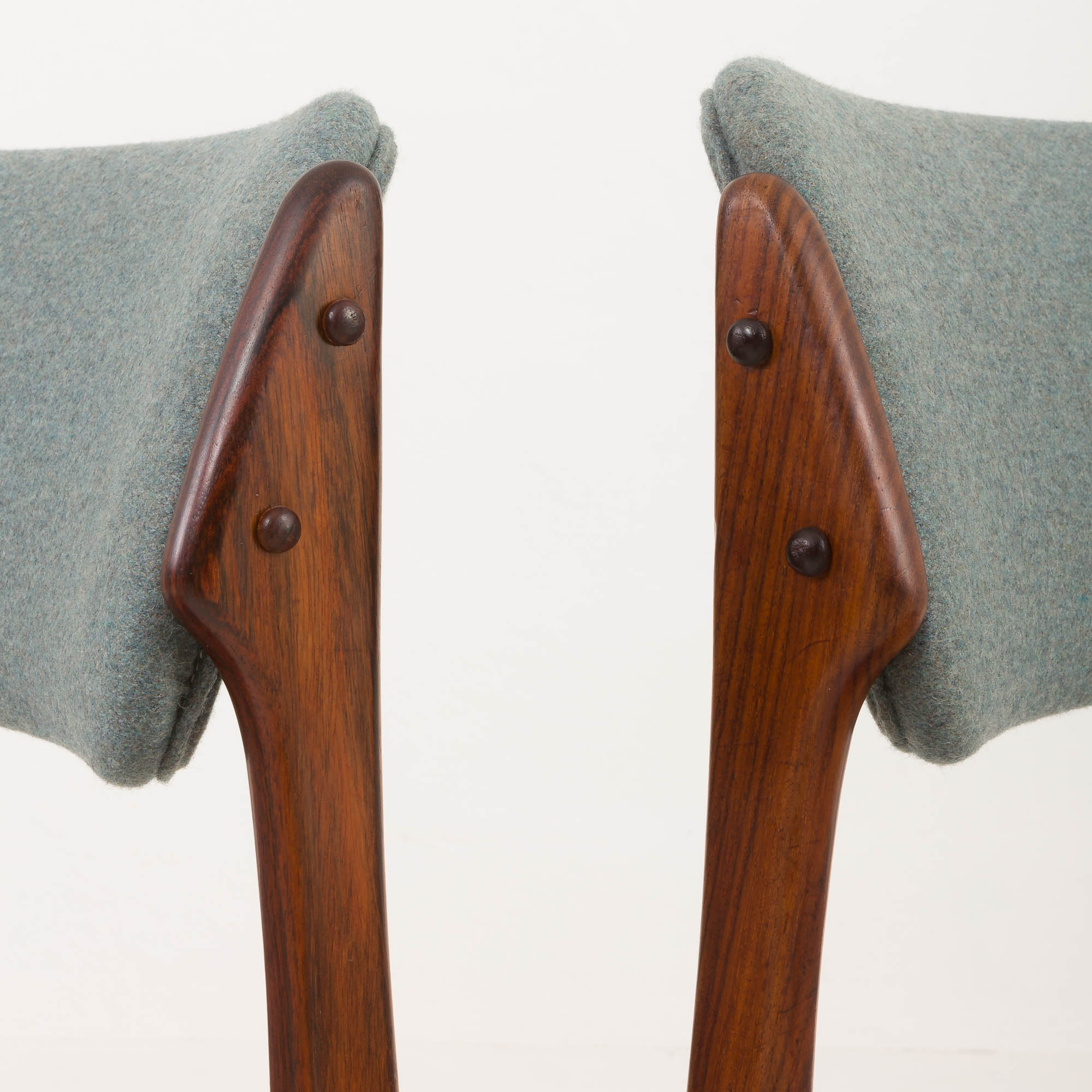 Krzesła są w doskonałym oryginalnym stanie, a nowa tapicerka przywróciła im dawne piękno. Ponieważ prezentowany zestaw został stworzony z dwóch innych, niezależnie znalezionych, istnieją minimalne różnice w wysokości, które są widoczne na zdjęciach. Drewniane ramy zostały oczyszczone i zakonserwowane profesjonalnymi środkami. Etykiety kontroli jakości duńskich producentów mebli potwierdzają autentyczność krzeseł.