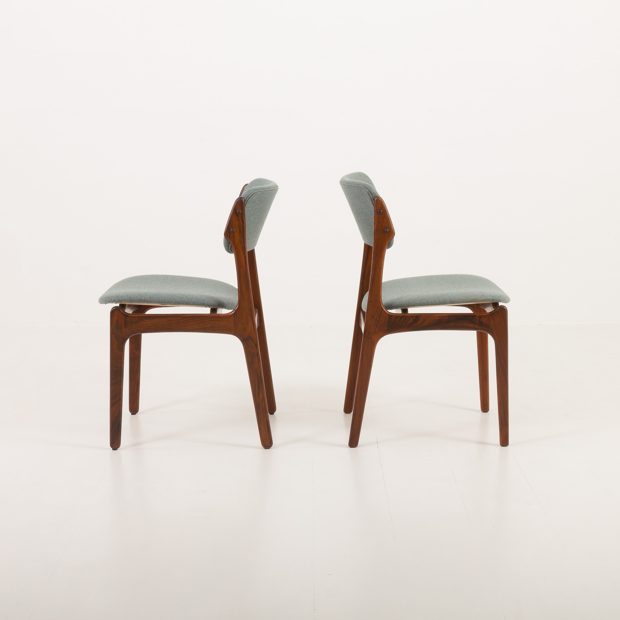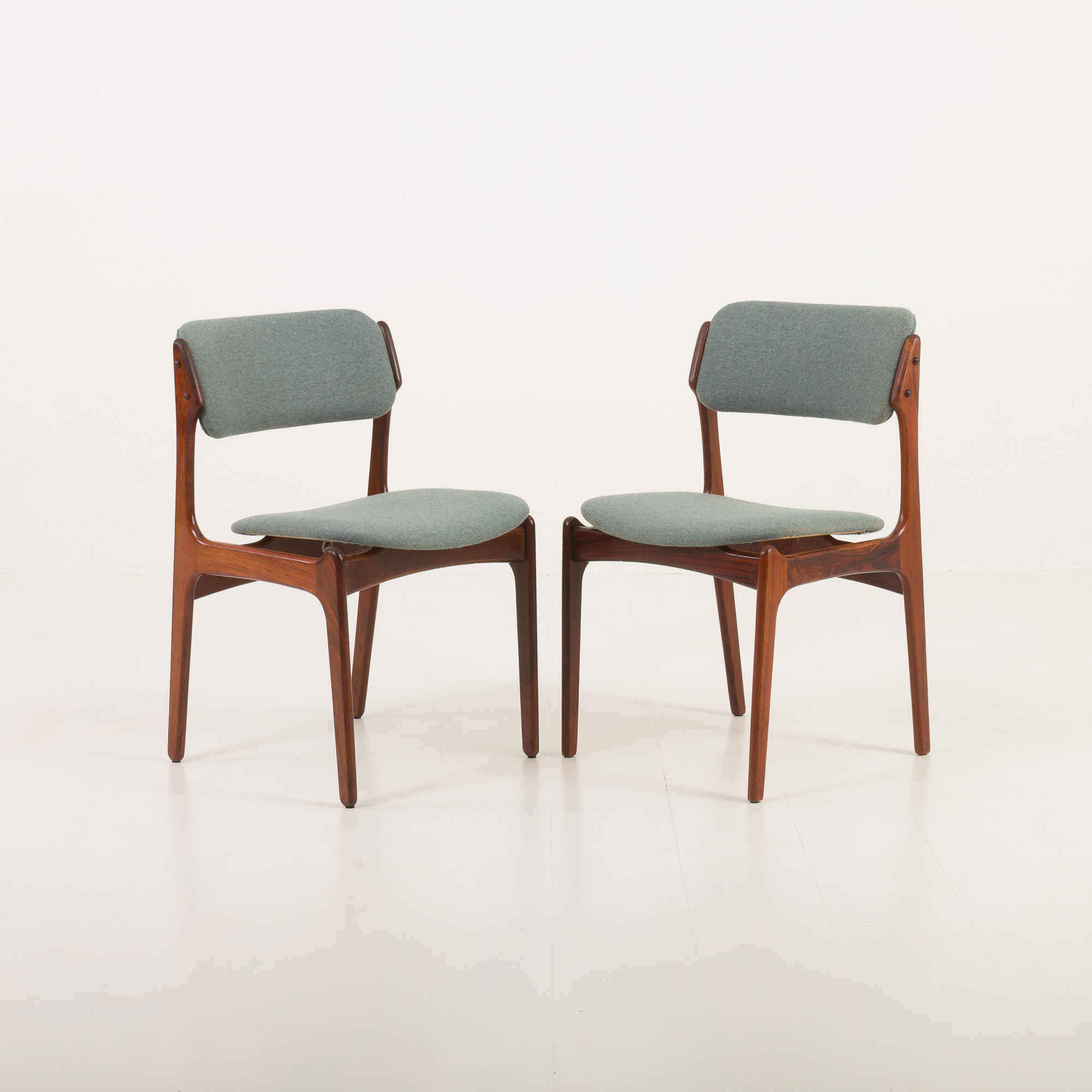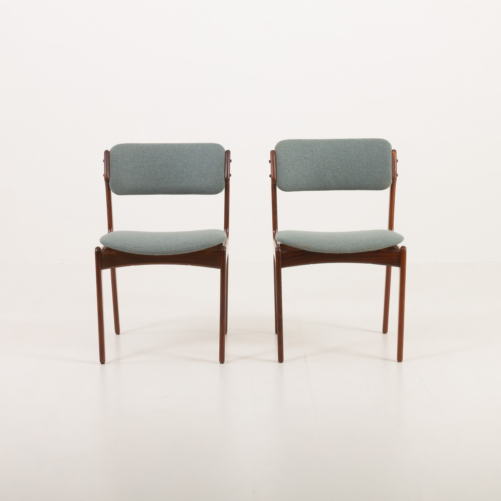Krzesła są w doskonałym oryginalnym stanie, a nowa tapicerka przywróciła im dawne piękno. Ponieważ prezentowany zestaw został stworzony z dwóch innych, niezależnie znalezionych, istnieją minimalne różnice w wysokości, które są widoczne na zdjęciach. Drewniane ramy zostały oczyszczone i zakonserwowane profesjonalnymi środkami. Etykiety kontroli jakości duńskich producentów mebli potwierdzają autentyczność krzeseł.
