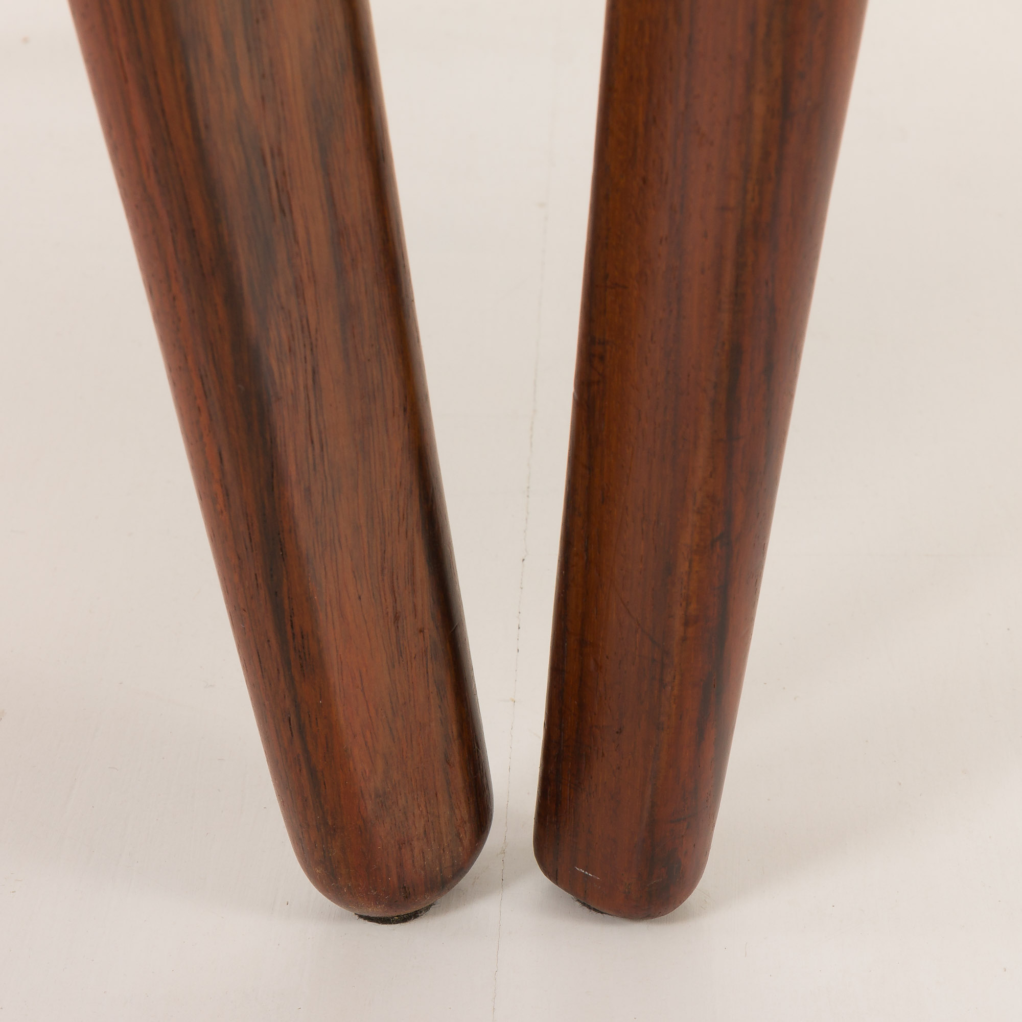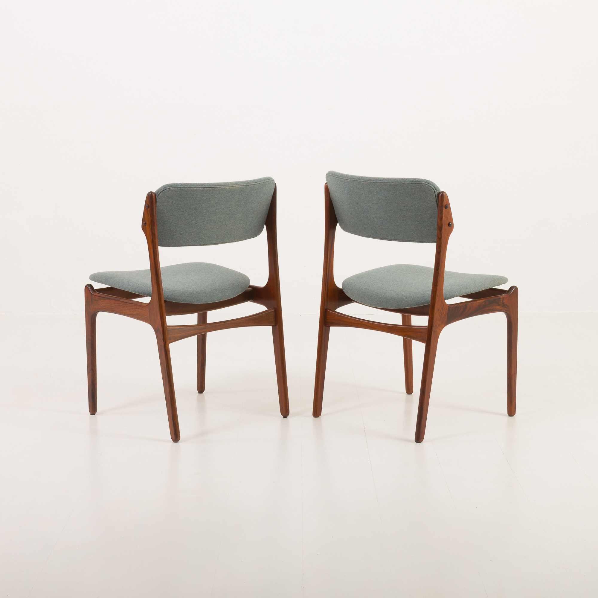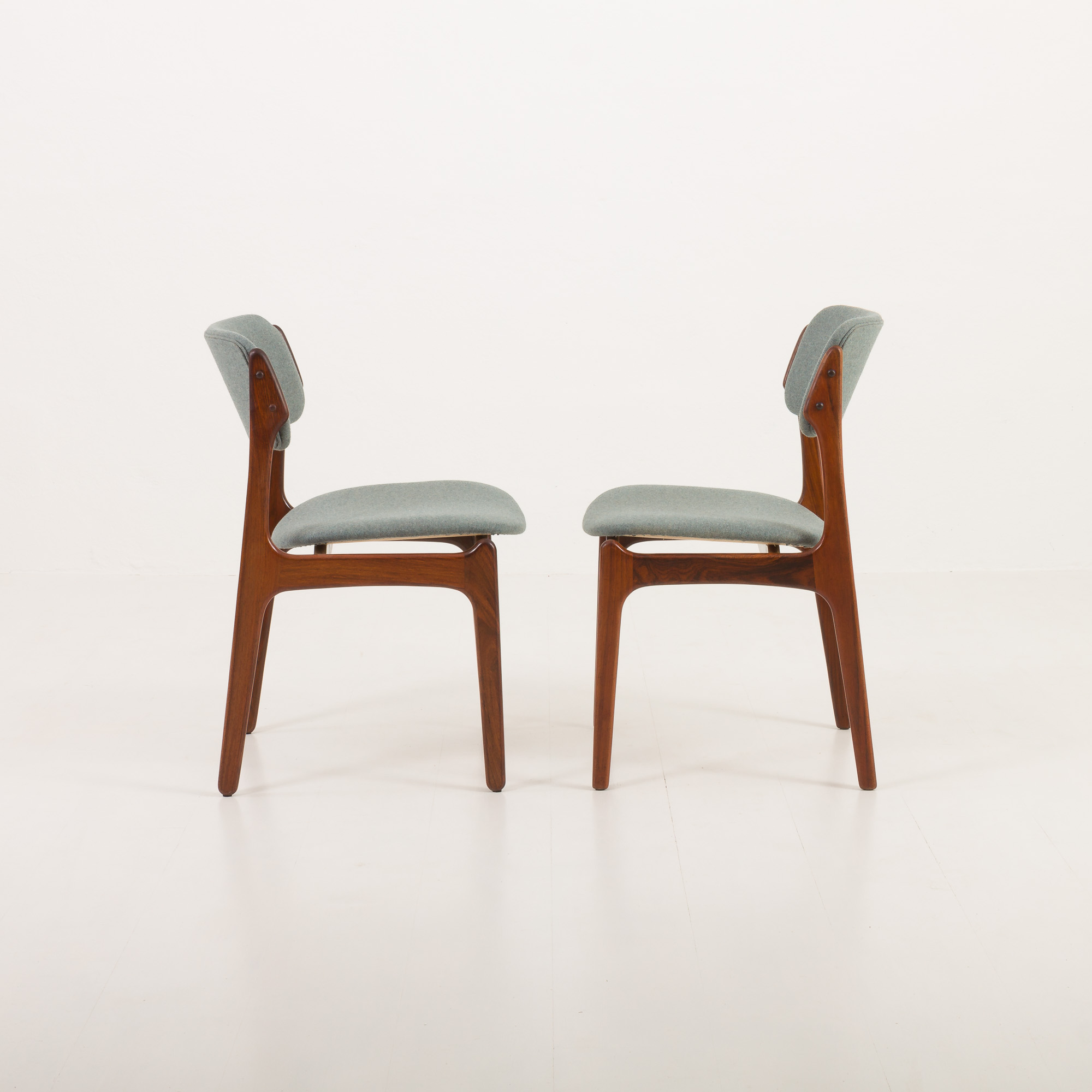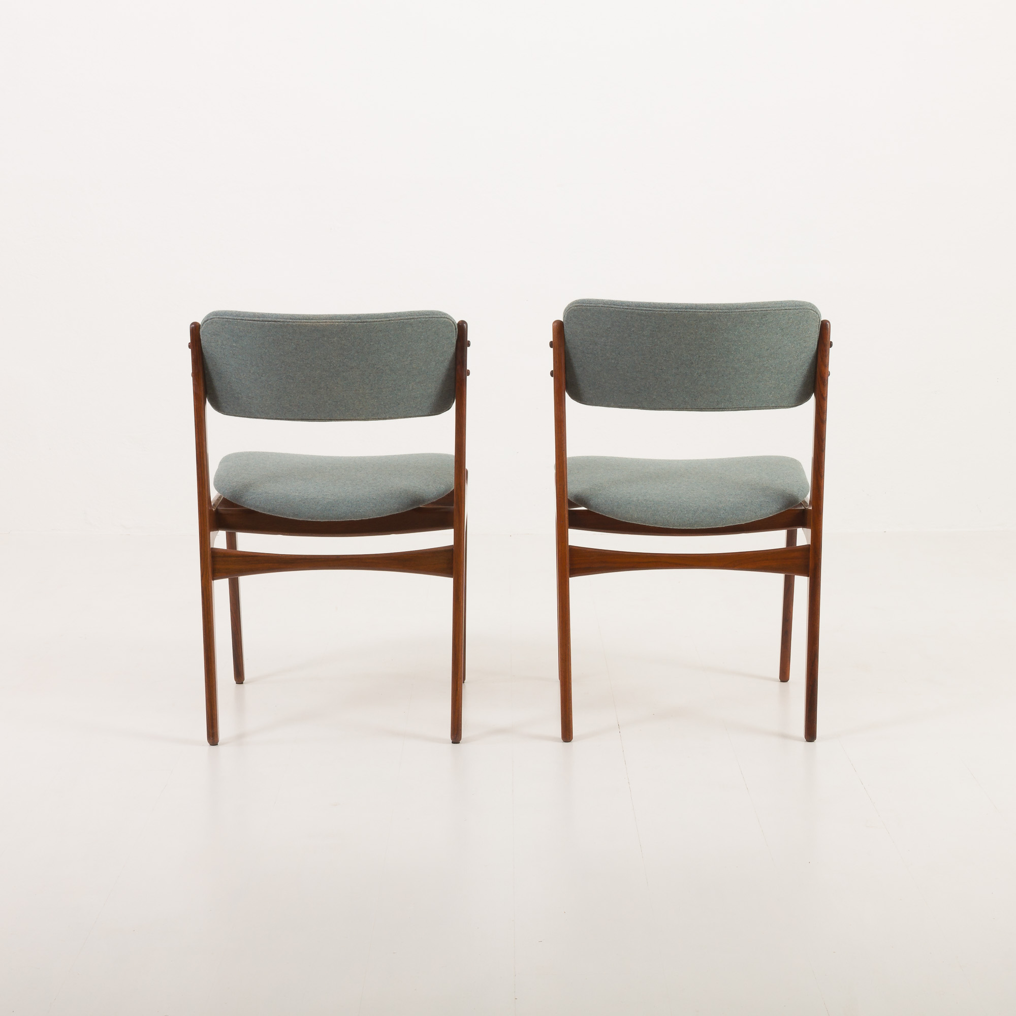 Krzesła są w doskonałym oryginalnym stanie, a nowa tapicerka przywróciła im dawne piękno. Ponieważ prezentowany zestaw został stworzony z dwóch innych, niezależnie znalezionych, istnieją minimalne różnice w wysokości, które są widoczne na zdjęciach. Drewniane ramy zostały oczyszczone i zakonserwowane profesjonalnymi środkami. Etykiety kontroli jakości duńskich producentów mebli potwierdzają autentyczność krzeseł.
