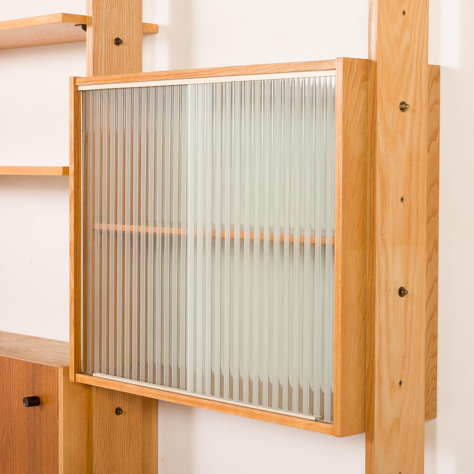 W skład zestawu wchodzi: jeden barek z opuszczanym frontem, który można wykorzystać jako ukryte biurko, komoda z 5 szufladami, pojemna szafka z wewnętrzną półką, dwie witryny z przeszklonymi drzwiami w paski oraz 6 otwartych półek.