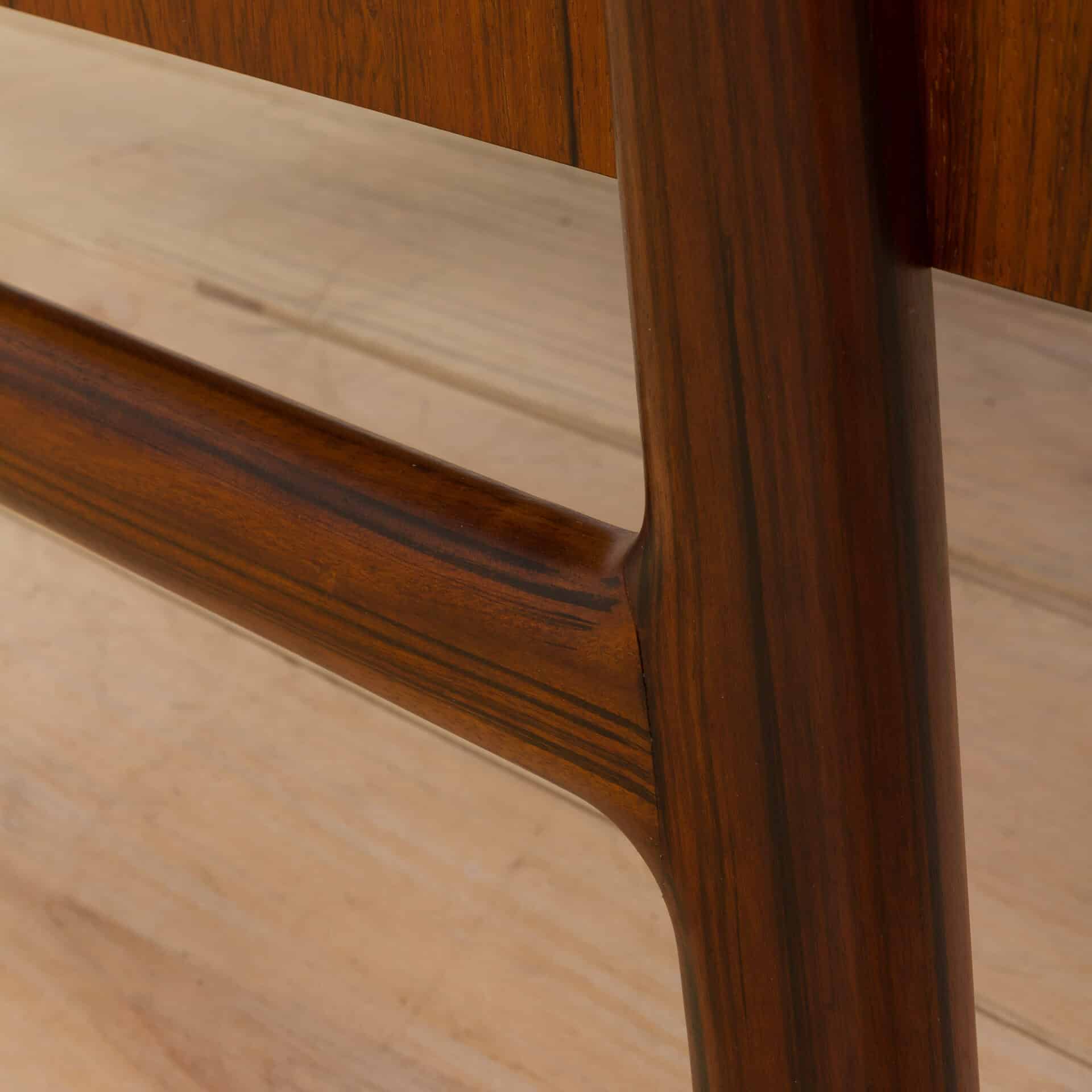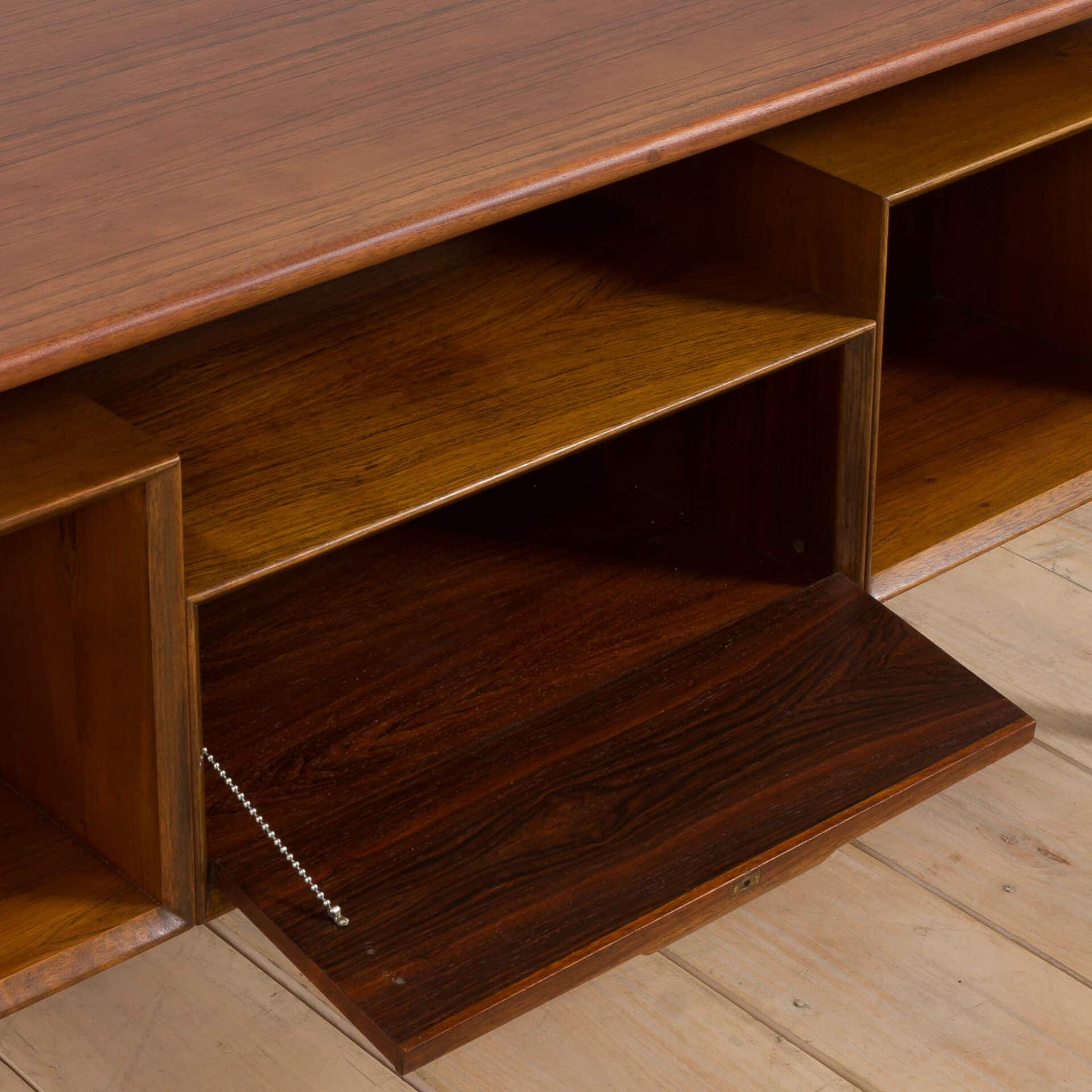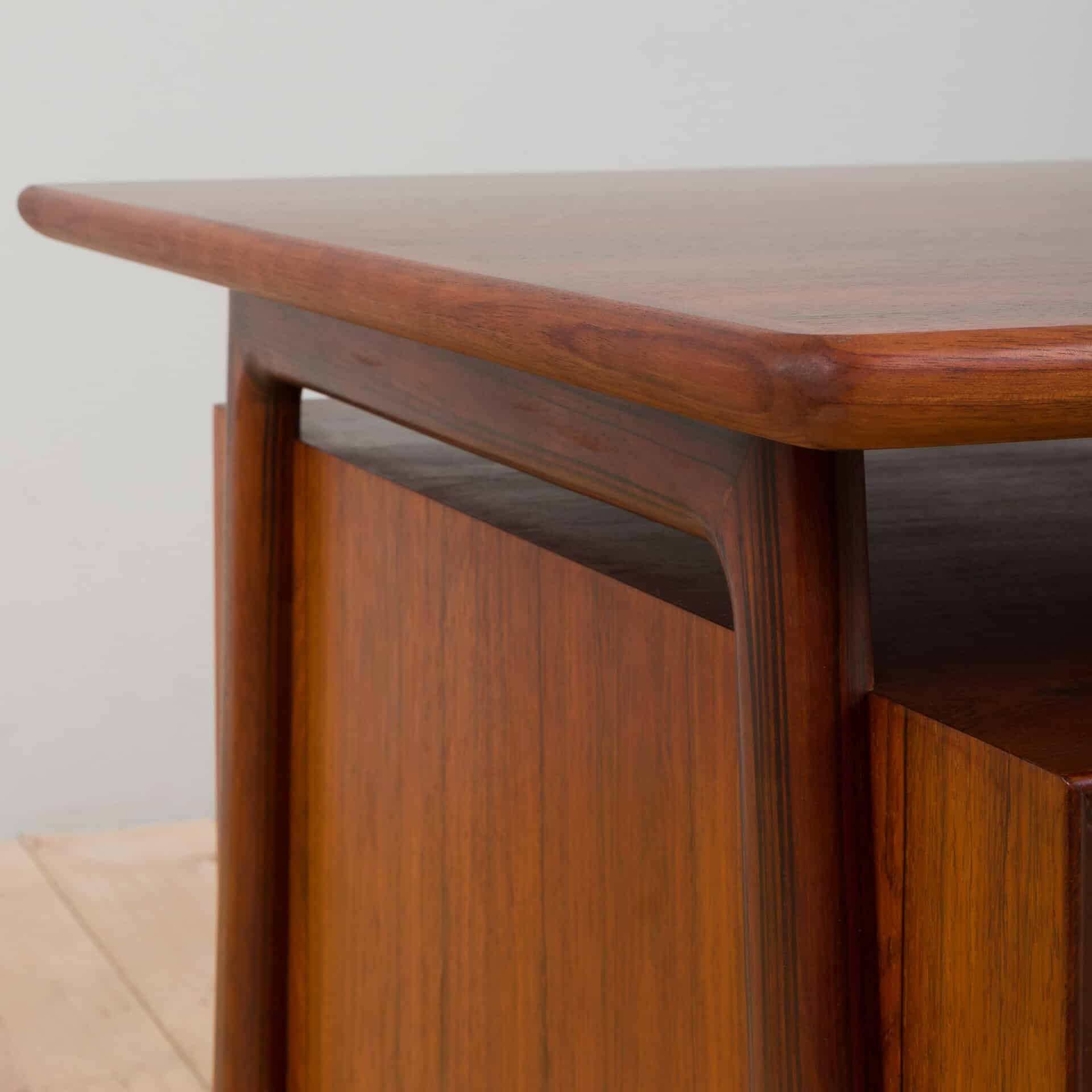Biurko palisandrowe, pokaźne, a zgrabne - to cała magia duńskiego wzornictwa mid century. Model nr 75, zaprojektowany przez Omann Jun w latach 50. Poza półkami z tyłu, miejsce do przechowywania znajdziemy w 6 szufladach, z czego 2 zamykane są oryginalnym kluczykiem. Nogi wykonano z litego drewna palisandrowego i oparto na nich blat biurka w taki sposób, że powstała dodatkowa przestrzeń na przechowywanie na skrzynkach z szufladkami. Na blacie widoczne są ślady użytkowania, jak ciemne małe plamy, czy minimalne rysy. Stan ogólny jak na mebel z lat 50. świetny.