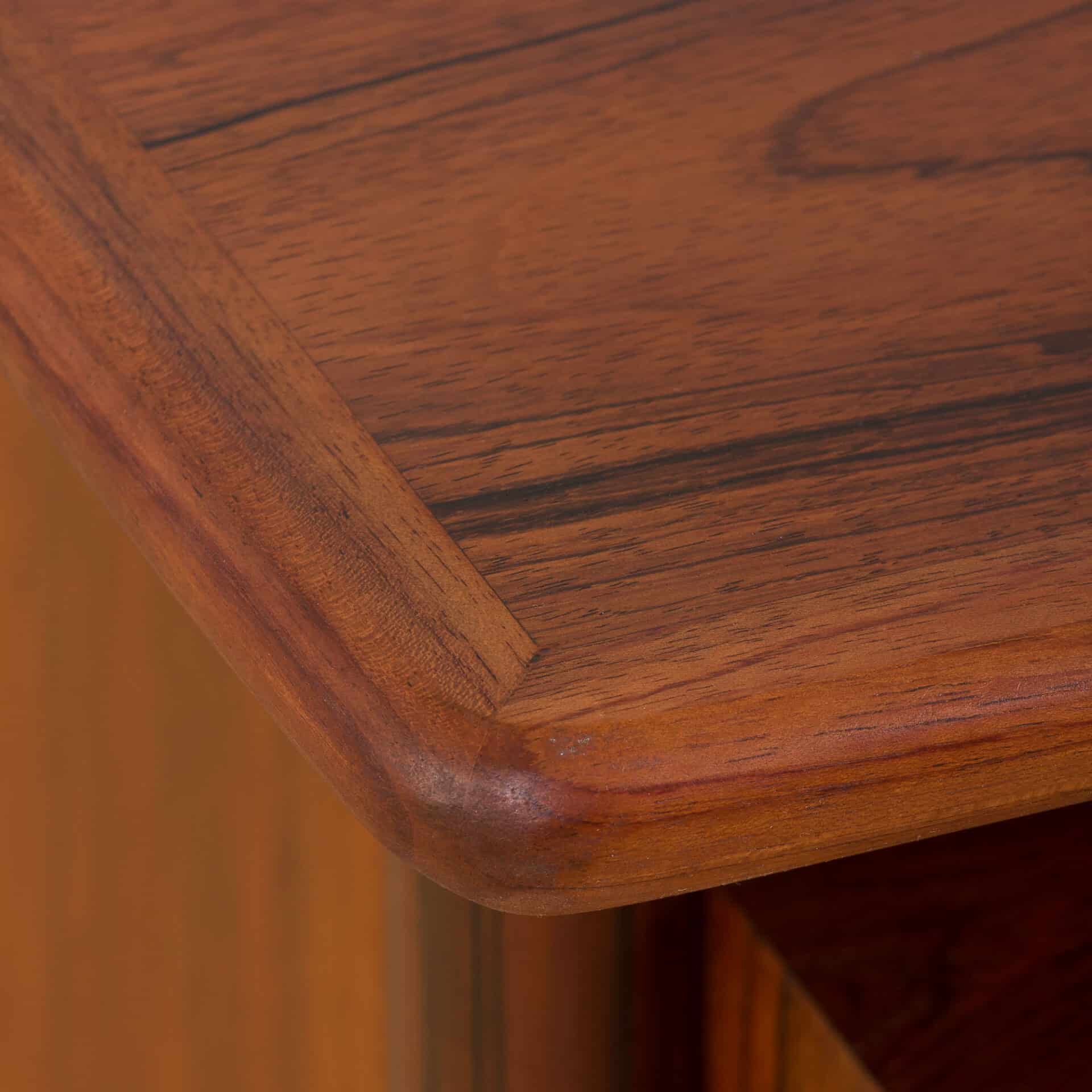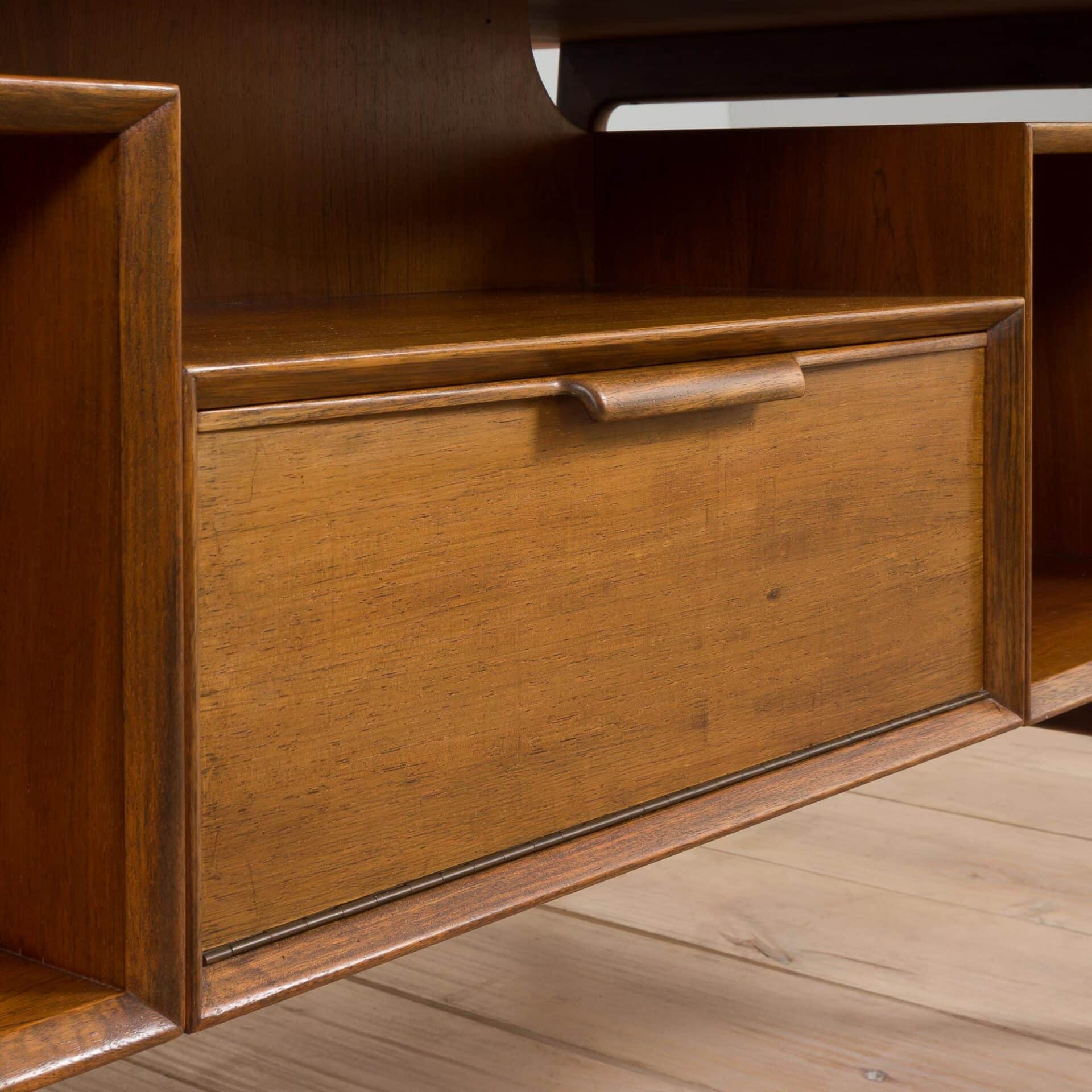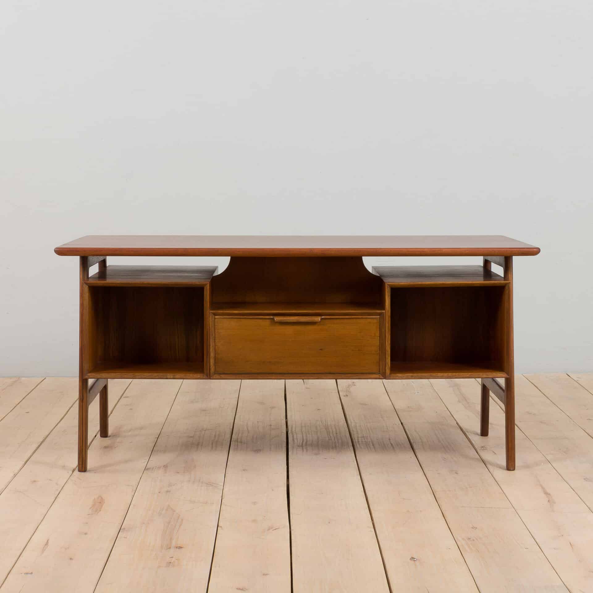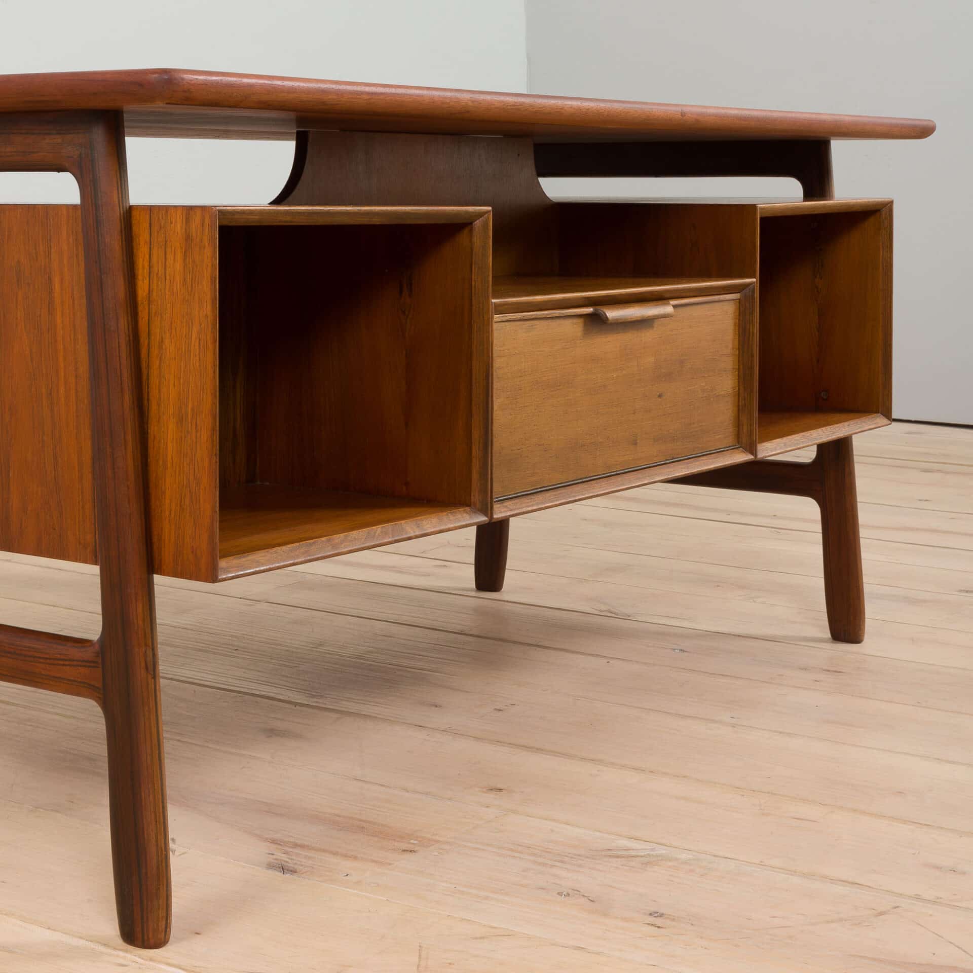 Biurko palisandrowe, pokaźne, a zgrabne - to cała magia duńskiego wzornictwa mid century. Model nr 75, zaprojektowany przez Omann Jun w latach 50. Poza półkami z tyłu, miejsce do przechowywania znajdziemy w 6 szufladach, z czego 2 zamykane są oryginalnym kluczykiem. Nogi wykonano z litego drewna palisandrowego i oparto na nich blat biurka w taki sposób, że powstała dodatkowa przestrzeń na przechowywanie na skrzynkach z szufladkami. Na blacie widoczne są ślady użytkowania, jak ciemne małe plamy, czy minimalne rysy. Stan ogólny jak na mebel z lat 50. świetny.