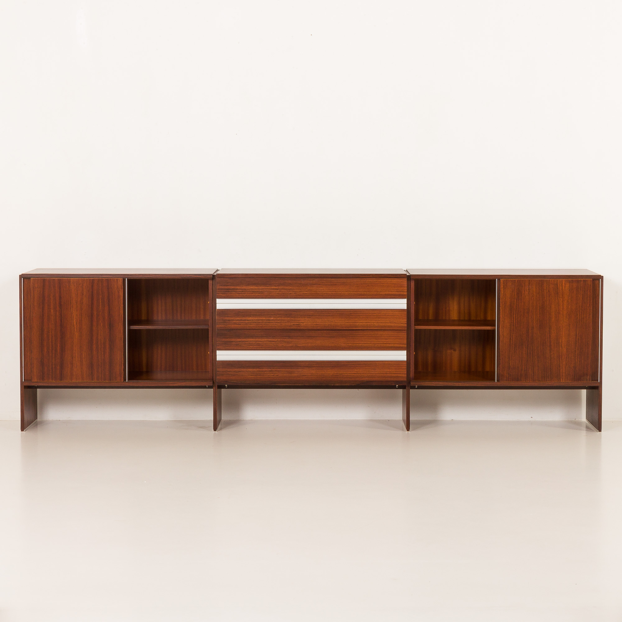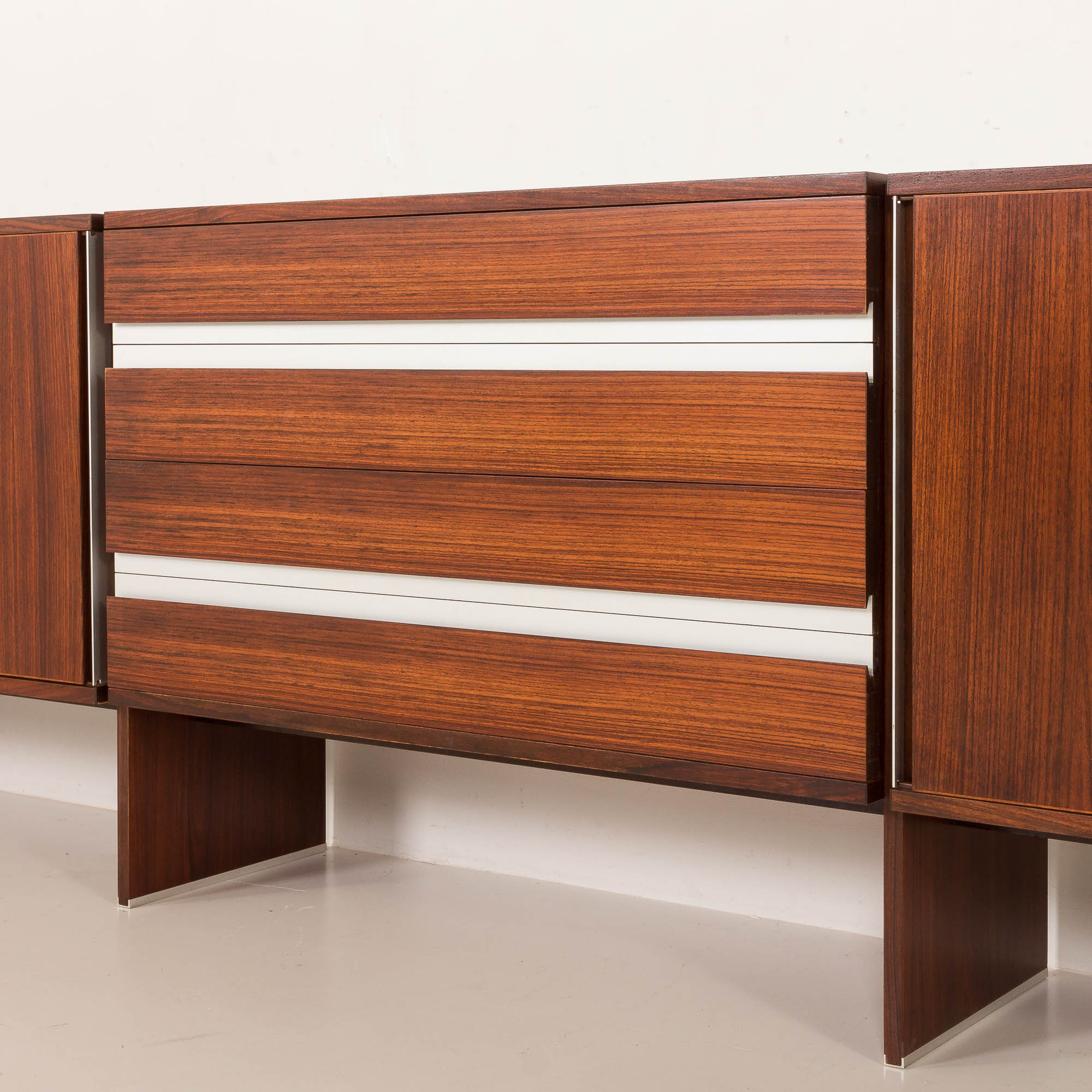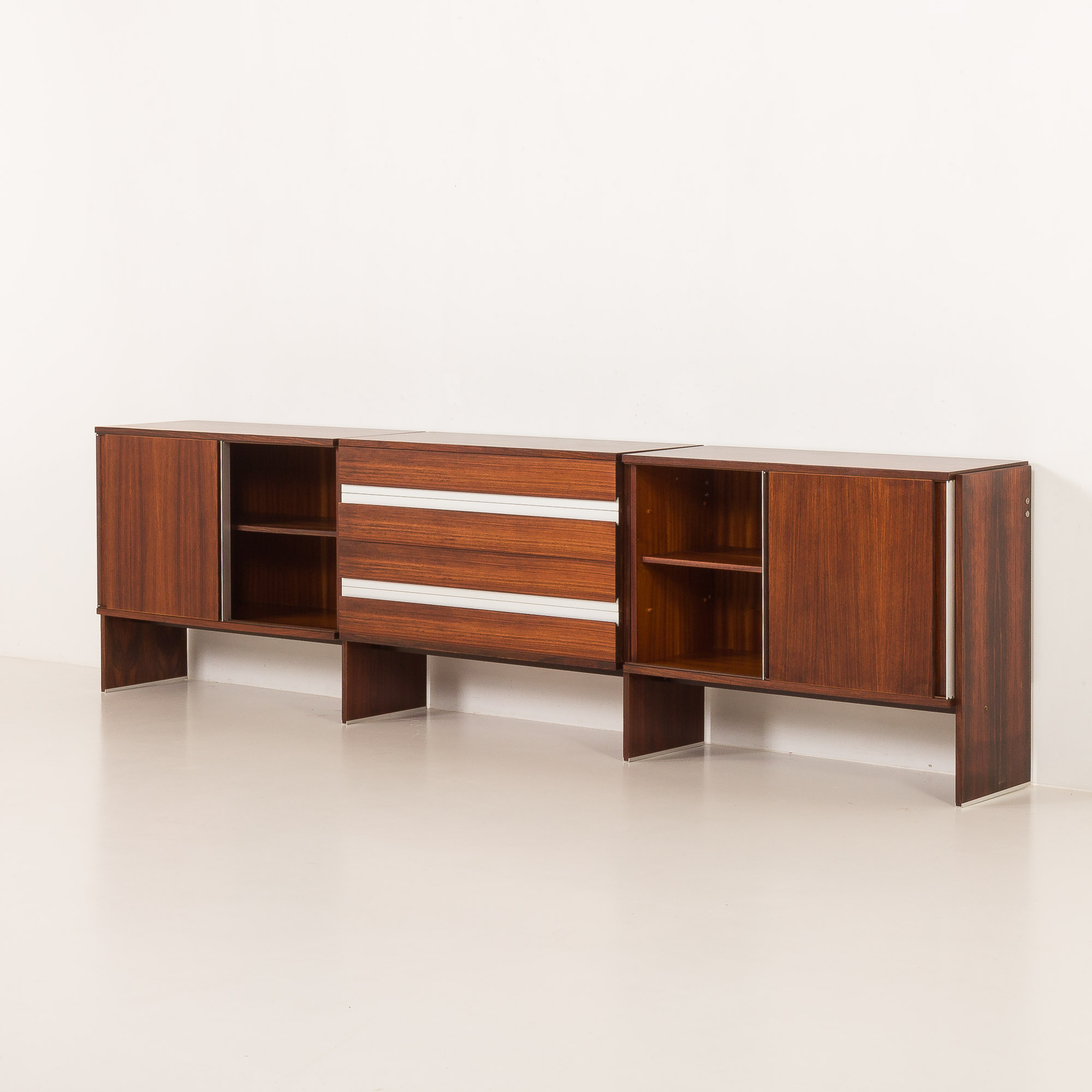 Komoda składa się z trzech części: centralnej z czterema szufladami z eleganckimi, polerowanymi aluminiowymi uchwytami oraz dwóch bocznych przegródek z przesuwanymi drzwiczkami, wyposażonych w te same uchwyty i wewnętrzne półki. Bogaty fornir z palisandru charakteryzuje się głębokim, wyrazistym usłojeniem, które podkreśla formę i wyrafinowany charakter komody.