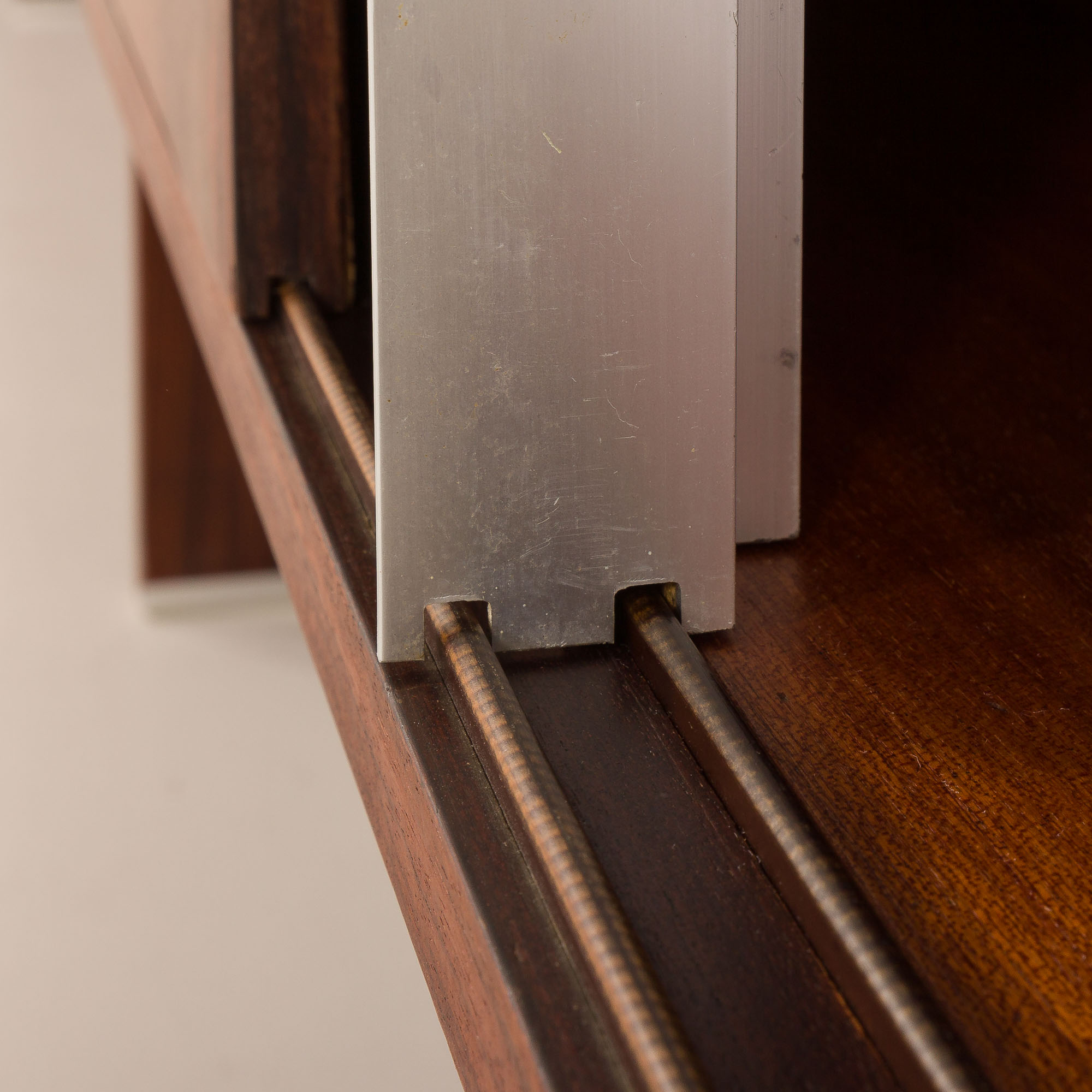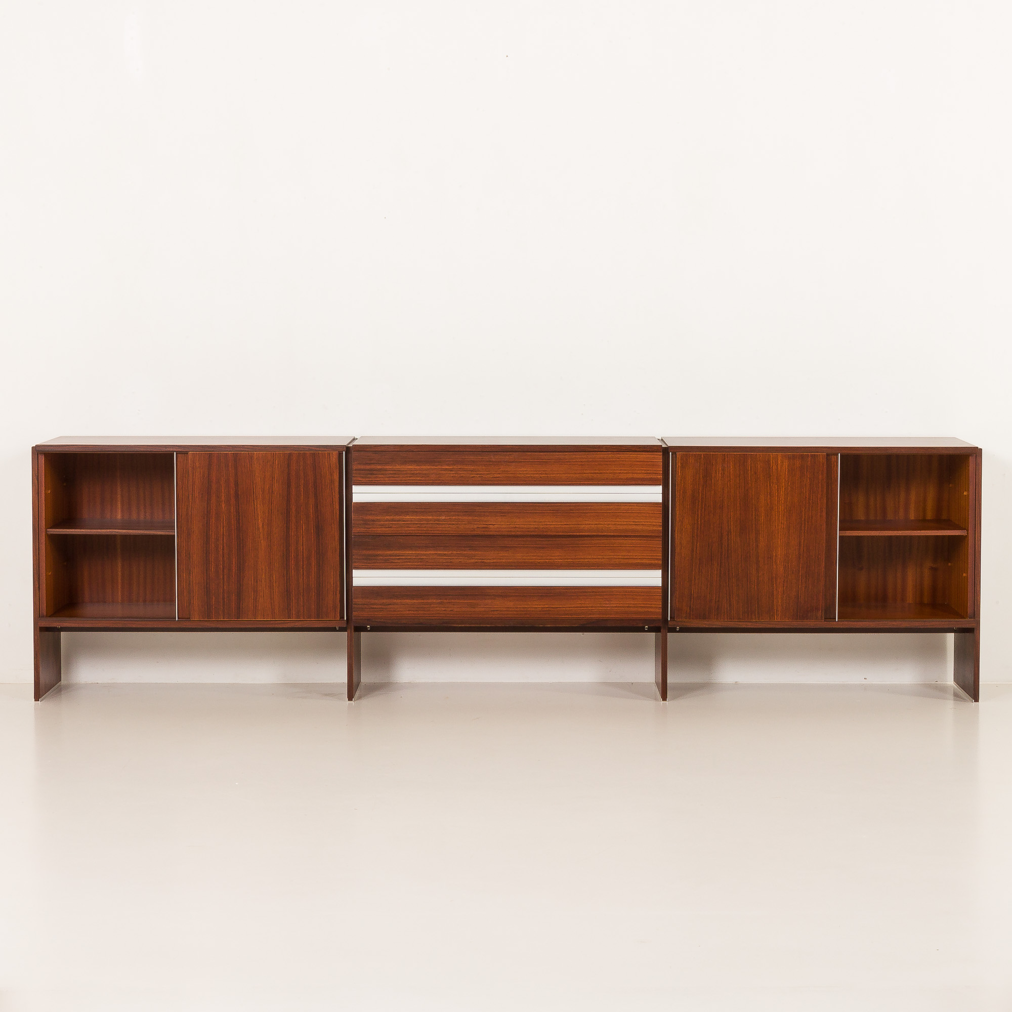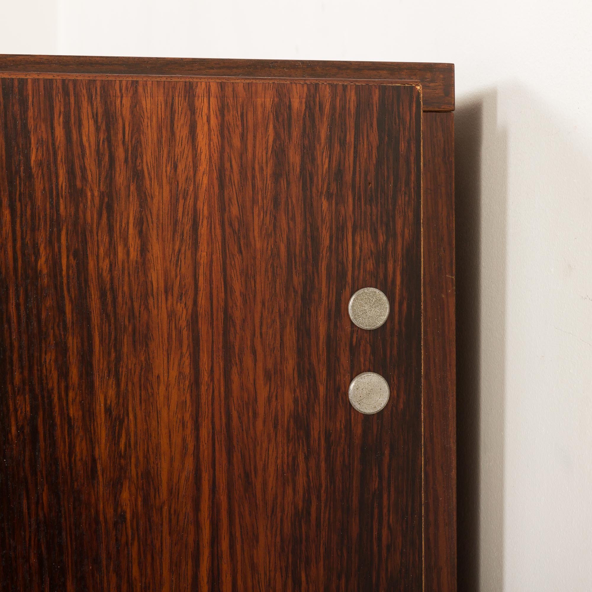 Komoda składa się z trzech części: centralnej z czterema szufladami z eleganckimi, polerowanymi aluminiowymi uchwytami oraz dwóch bocznych przegródek z przesuwanymi drzwiczkami, wyposażonych w te same uchwyty i wewnętrzne półki. Bogaty fornir z palisandru charakteryzuje się głębokim, wyrazistym usłojeniem, które podkreśla formę i wyrafinowany charakter komody.