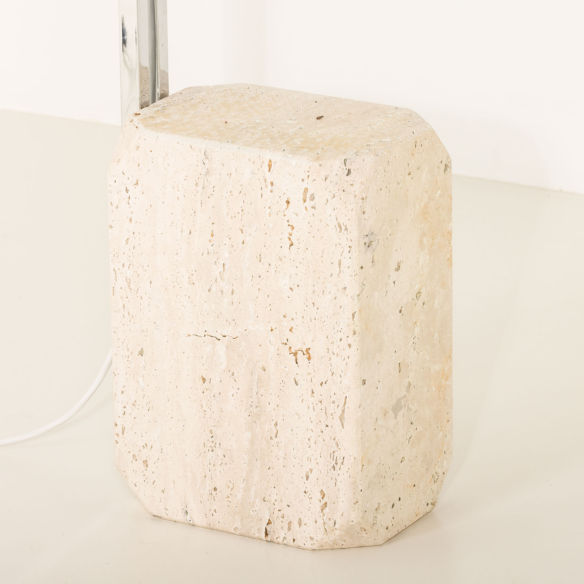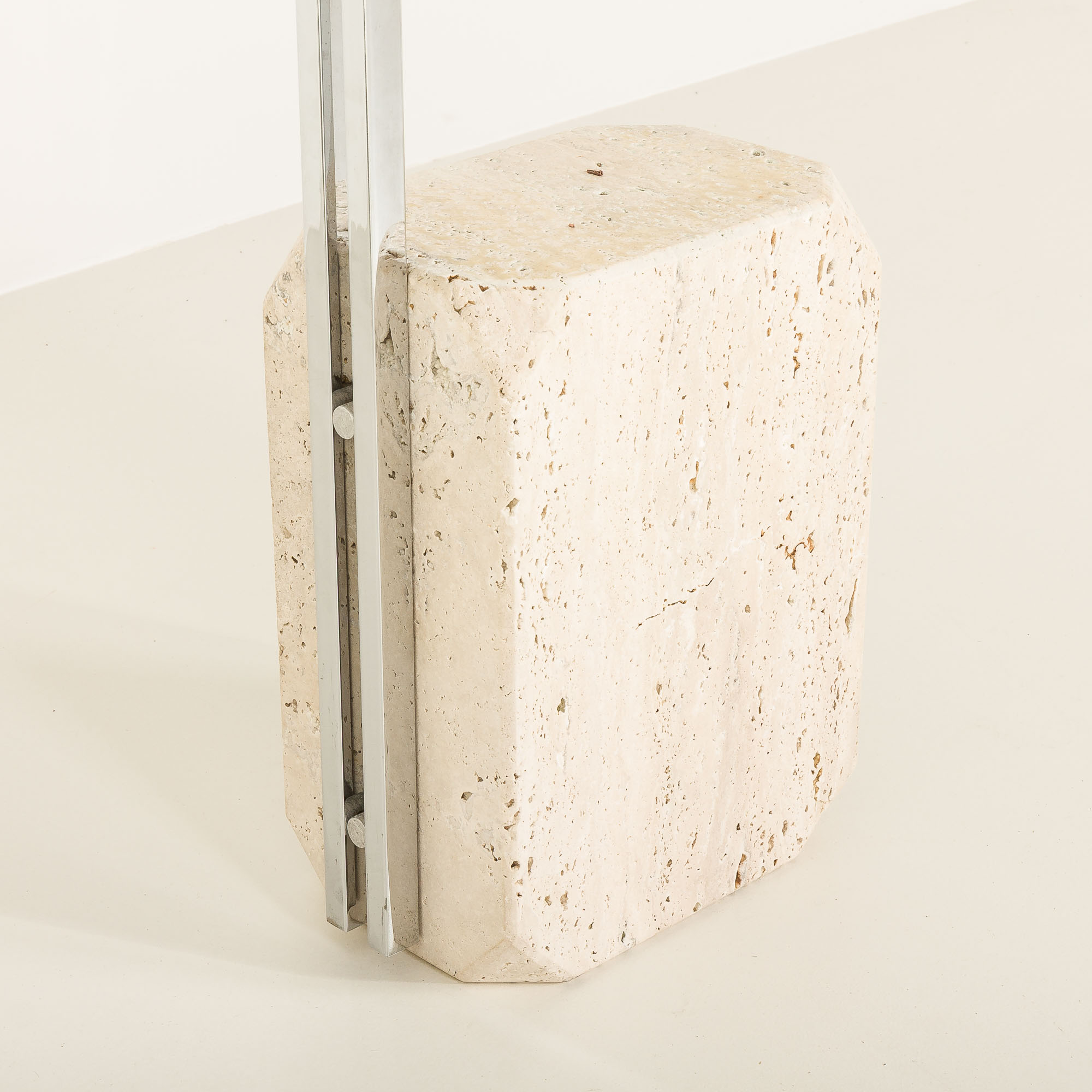 Ta minimalistyczna lampa podłogowa czerpie inspirację z kultowej lampy „Arco” zaprojektowanej przez Achille i Pier Giacomo Castiglioni dla Flos w latach 60-tych. Podstawa wykonana z porowatego trawertynu nadaje ciepłego wyglądu i tekstury, które odróżniają tę lampę od projektu "Arco".
