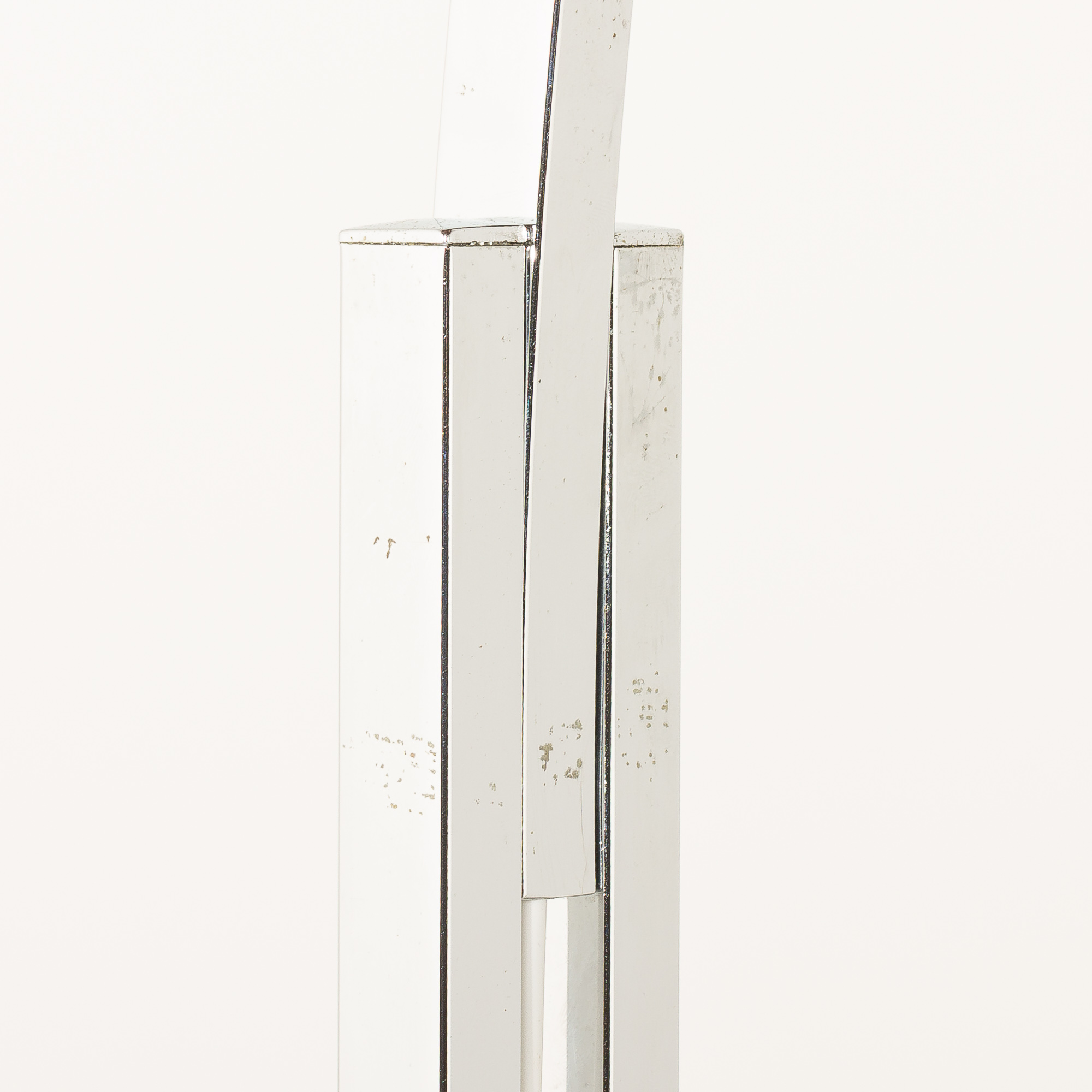 Solidna, geometryczna forma podstawy stanowi stabilne podparcie dla smukłego, wygiętego łuku ze stali nierdzewnej, który elegancko podtrzymuje chromowany klosz w kształcie kopuły. Klosz ma nieco inny wzór perforacji w porównaniu z oryginałem, co subtelnie reinterpretuje wizję braci Castiglioni. Teleskopowe ramię umożliwia łatwą regulację wysokości klosza i skierowanie światła w pożądane miejsce.