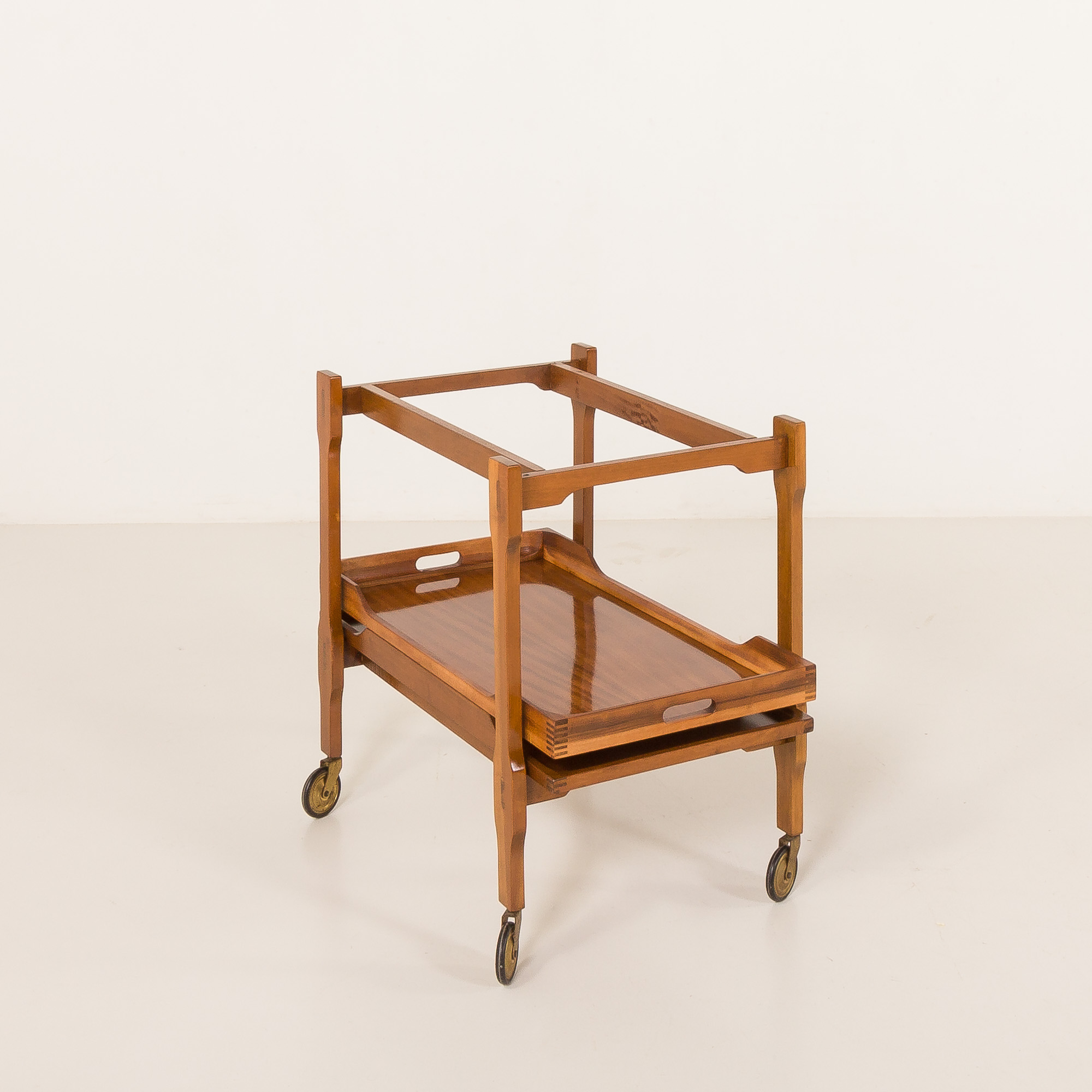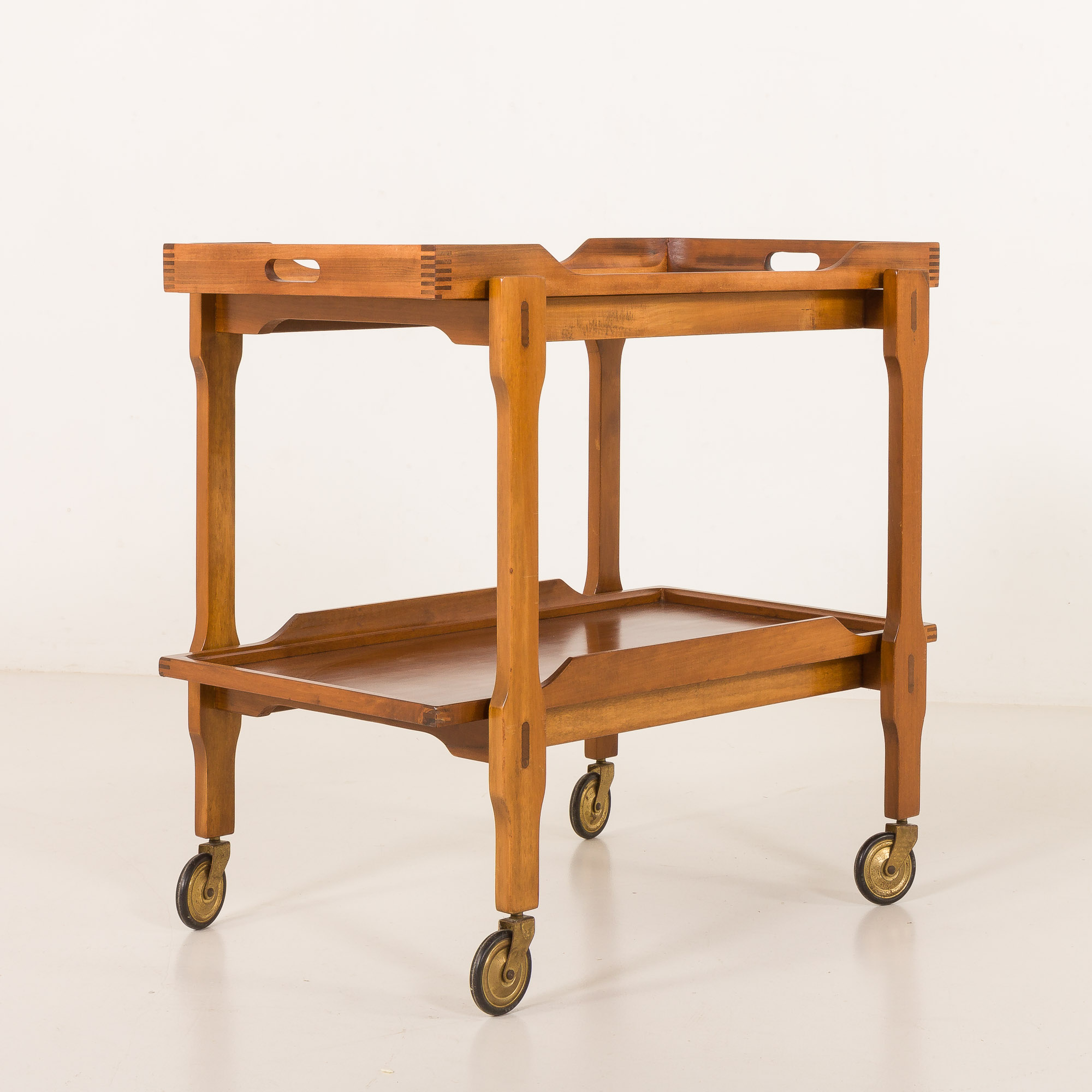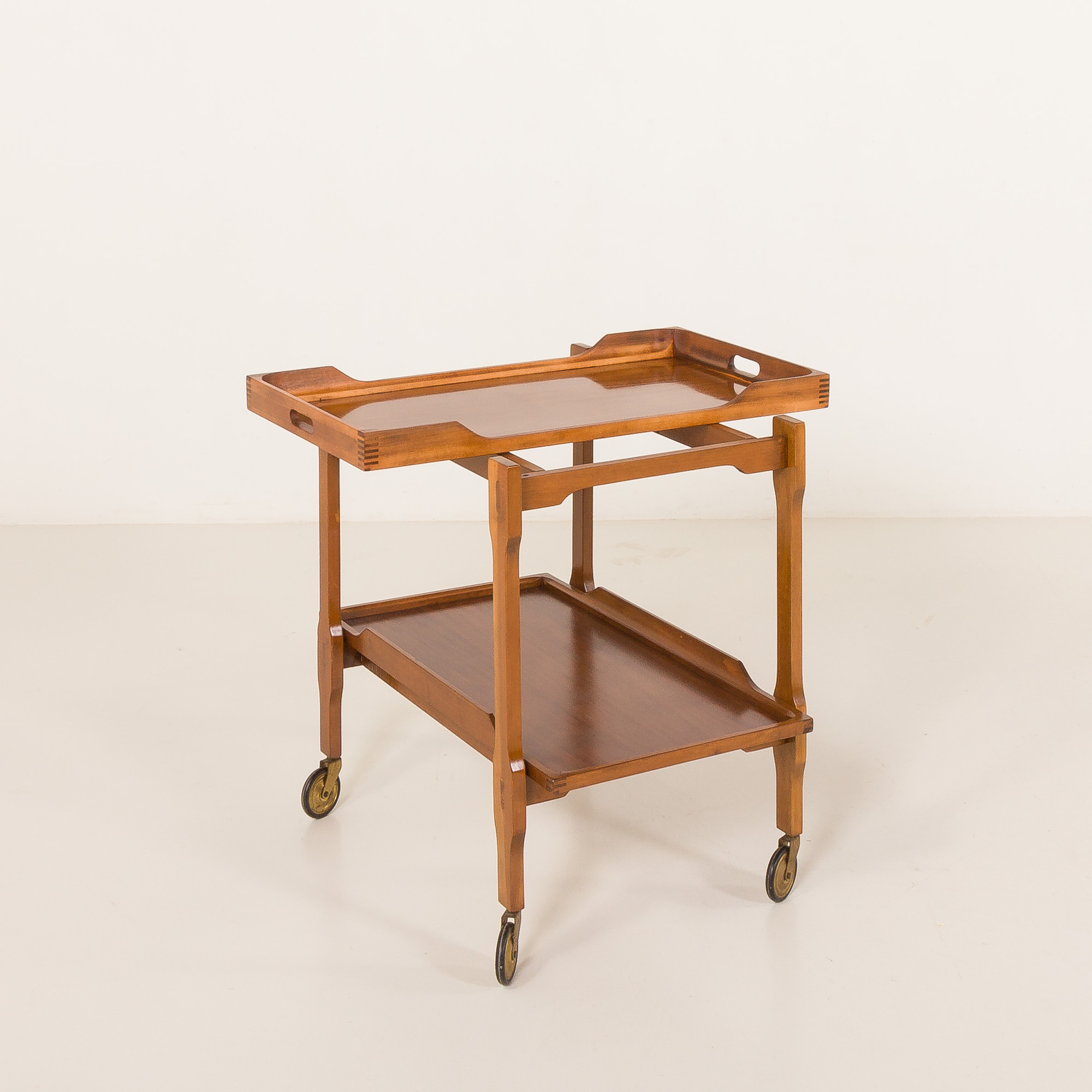 Elegancki włoski wózek barowy mid-century, wykonany z litego orzecha, pochodzi z końca lat 60. lub z lat 70. XX wieku.