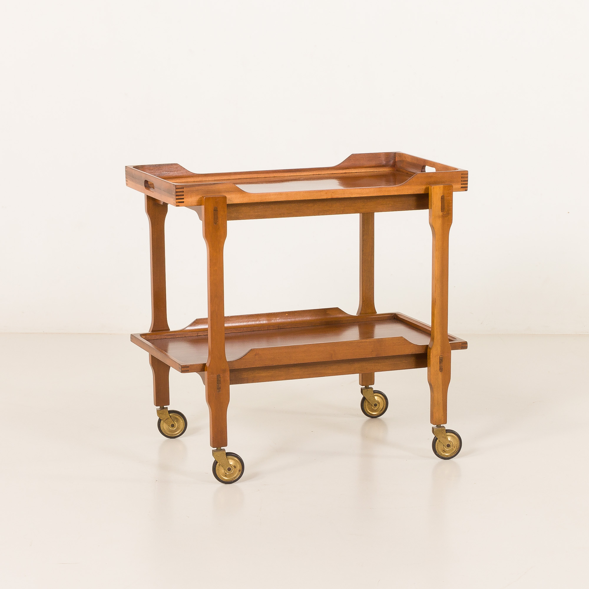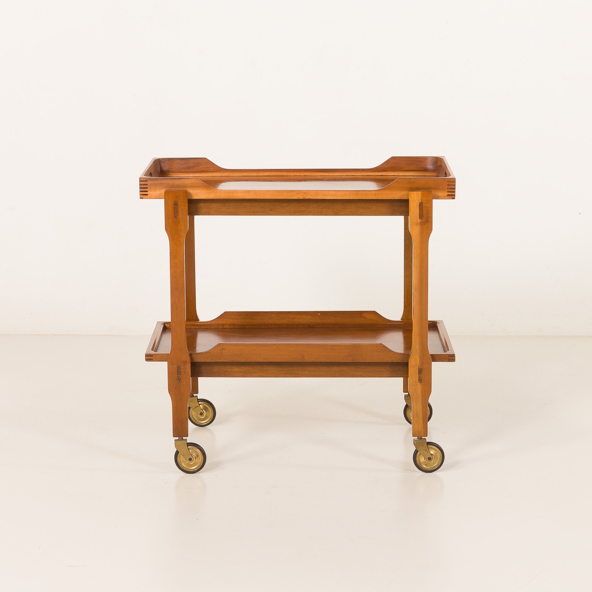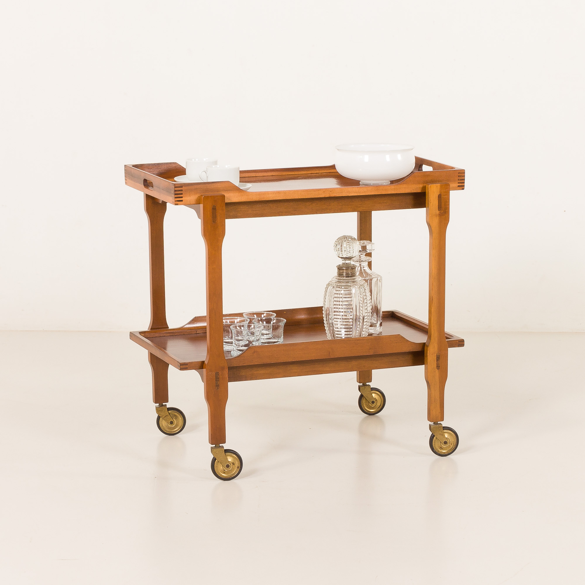 Elegancki włoski wózek barowy mid-century, wykonany z litego orzecha, pochodzi z końca lat 60. lub z lat 70. XX wieku.