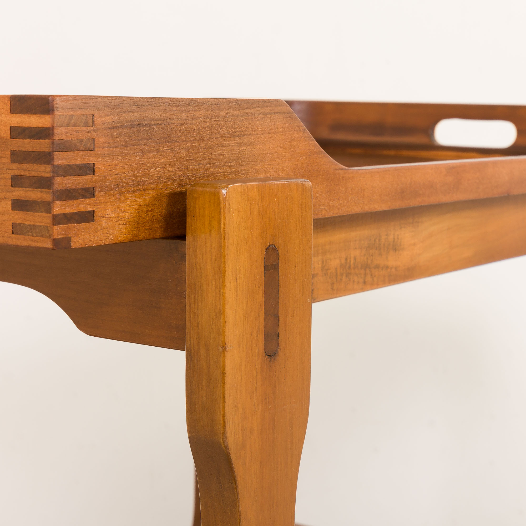 Wózek posiada wyjmowaną górną tacę i pięknie wykonane, zazębiające się narożniki – subtelny, a zarazem efektowny detal, który podkreśla jakość jego konstrukcji. Wózek stoi na czterech mosiężnych kółkach obrotowych, obecnie z atrakcyjną patyną, co zapewnia płynne przemieszczanie i dodaje mu uroku vintage.
