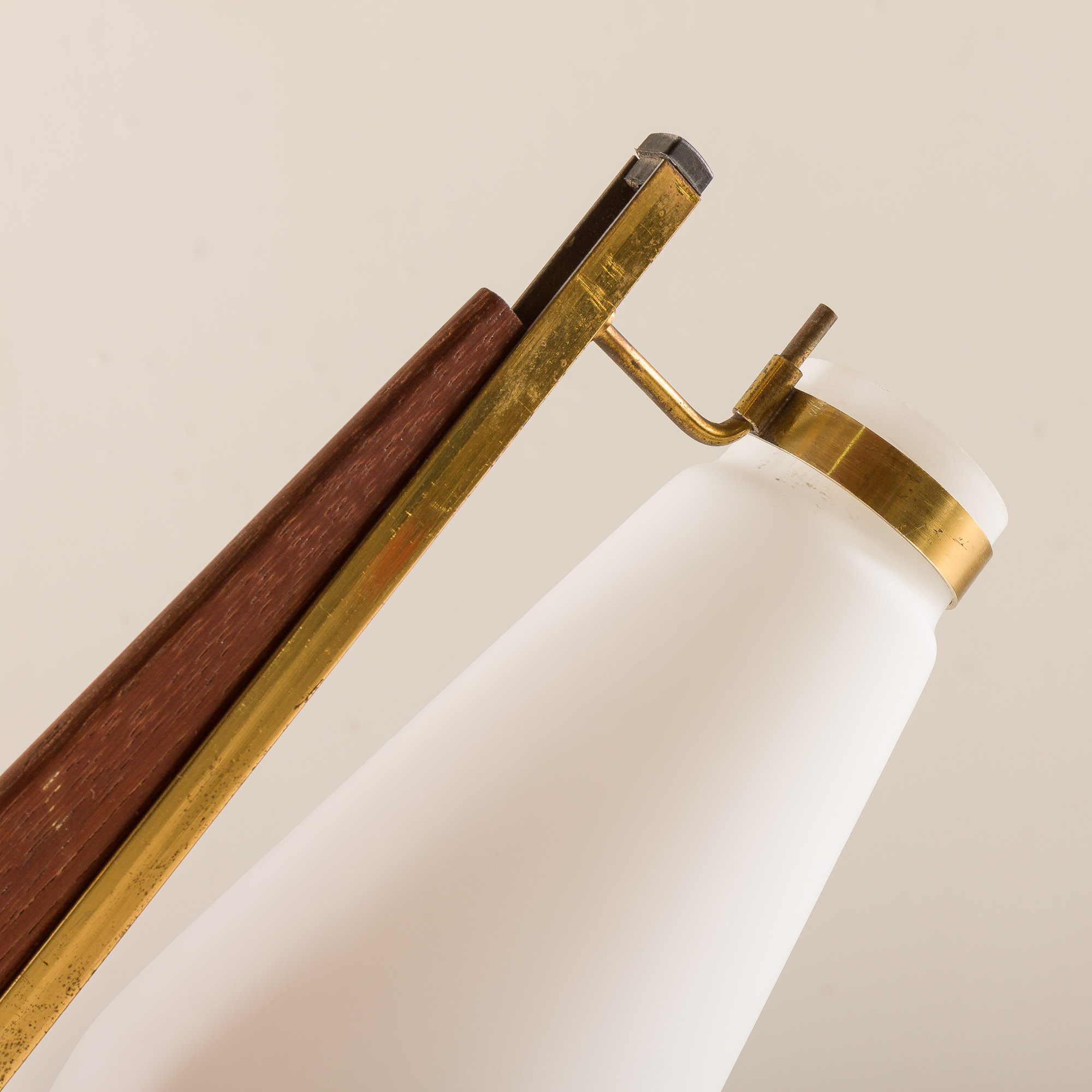 Żyrandol wyposażony jest w wiele stożkowych kloszy z opalizującego szkła, zamocowanych na mosiężnych uchwytach. Całość połączona jest z podstawą z drewna tekowego i mosiądzu. Połączenie litego drewna tekowego, mosiądzu i mlecznobiałego szkła tworzy wyrafinowaną grę faktur i odcieni.