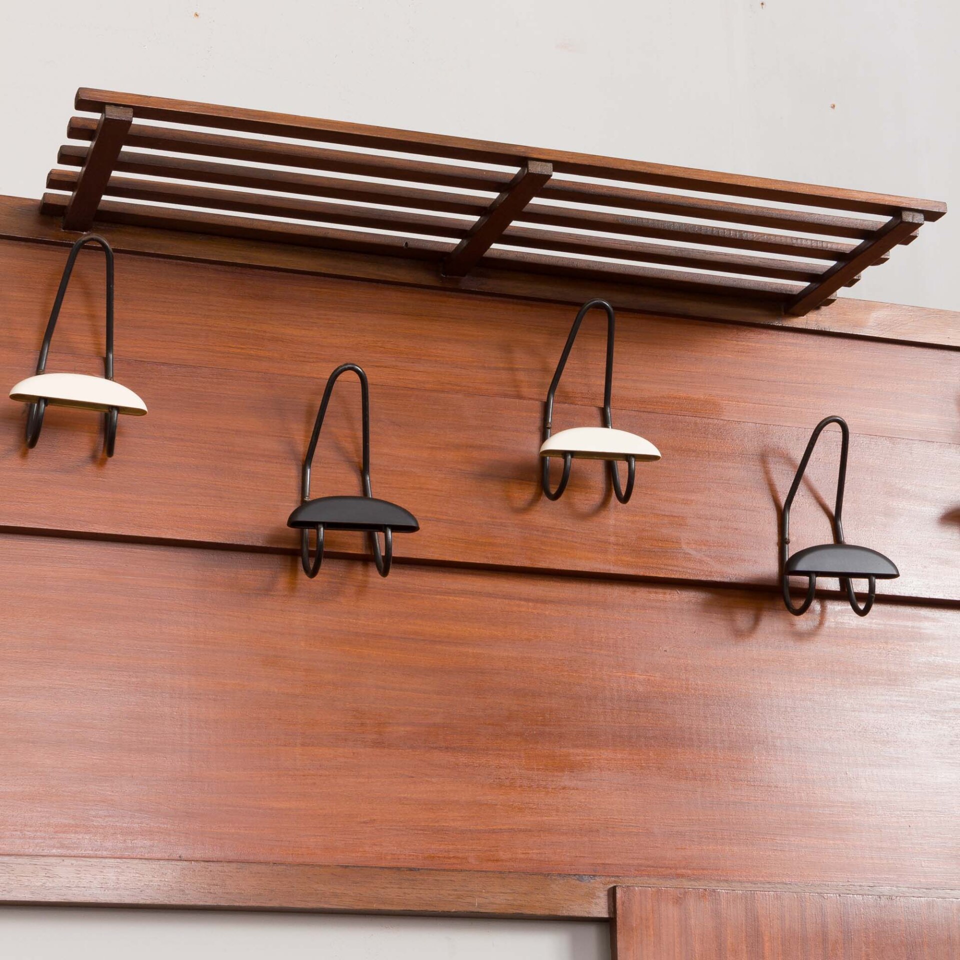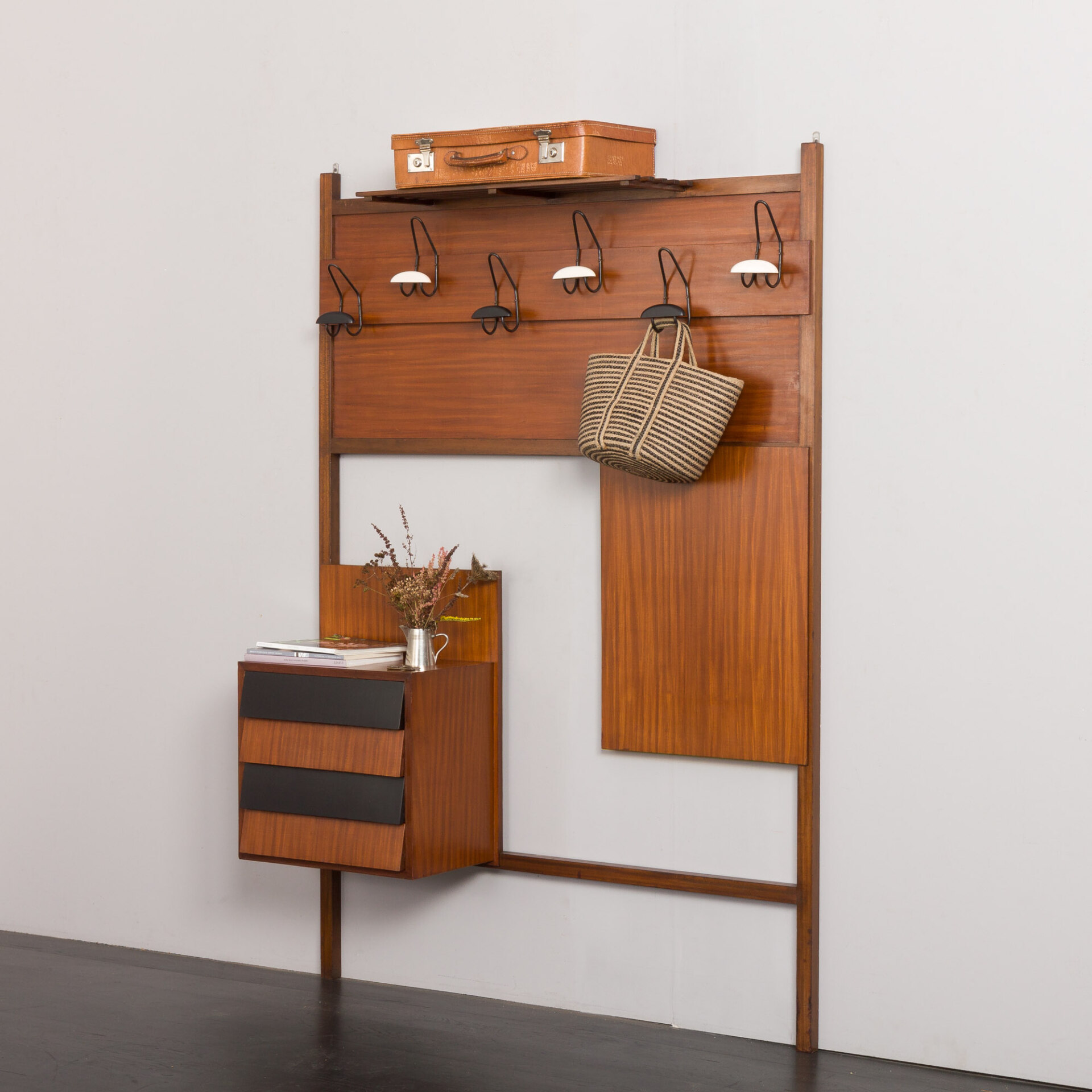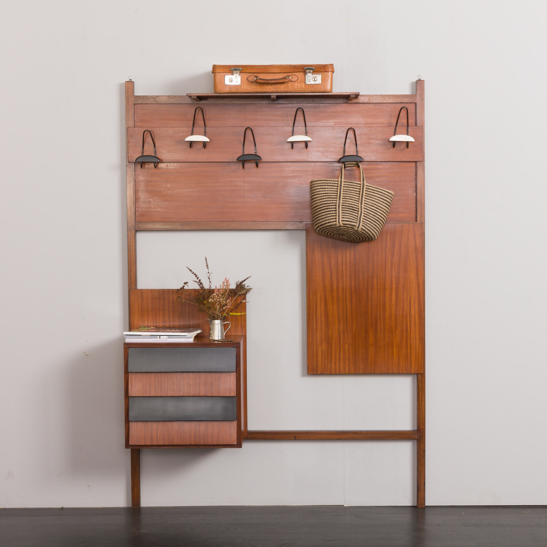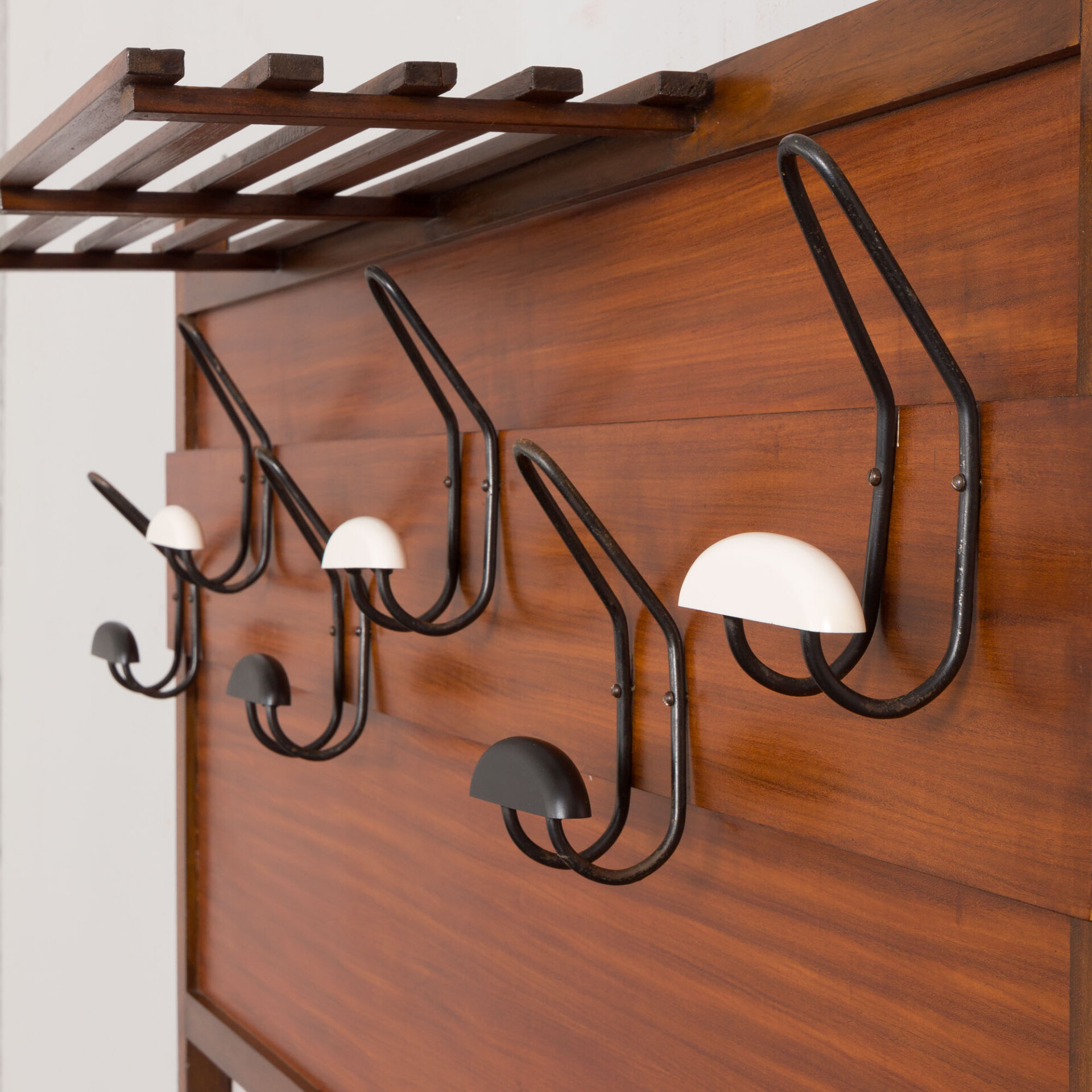 Włoski wieszak ścienny vintage na płaszcze pochodzi z lat 70. To wyjątkowy element wystroju, który doda do Twojego przedpokoju nie tylko funkcjonalności, ale również eleganckiego, włoskiego designu z okresu mid- century. Ten montowany na ścianie mahoniowy wieszak nie tylko wzbogaca wnętrze swoją ciepłą estetyką, ale także zachwyca kontrastowymi detalami w kolorach czarnym i białym, tworząc efektowną i zapadającą w pamięć aranżację oraz niezwykły kontrast, który przyciąga uwagę.