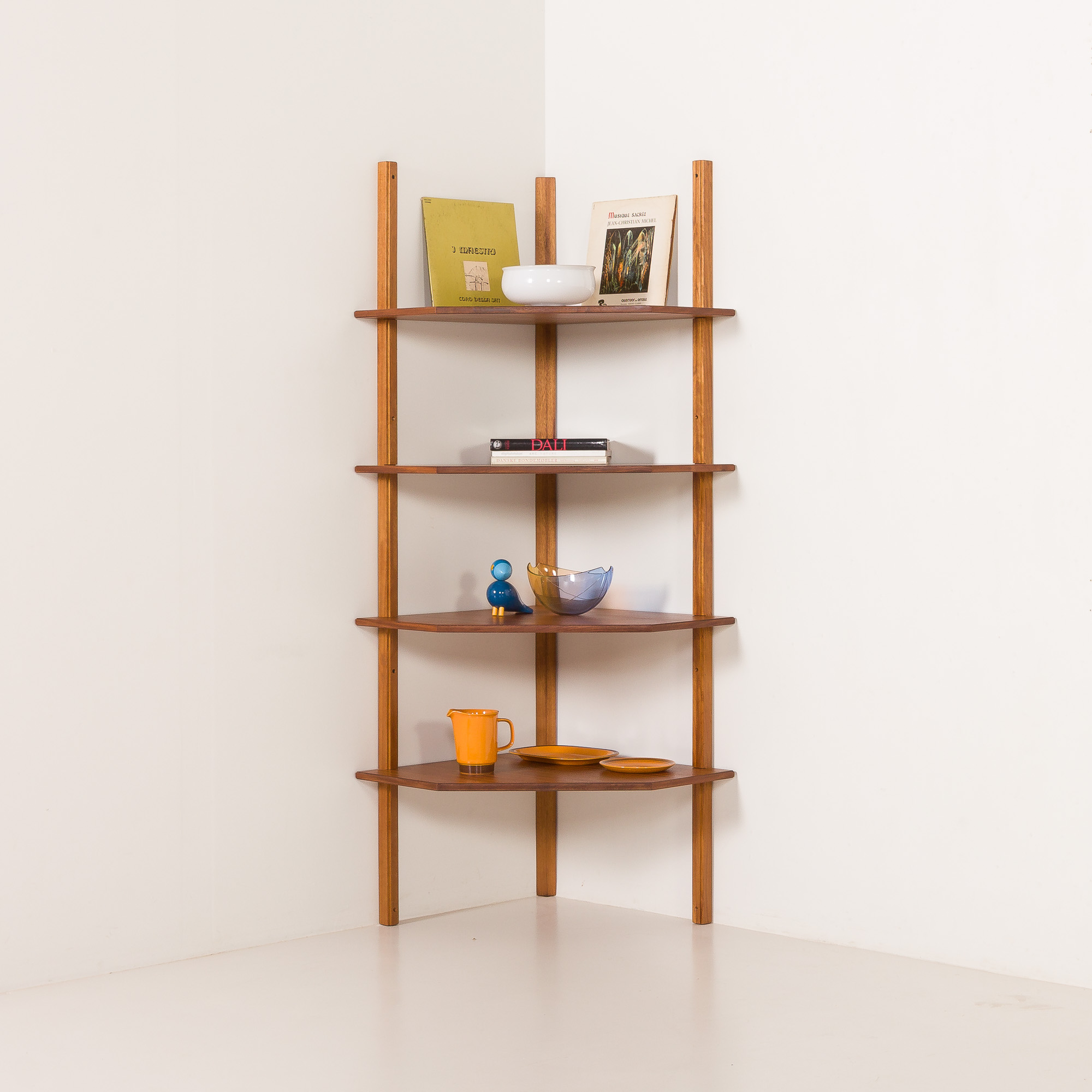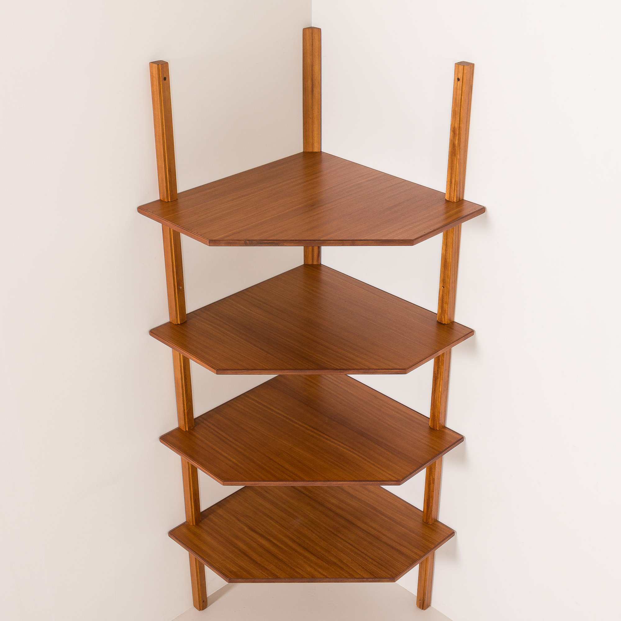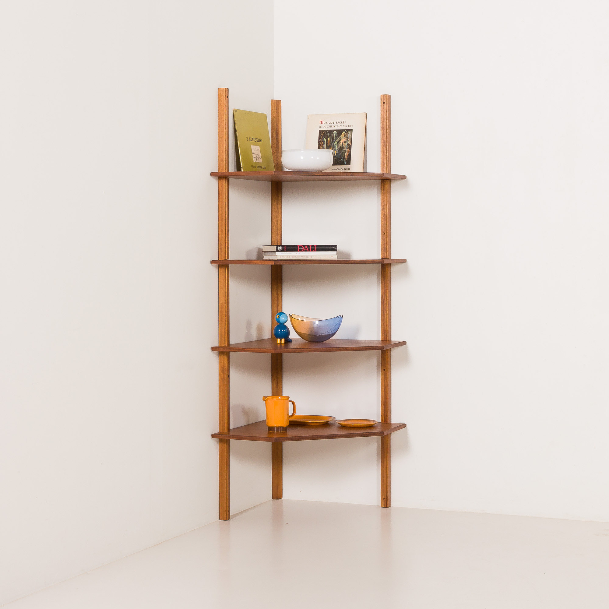 Modułowy, włoski, narożny regał ścienny mid-century, wykonany z drewna tekowego. Powstał w latach 70. Oferuje mnóstwo miejsca do przechowywania.