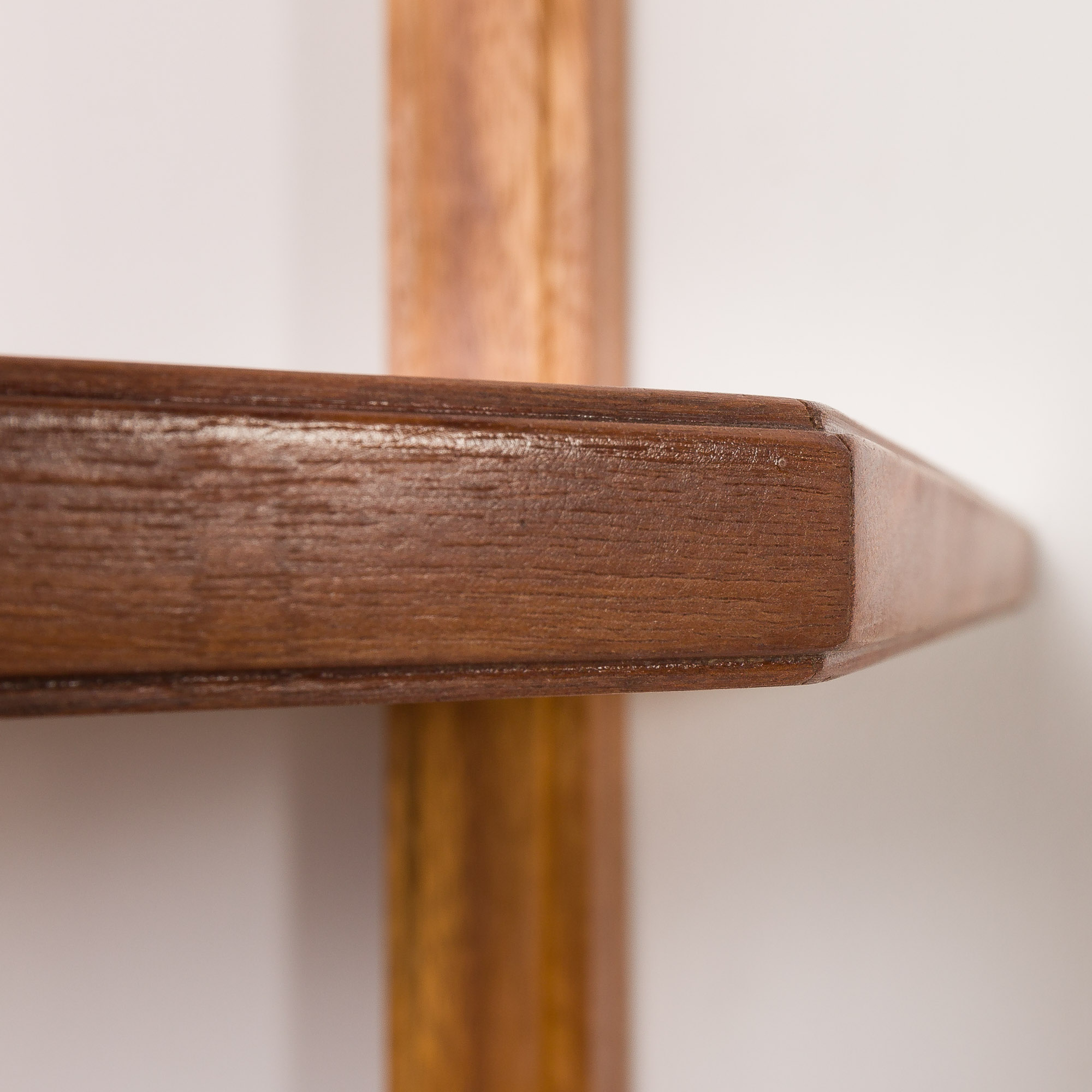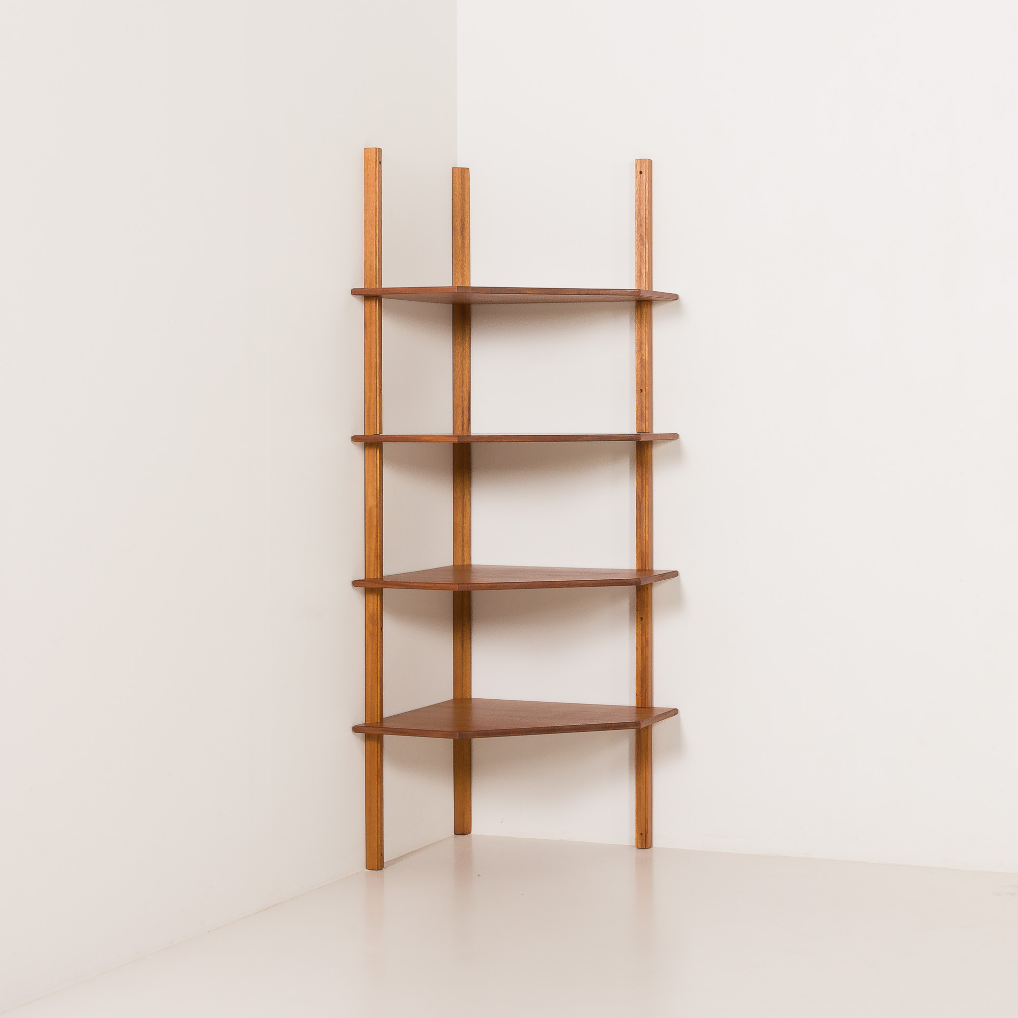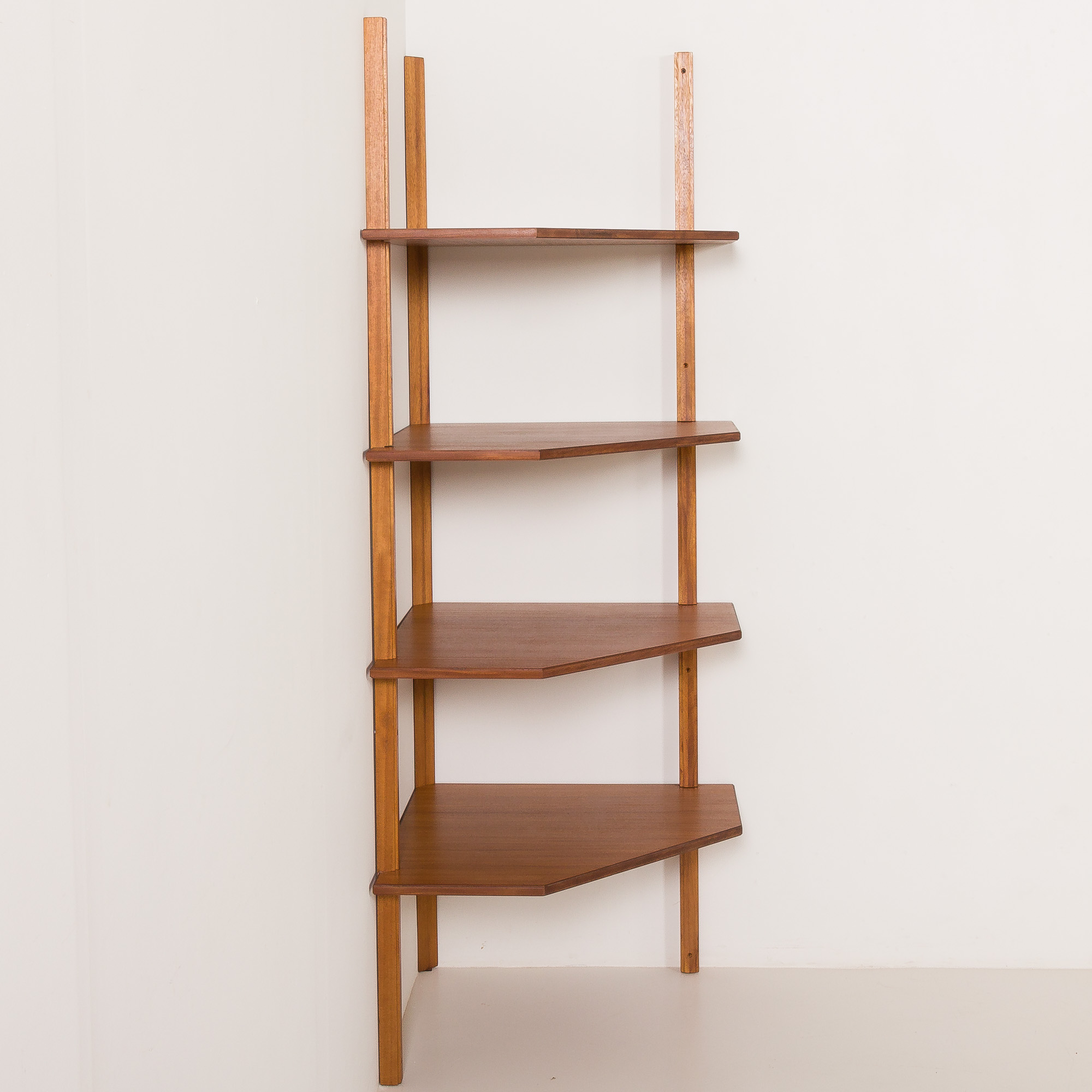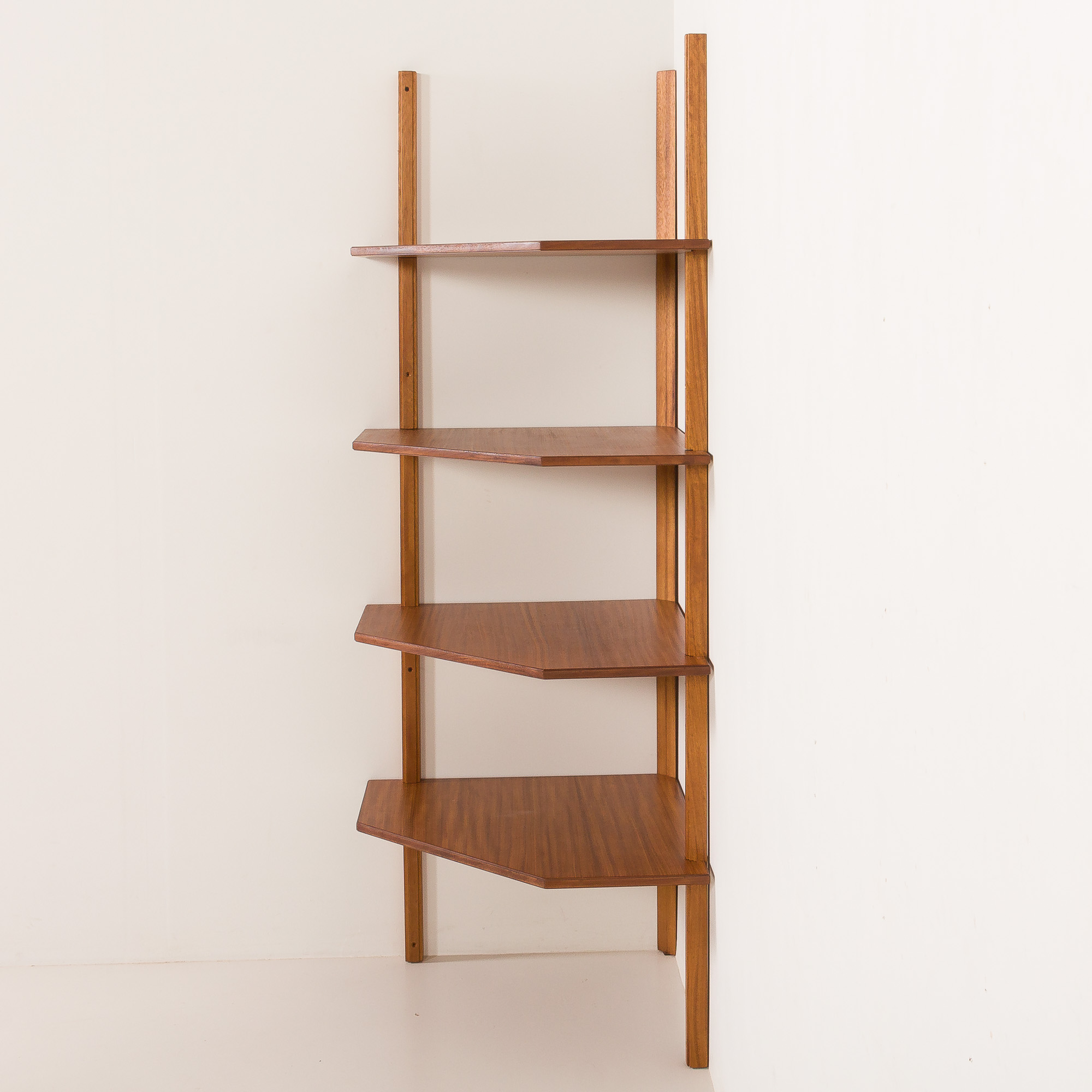Modułowy, włoski, narożny regał ścienny mid-century, wykonany z drewna tekowego. Powstał w latach 70. Oferuje mnóstwo miejsca do przechowywania.