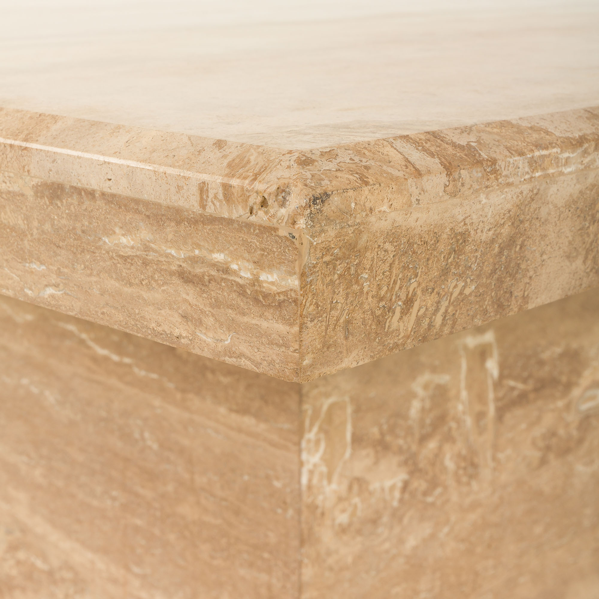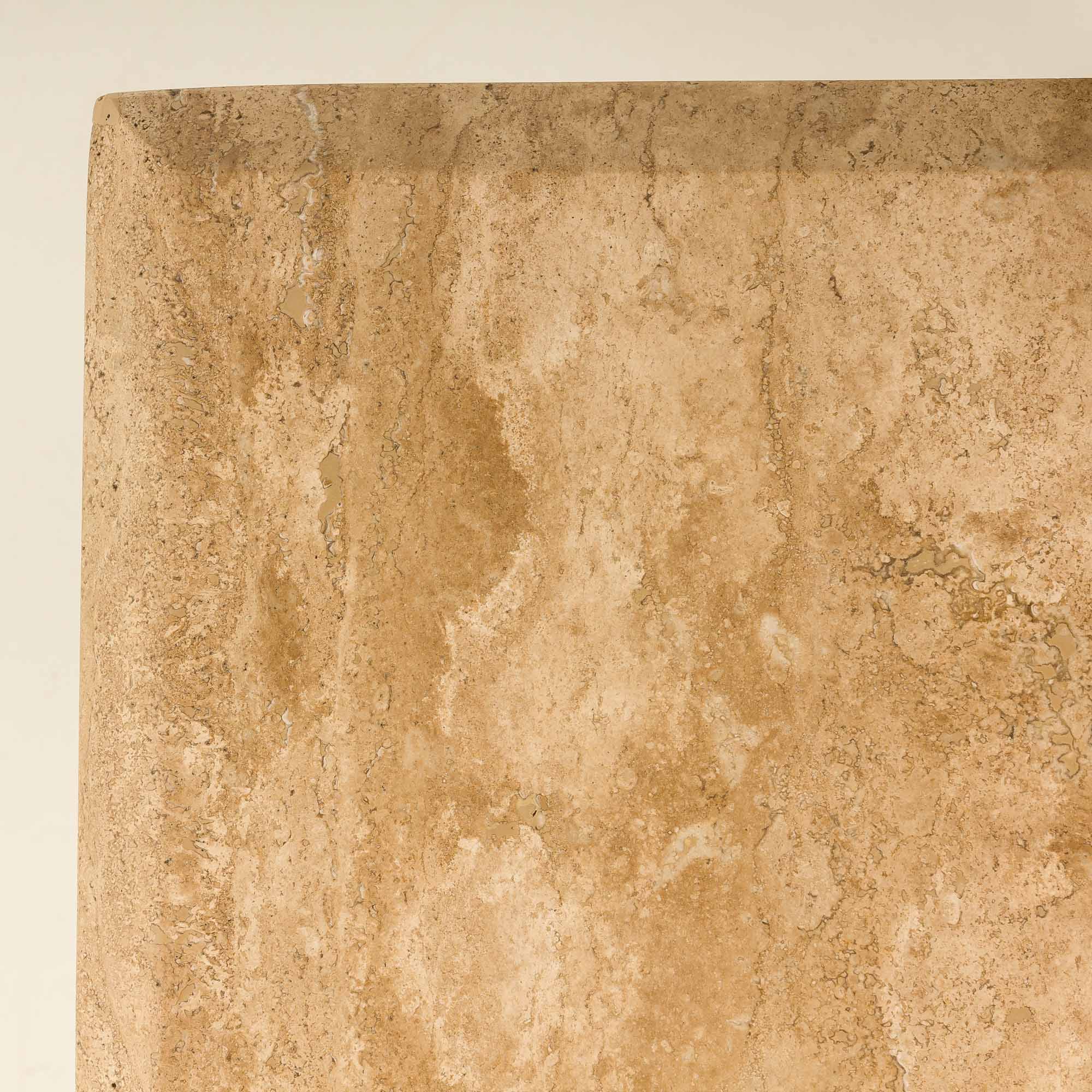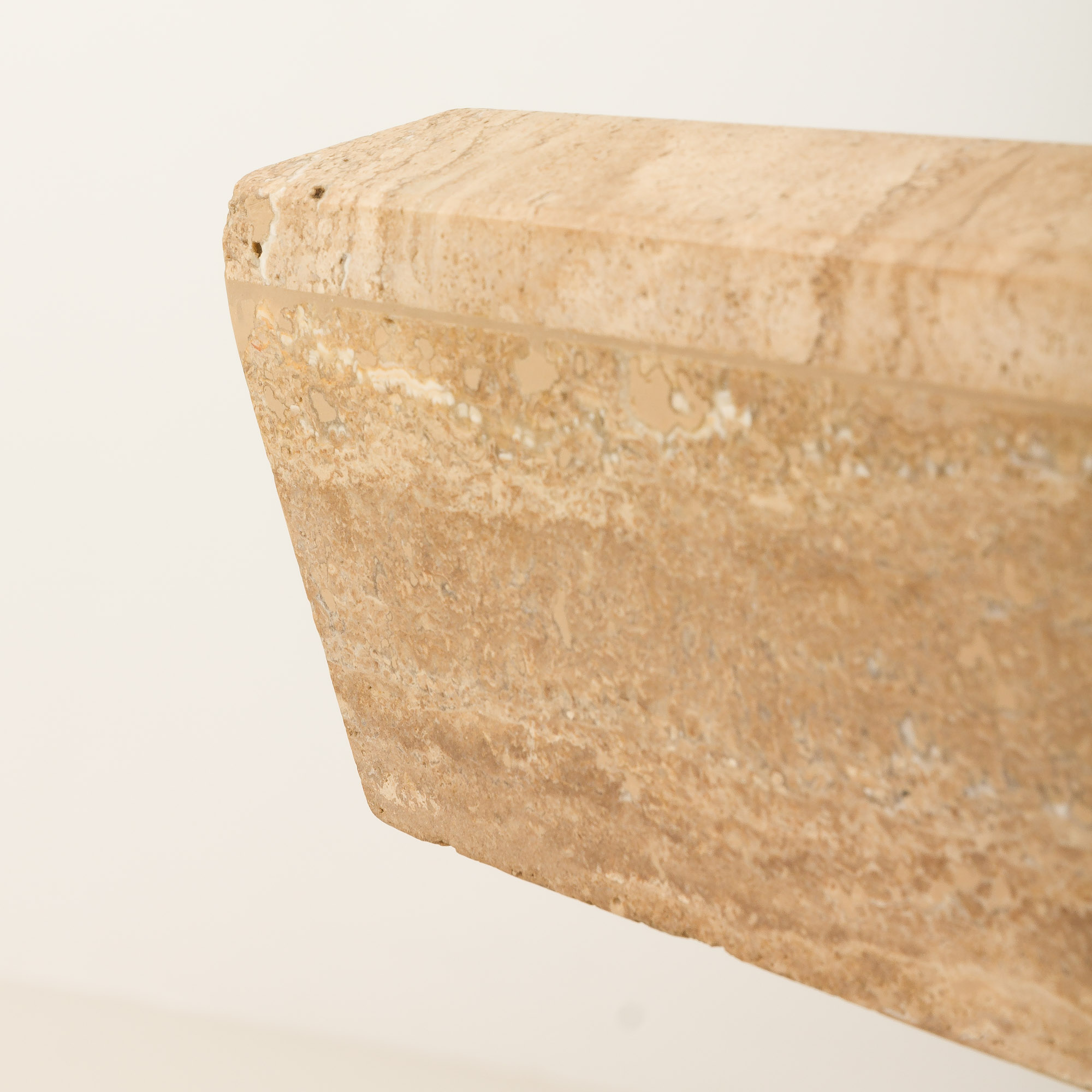 Jego masywna, geometryczna forma odzwierciedla estetykę epoki, w której dominowały surowe, minimalistyczne bryły i szlachetne materiały. Ciepłe, beżowe i kremowe odcienie kamienia sprawiają, że doskonale komponuje się zarówno z klasycznymi, jak i nowoczesnymi wnętrzami.