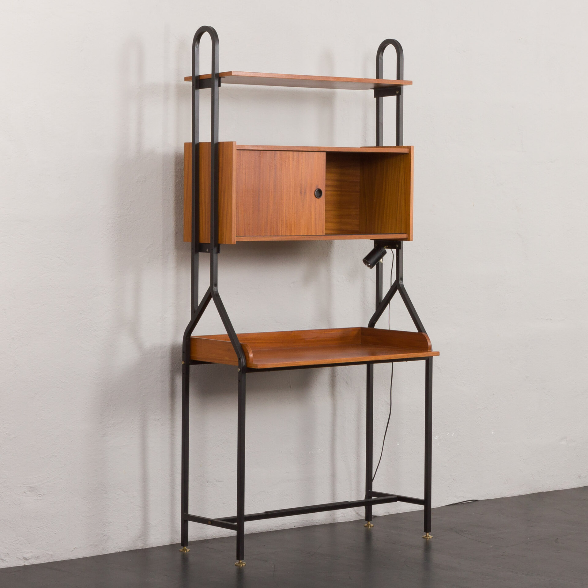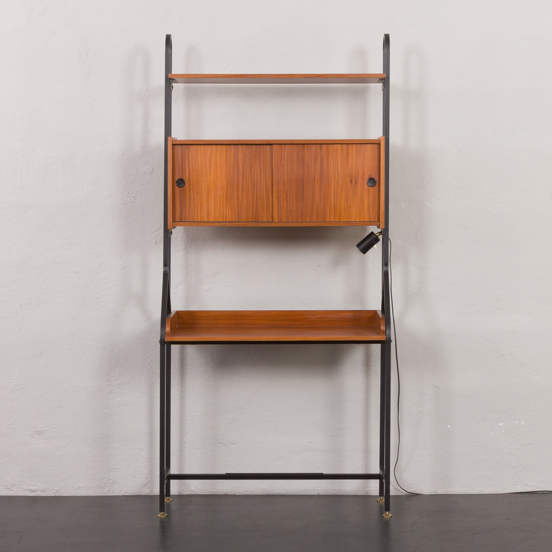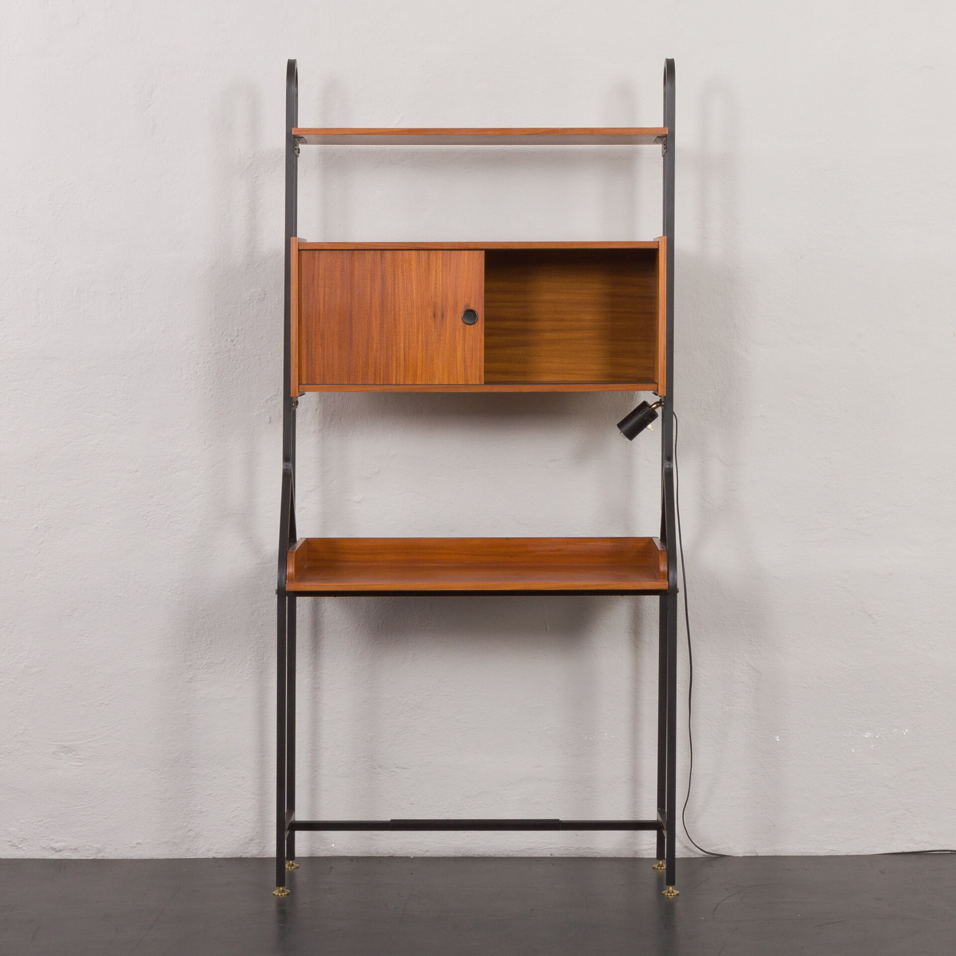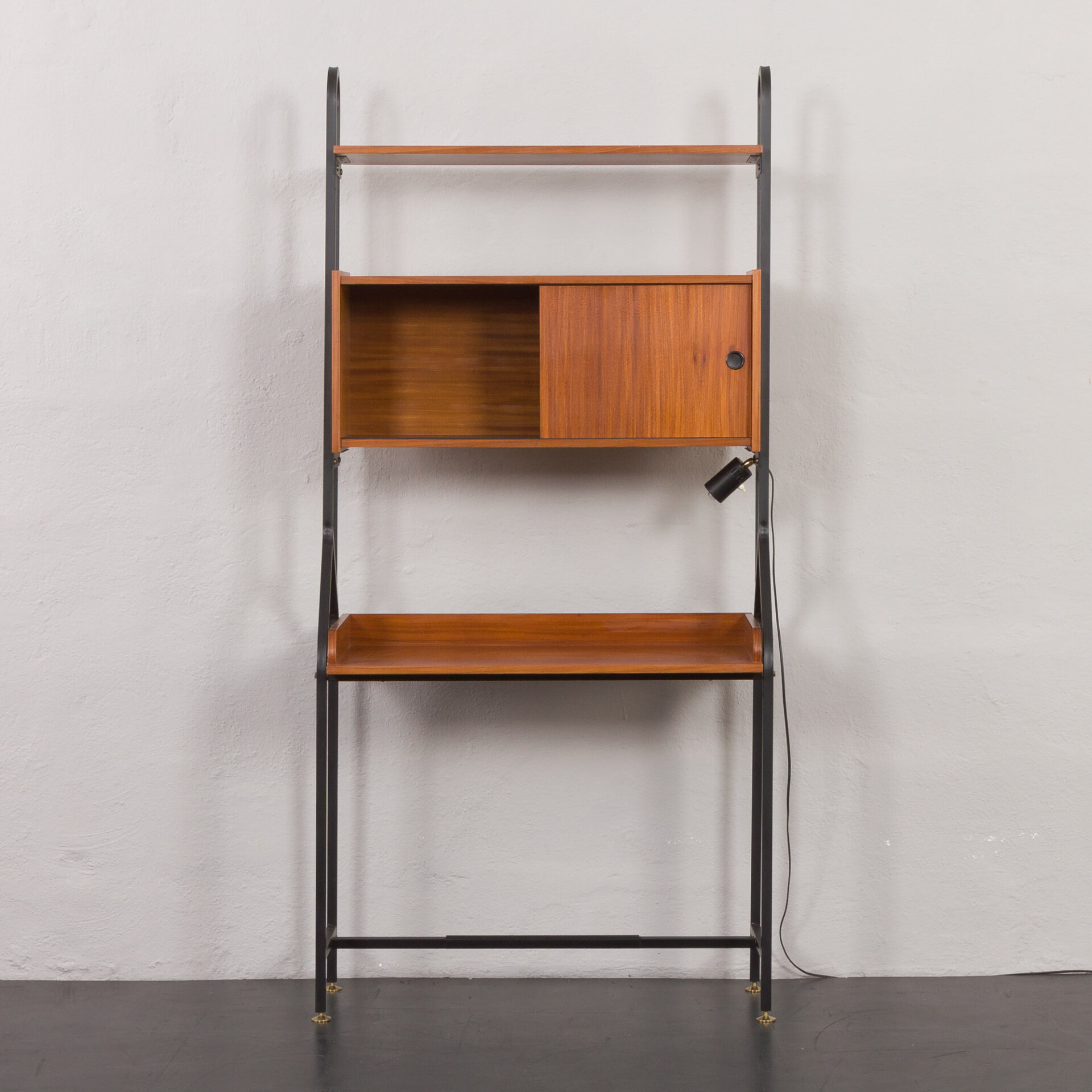 Minimalistyczny, a jednocześnie funkcjonalny włoski, wolnostojący regał vintage z epoki mid-century, swym designem nawiązuje do stylu Silvio Cavatorta z lat 60. Całość tworzy funkcjonalne miejsce do pracy na home office z dodatkową półką na książki i szafką. Biurko i dodatkowe oświetlenie załączone do zestawu pozwoli na pracę w salonie, jak i sypialni. Precyzyjnie wykonana konstrukcja, pomalowanych na czarno, metalowych wsporników tworzy efektowny kontrast wobec ciepłej, bogatej barwy forniru tekowego. Połączenie tych materiałów nie tylko doskonale oddaje charakter i styl włoskiego okresu mid-century, ale również idealnie wpasowuje się w różne style wnętrz - od współczesnych po klasyczne aranżacje. Nawet na nierównych powierzchniach regał zachowuje pełną stabilność dzięki precyzyjnie wykonanym, regulowanym nóżkom z mosiądzu, których złoty odcień nadaje mu niezwykłej elegancji i klasy.