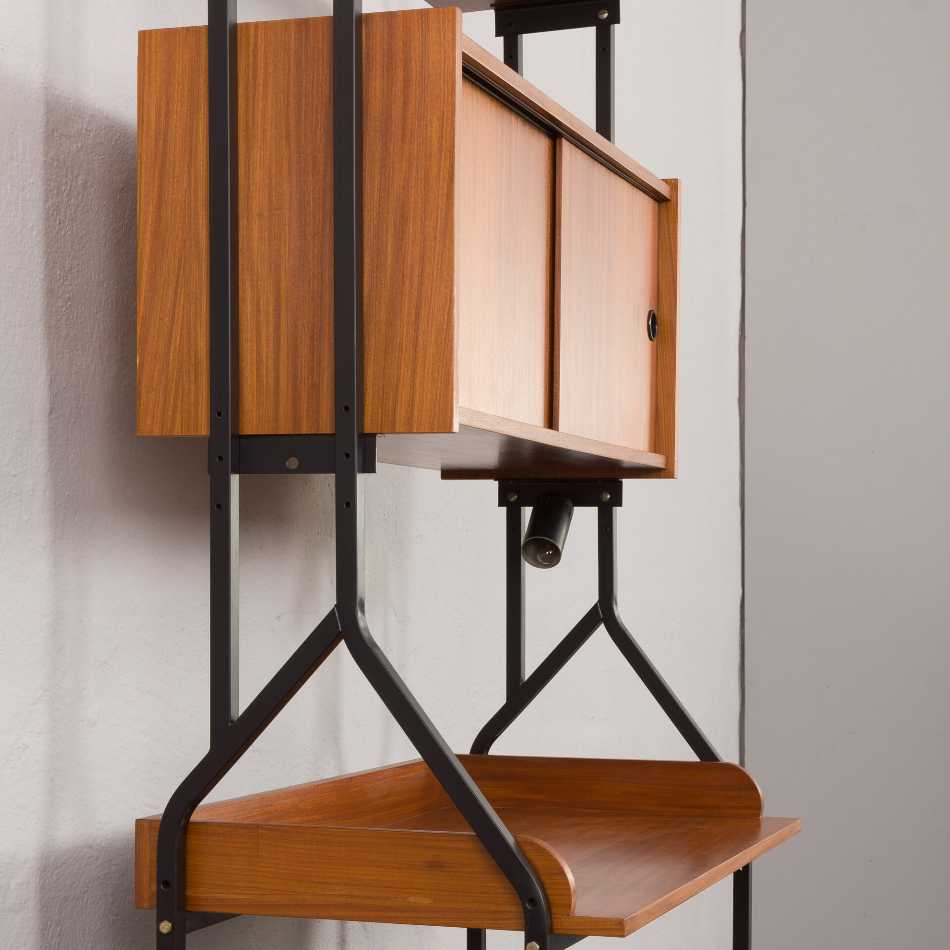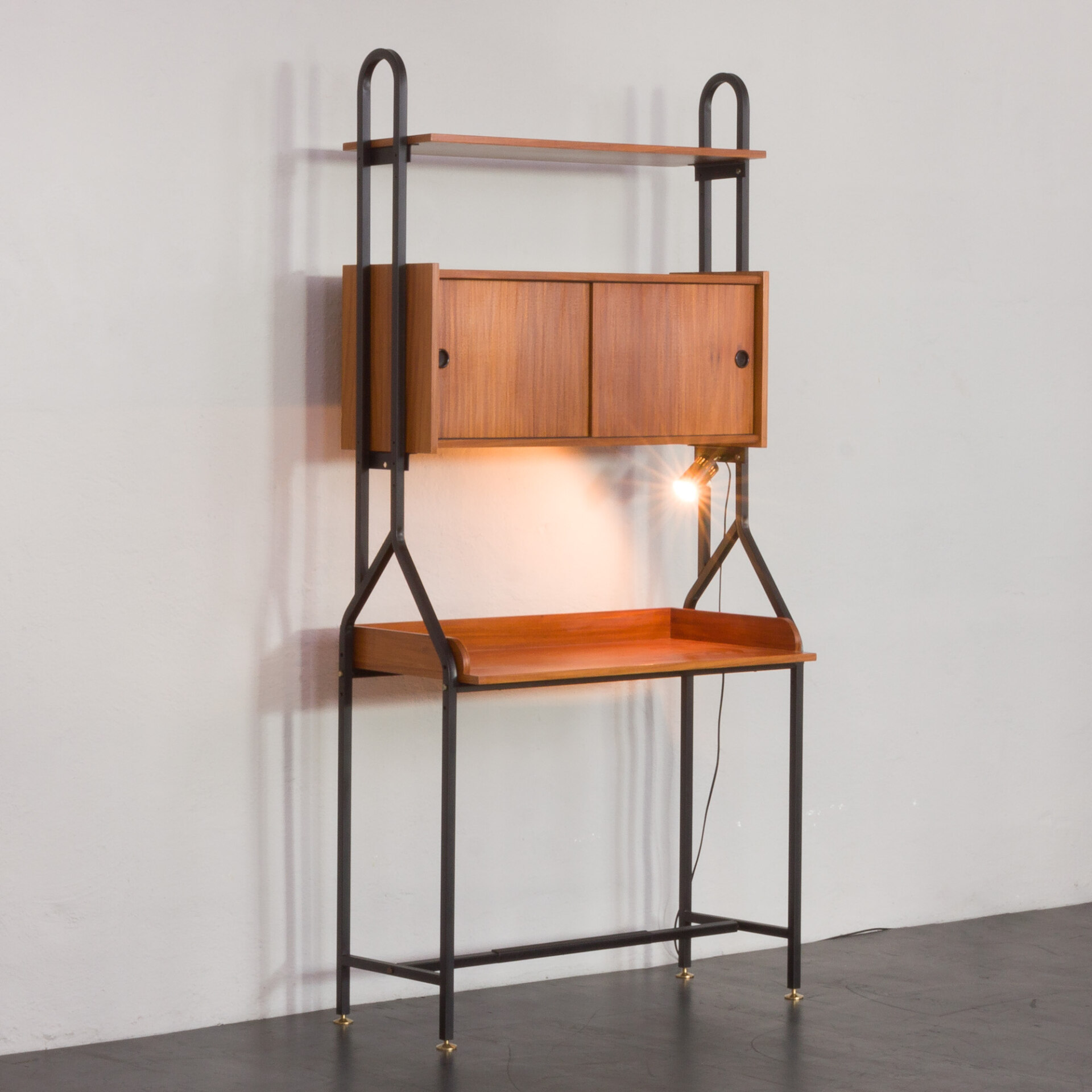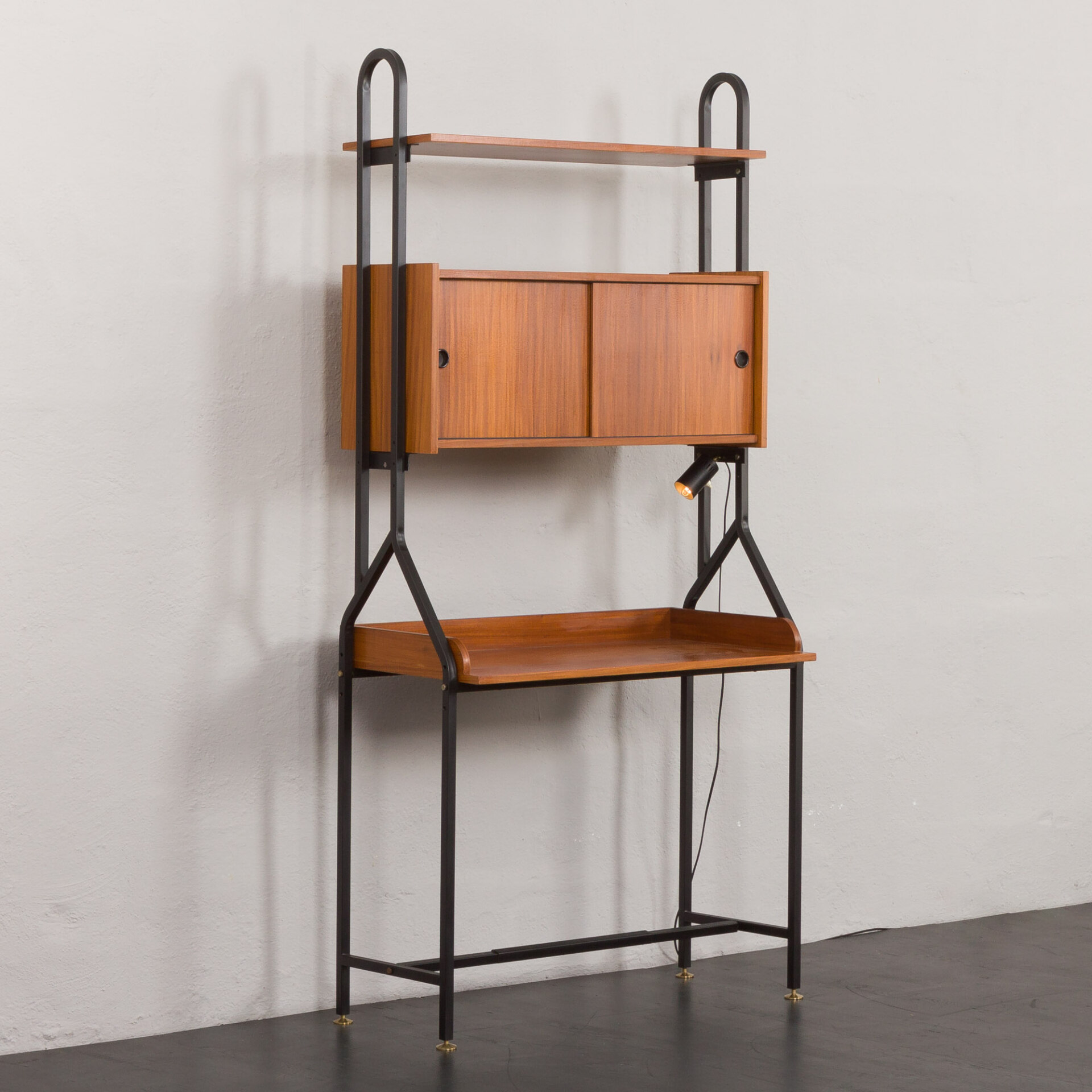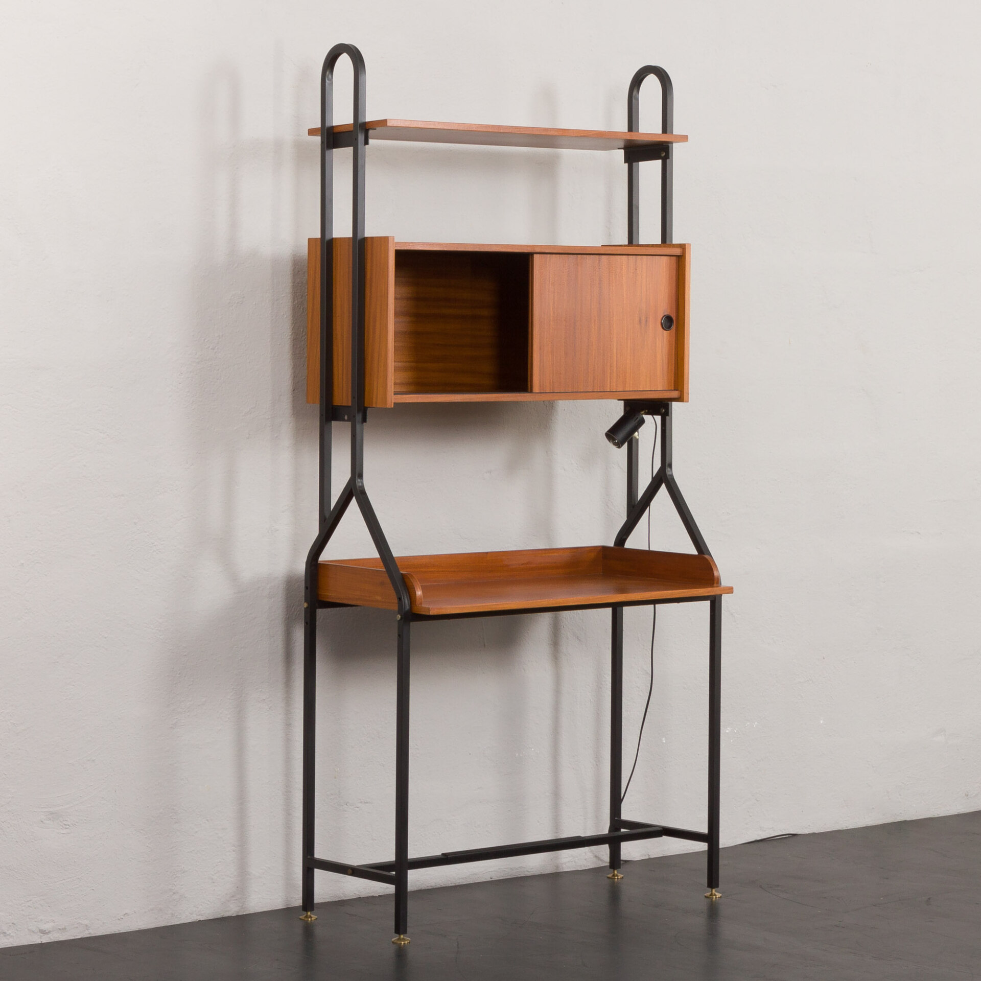 Minimalistyczny, a jednocześnie funkcjonalny włoski, wolnostojący regał vintage z epoki mid-century, swym designem nawiązuje do stylu Silvio Cavatorta z lat 60. Całość tworzy funkcjonalne miejsce do pracy na home office z dodatkową półką na książki i szafką. Biurko i dodatkowe oświetlenie załączone do zestawu pozwoli na pracę w salonie, jak i sypialni. Precyzyjnie wykonana konstrukcja, pomalowanych na czarno, metalowych wsporników tworzy efektowny kontrast wobec ciepłej, bogatej barwy forniru tekowego. Połączenie tych materiałów nie tylko doskonale oddaje charakter i styl włoskiego okresu mid-century, ale również idealnie wpasowuje się w różne style wnętrz - od współczesnych po klasyczne aranżacje. Nawet na nierównych powierzchniach regał zachowuje pełną stabilność dzięki precyzyjnie wykonanym, regulowanym nóżkom z mosiądzu, których złoty odcień nadaje mu niezwykłej elegancji i klasy.