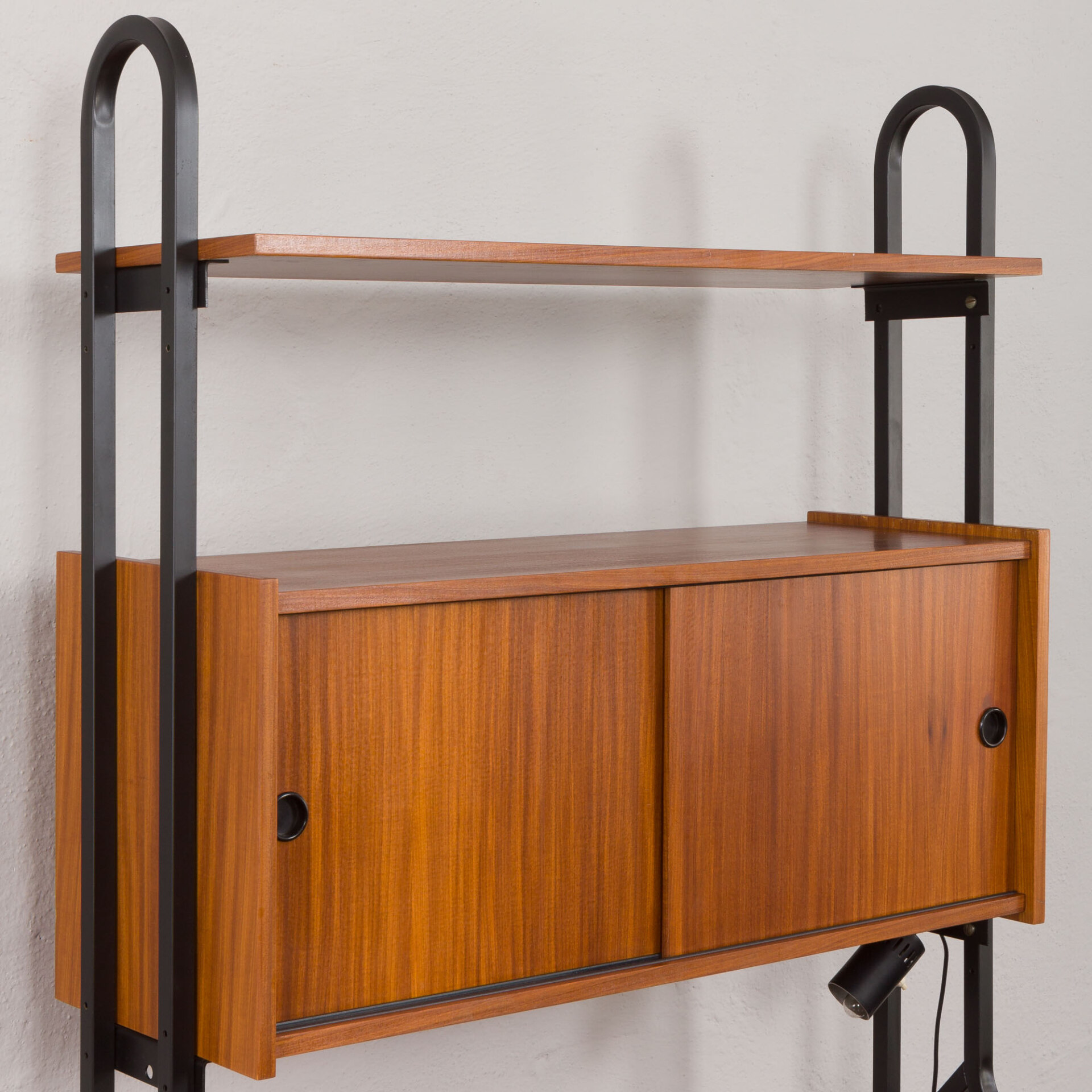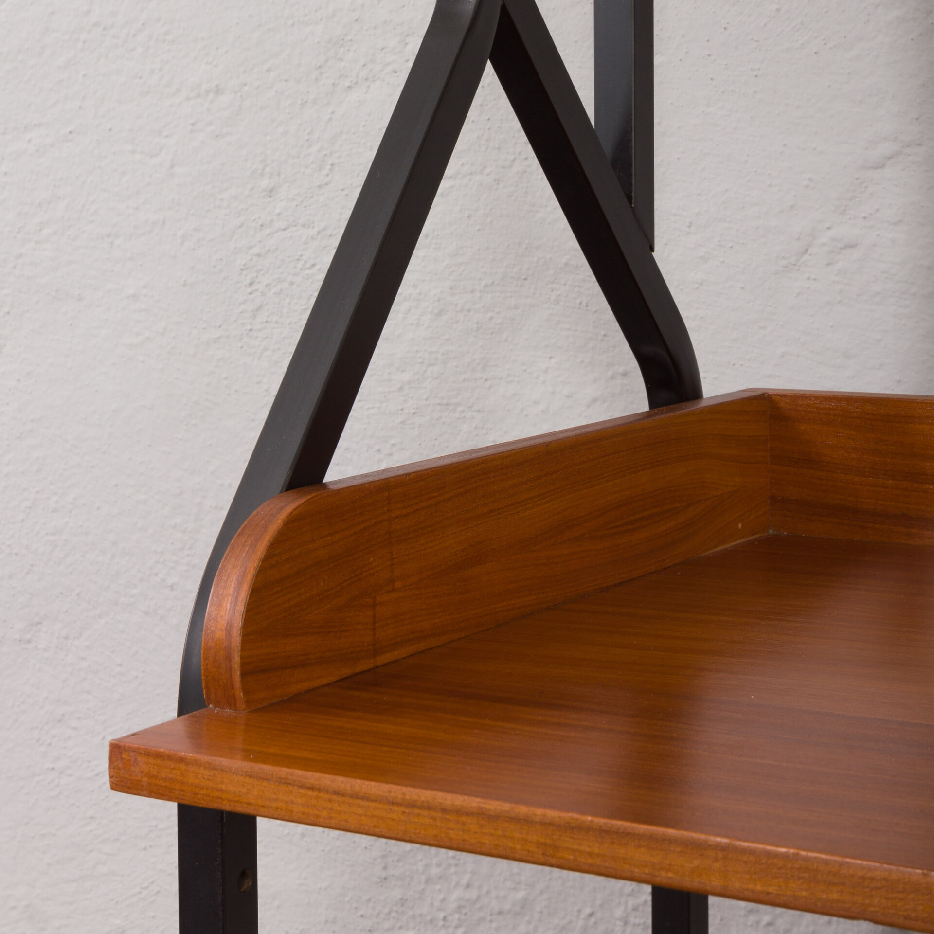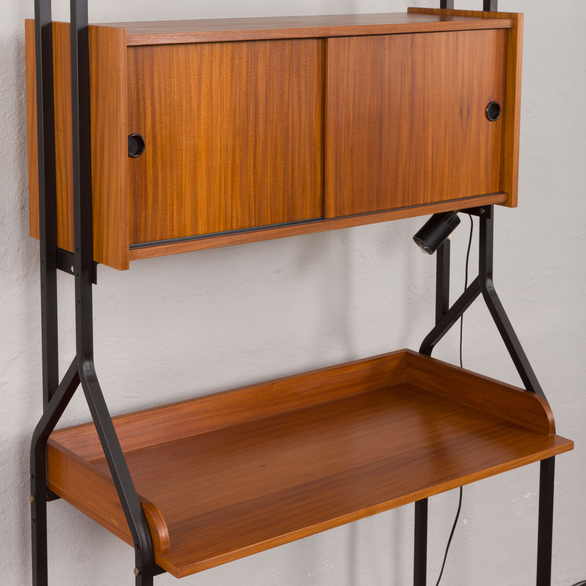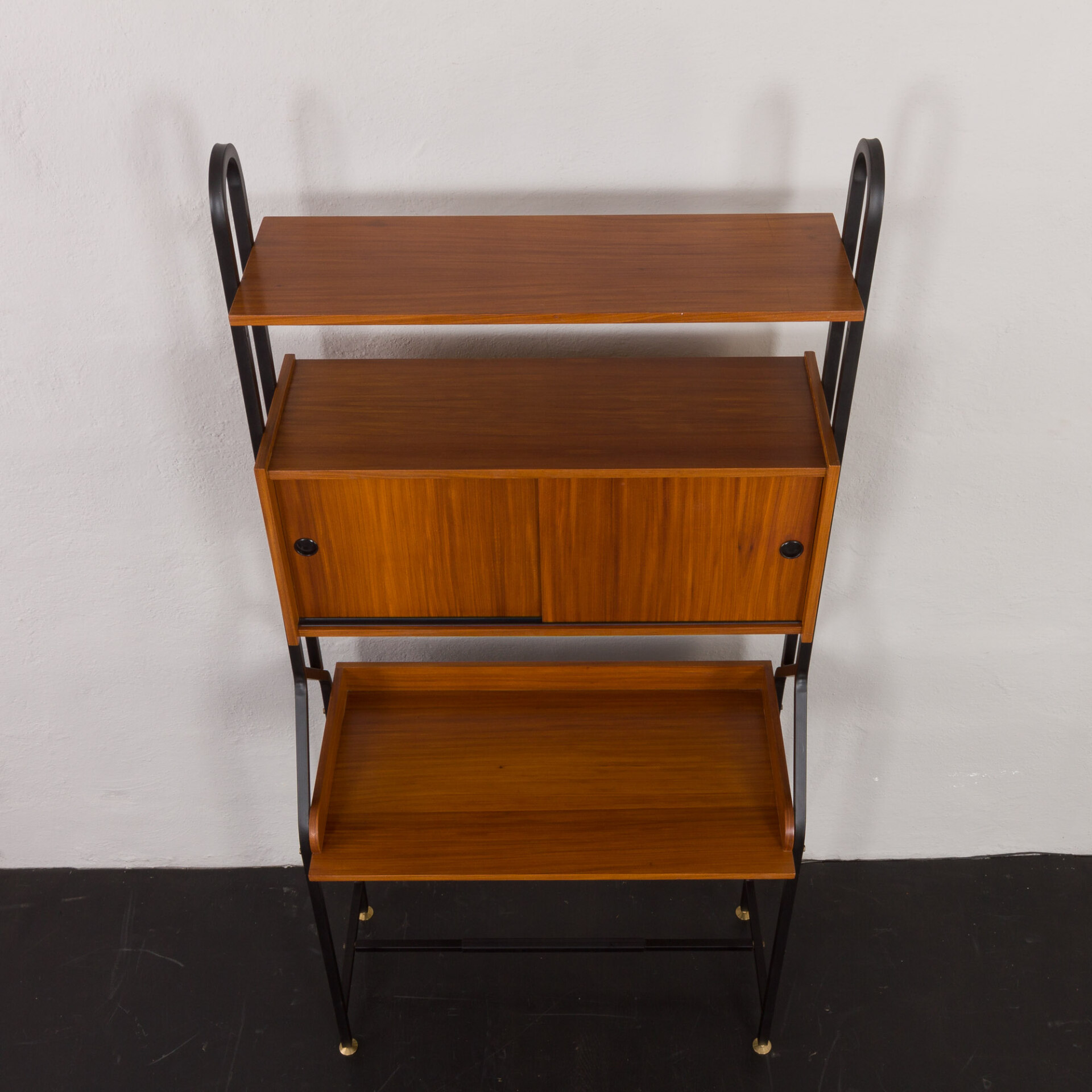 Minimalistyczny, a jednocześnie funkcjonalny włoski, wolnostojący regał vintage z epoki mid-century, swym designem nawiązuje do stylu Silvio Cavatorta z lat 60. Całość tworzy funkcjonalne miejsce do pracy na home office z dodatkową półką na książki i szafką. Biurko i dodatkowe oświetlenie załączone do zestawu pozwoli na pracę w salonie, jak i sypialni. Precyzyjnie wykonana konstrukcja, pomalowanych na czarno, metalowych wsporników tworzy efektowny kontrast wobec ciepłej, bogatej barwy forniru tekowego. Połączenie tych materiałów nie tylko doskonale oddaje charakter i styl włoskiego okresu mid-century, ale również idealnie wpasowuje się w różne style wnętrz - od współczesnych po klasyczne aranżacje. Nawet na nierównych powierzchniach regał zachowuje pełną stabilność dzięki precyzyjnie wykonanym, regulowanym nóżkom z mosiądzu, których złoty odcień nadaje mu niezwykłej elegancji i klasy.