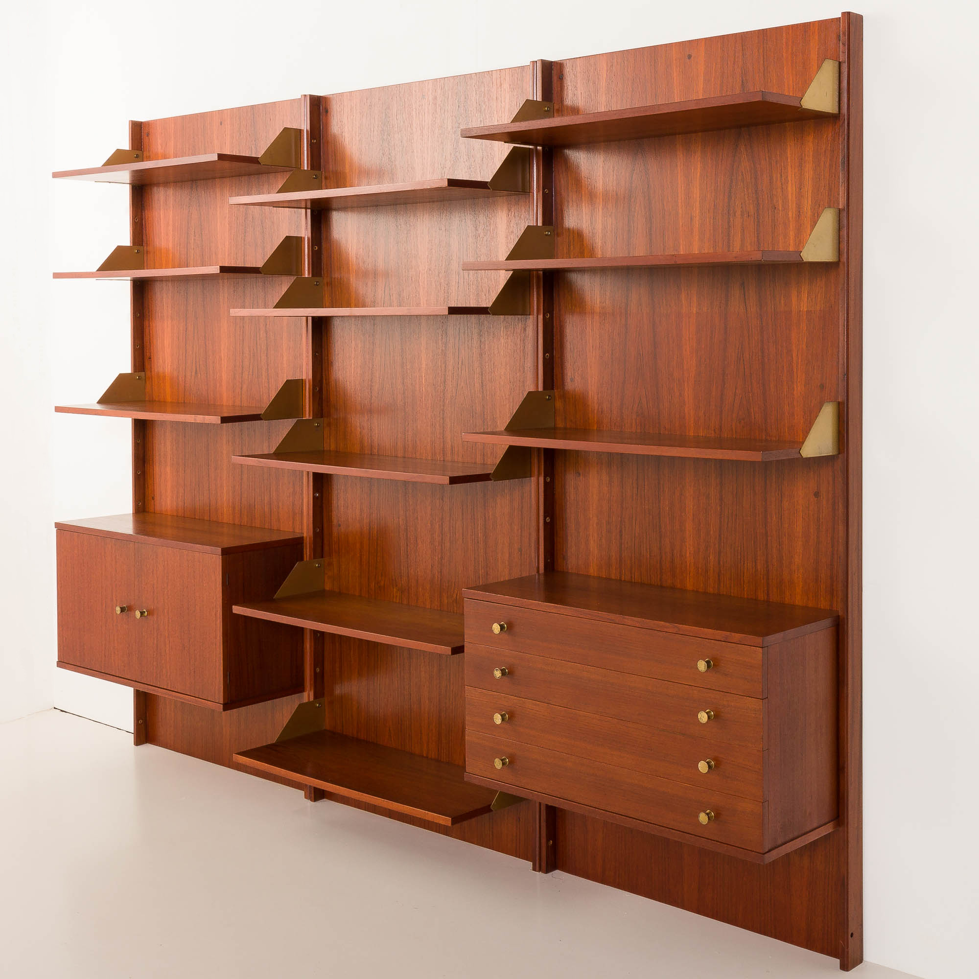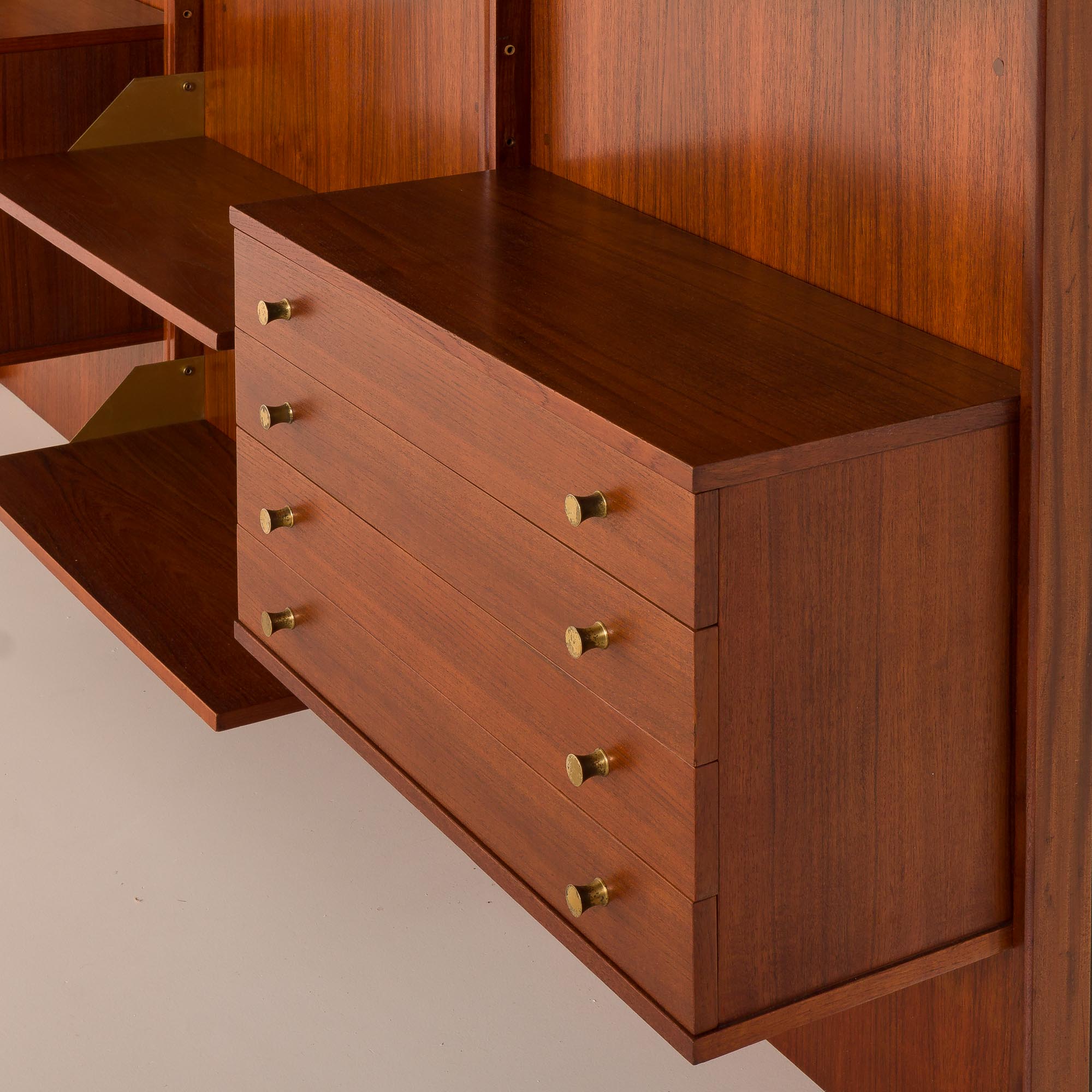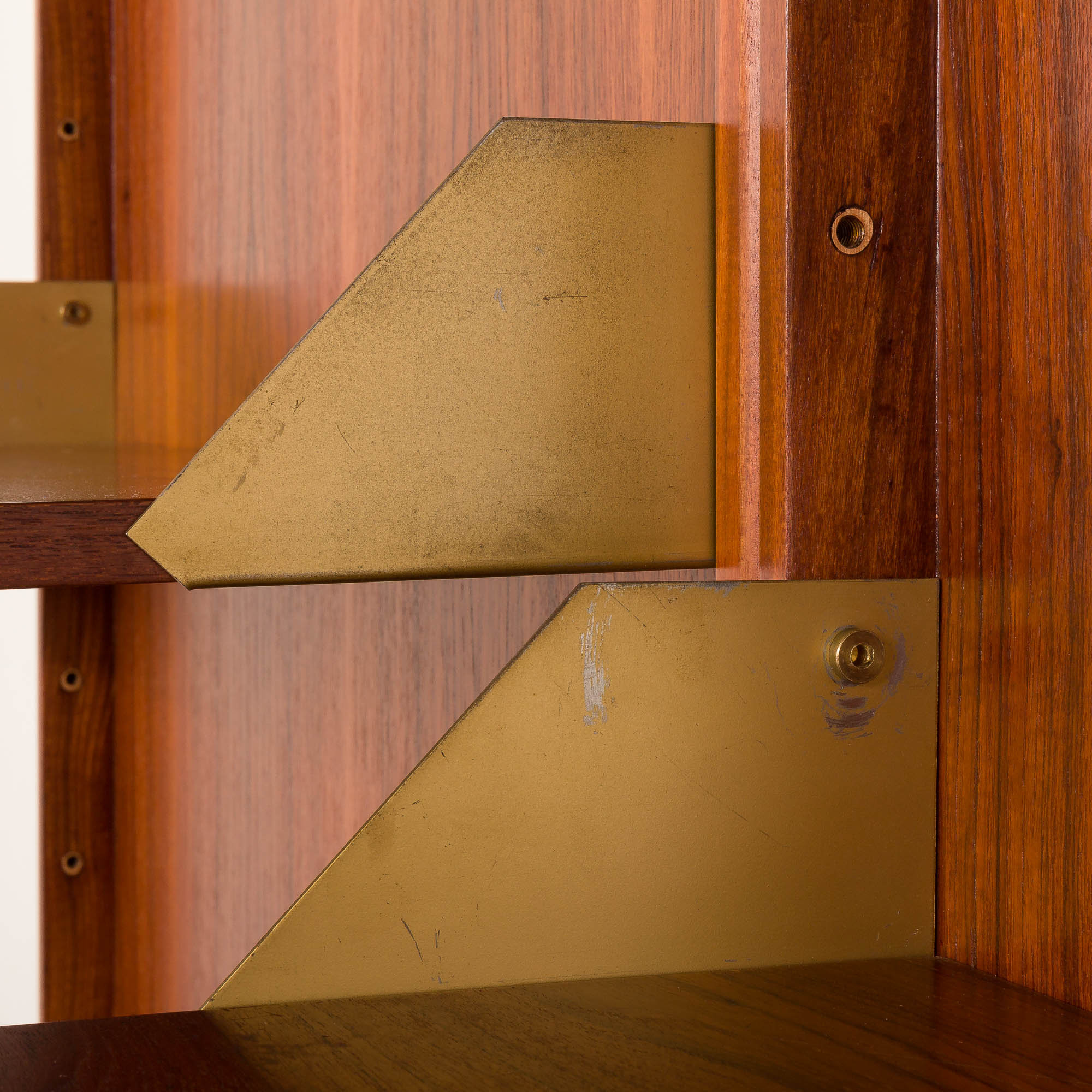 Dwie sekcje posiadają trzy półki z drewna tekowego z mosiężnymi bokami oraz szafkę poniżej – jedna z drzwiczkami na zawiasach i wewnętrzną półką, druga z czterema szufladami. Obie szafki wyposażone są w okrągłe mosiężne uchwyty, które dodają subtelnego akcentu dekoracyjnego. Trzecia sekcja składa się z pięciu otwartych półek, również wykończonych mosiężnymi bokami. Każda półka ma 31 cm głębokości, oferując dużą przestrzeń ekspozycyjną lub do przechowywania.